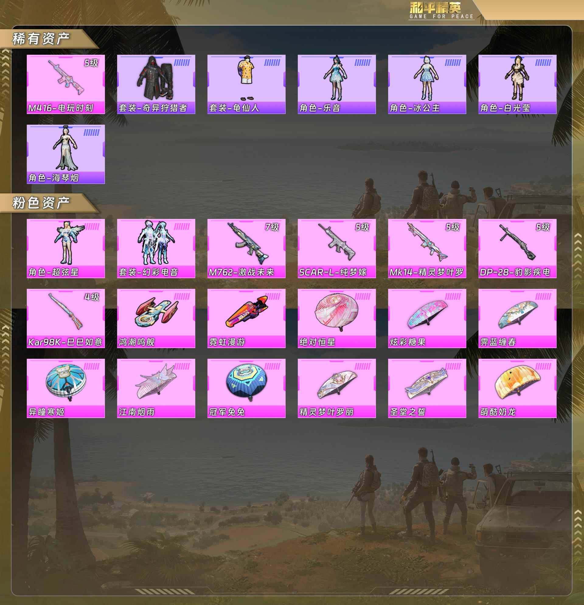 地铁满天赋-奇异狩猎者/超弦星/幻彩电音/m4电玩时刻5级/m762激战未来7级/scar纯梦嫁纱5级/mk14精灵梦叶罗丽5级(2粉套6粉呛)没战神框hp5182-2粉色飞行器-28792热力值-4王牌印记-57套装-87呛皮 【热门品类】:套装-奇异狩猎者,套装-龟仙人 【粉色套装】:角色-超弦星,粉装-幻彩电音 【粉色呛皮等级】:scar-l-纯梦嫁纱五级,m416-电玩时刻五级,m762-激战未来七级,kar98k-巳巳如意四级,mk14-精灵梦叶罗丽五级,dp-28-豹影疾电五级 【粉色呛皮】:scar-l-纯梦嫁纱,m416-电玩时刻,m762-激战未来,kar98k-巳巳如意,mk14-精灵梦叶罗丽,dp-28-豹影疾电 【粉色飞行器】:霓虹漫游飞行器 【粉色降落伞】:绝对恒星降落伞,萌酷奶龙降落伞,圣堂之誓降落伞,江南烟雨降落伞,精灵梦叶罗丽降落伞,冠军兔兔降落伞,异瞳寒姬降落伞,炫彩糖果降落伞,霁蓝缠春降落伞 【稀有套装】:套装-龟仙人,套装-雪国风尚,套装-先驱飞行员,角色-风玲,角色-海琴烟,角色-乐音,角色-碧青流霞 【稀有呛皮】:m16a4-千金淑猫,scar-l-炫彩节奏,m416-糯团青竹,groza-影袭,groza-荧海星豚,aug-天降萌叽,aug-纯梦嫁纱,q-彩虹符号,m762-天降萌叽,mk47-洛神天依,g36c-星穹咏叹调,蜜獾-天降萌叽,uzi-天降萌叽,ump45-生命誓言,ump45-极意拳锋,vect-焰鹰斗篷,vect-生命誓言,vect-音爆索尼克,汤姆逊-天降萌叽,p90-巳巳如意,kar98k-彩虹符号,kar98k-终极赛罗,awm-焰鹰斗篷,awm-鎏金朋克,awm-王牌四分卫,sks-心之恋语,mini14-绯穹魔姬,莫辛纳甘-蜜语绒猫,dbs-焰鹰斗篷,dbs-圣堂之誓,dbs-彩虹符号,m249-糯团青竹,m249-绯穹魔姬,dp-28-焰鹰斗篷,mg3-幻世战舞者,mg3-青春物语,破片手留单-巳巳如意 【其他套装】:套装-ss23特训,套装-ss24特训,套装-ss27特训,套装-ss28特训,套装-光之冒险,套装-吉莉礼服,套装-旭日情侣,套装-暗金炫舞,套装-柠萌假日,套装-活力之心,套装-海岛探路者,套装-牛气满满,套装-特战装甲,套装-王牌教练,套装-破蛋小黄鸡,套装-竞技名士,套装-绯格组合,套装-缤纷果语,套装-耀粉歌者,套装-萌黄之夏,套装-都市漫游者,套装-野性战心,套装-长空猛禽,套装-鹤鸣,套装-黑色伏地魔,套装-龟仙人,套装-漫步者,套装-奇异狩猎者,套装-焰鹰斗篷,套装-幽夜迷踪,套装-幻羽潜行,角色-冰公主,角色-白光莹,套装-纯真浪花,套装-热情海星 【稀有头盔】:深海小丑鱼头盔2级,深海小丑鱼头盔1级 【稀有背包】:幻影战神背包3级 【营地id】:930279460