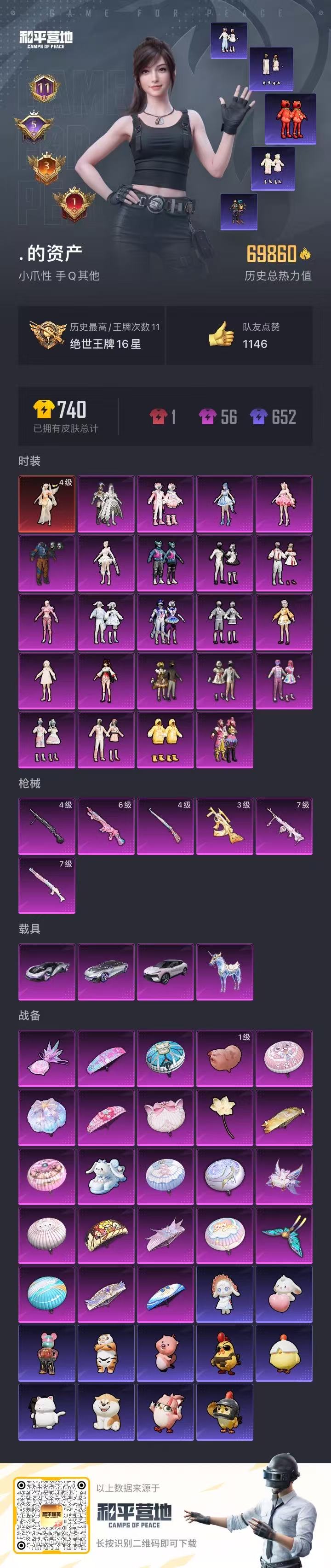 【和平精英】【txhp5336】23粉装,6特效呛,4载具,历史最高段位:绝世王牌16星 王牌印记11次 热力值:69860,151套装,167呛械,283装备,115战备;套装:精灵之光-露米娜,套装-怪诞乔克,套装-甜心巧克力,套装-宝贝奶油派,套装-天使彩虹糖,套装-缤纷油彩,套装-星空之魅,套装-冰霜白皇,套装-岚岚物语,套装-甜梦小狐,套装-冰川幽秘,套装-冰川红玫,角色-小可学妹,角色-呆萌星弥,角色-白勺歌姬,套装-第五大道,套装-萌物绒绒,套装-蜜语绒猫,套装-傲傲奶龙,角色-守护天翼,套装-bearbrick,角色-千金淑猫,角色-樱桃泡泡,角色-奇迹舞步 美琪,套装-特训学院,套装-猎鹰,套装-黑色伏地魔,套装-竞技名士,套装-猛禽,套装-长空猛禽,套装-雨林探路者,套装-浪漫假日,套装-青春校园,套装-活力之心,套装-完美偶像,套装-街头潮人,套装-蓝彩潮人,套装-神秘领域,套装-魅力单车,套装-耀眼新星,套装-坚韧舞者,套装-野性战心,套装-热血青春,套装-雪山精英,套装-暗影哥特,套装-深海小丑鱼,套装-龙魂突击队,套装-和平特警,套装-元素星魂,套装-万圣娃娃,套装-破蛋小黄鸡,套装-金鼠迎春,套装-玲珑飞花,套装-鹤鸣,套装-霓虹街区,套装-暗夜契约,套装-纯白誓言,套装-白熊同盟,套装-萌黄之夏,套装-动感兔斯基人偶服,套装-战术大师,套装-曼妙人鱼,套装-热情海星,套装-纯真浪花,套装-兔兔白日梦,套装-恶魔喵喵,套装-红熊茄茄,套装-轻风白浪,套装-绯格组合,套装-ss23特训,套装-白兰地假日,套装-甜梦熊熊,套装-神气柴柴,套装-懵萌河马,套装-糯粉咩咩,套装-王牌教练,套装-柠萌假日,套装-青玉碎影,套装-ss24特训,套装-软软马卡龙,套装-龟仙人,套装-涂山之恋,套装-ss25特训,套装-惊鸿侠骨,套装-锦衣飞扬,套装-双彩绵绵,套装-香桃花海,套装-龙的传人,套装-冰河战士,套装-ss26特训,套装-快闪甜心,套装-春光漫游,套装-空岛之星,套装-无暇誓言,套装-明鸳圣池,套装-童真绒兔,套装-萌趣绒叽,套装-贝斯之夜,套装-焰鹰斗篷,套装-幽夜迷踪,套装-幻羽潜行,套装-ss27特训,套装-老实芭蕉,套装-ss28特训,角色-湖雨初晴,套装暗影刺翼,角色-迎夏光舞,套装-奶油梦幻熊,套装-街头风暴,套装-海盐绵绵冰,套装-航行童话,套装-蝶变,套装-小熊娃娃,套装-ss29特训,套装-雏菊兔兔,角色-狂花道·娜可露露,套装-萝兰蝴蝶,角色-绯色魅影,角色-蜜桃派对,角色-都市丽猫,套装-星途旅人,角色-糖霜甜心,套装-焰舞炽心,套装-ss30特训,套装-青团波波,套装-棉花软糖,套装-暗夜风云,套装-糖糖葫芦,套装-蓝调潮影,套装-纯白跃动,套装-绒兔团圆,套装-绒宝小鹅,套装-ss31特训,套装-鱼渊荷华,套装-石蕴玉辉,套装-燕燕于飞,套装-晶辉守护,套装-ss33特训,套装-巳巳如意,套装-ss32特训,套装-炫彩糖果,套装-蓝海鲸歌,套装-ss34特训,套装-朱霞炽焰,套装-凌霄紫焰,套装-薄荷星砂,套装-ss35特训,套装-粉黛兰香,套装-ss36特训,套装-雪国风尚,套装-萌鸡速递;呛皮:蜜獾-天降萌叽,蜜獾-糖糖葫芦,蜜獾-乌木金纹,arx-凌霄紫焰,3级groza-精灵之光,groza-懵萌河马,groza-奶油梦幻熊,groza-海盐豹豹,groza-荧海星豚,m762-甜心宝贝,m762-天降萌叽,m762-萌物绒绒,m762-雏菊兔兔,scar-l-红色方程式,scar-l-甜蜜誓约,scar-l-炫彩节奏,scar-l-星途旅人,scar-l-海盐豹豹,aug-耀粉歌者,aug-天降萌叽,aug-冰晶雪宝,m16a4-蓝色火焰,m16a4-冰河战士,m16a4-千金淑猫,akm-破晓战魂,akm-龙的传人,akm-江南烟雨,ac-val-乌木金纹,ac-val-快闪甜心,q-萌萌彩虹球,q-纯真浪花,q-绒兔团圆,m416-蓝色火焰,m416-红色方程式,m416-糯团青竹,g36c-懵萌河马,m24-仲夏莫吉托,m24-樱桃泡泡,m200-仲夏莫吉托,m200-惊鸿侠骨,m200-乌木金纹,莫辛纳甘-乌木金纹,莫辛纳甘-懵萌河马,莫辛纳甘-蜜语绒猫,4级kar98k-巳巳如意,kar98k-彩虹符号,kar98k-顶峰精英,win94-拳皇·狂花道,win94-晶梦幻蝶,win94-乌木金纹,awm-焰鹰斗篷,awm-纯真浪花,amr-白勺歌姬,amr-乌木金纹,mini14-春暖花开,mini14-涂山之恋,mini14-香桃花海,mini14-雏菊兔兔,6级mk14-樱桃泡泡,mk14-童趣迷兔,mk14-冰河战士,mk14-紫晶流影,mk20-h-快闪甜心,mk20-h-星途旅人,mk20-h-樱桃泡泡,mk20-h-糖糖葫芦,mk20-h-狂鲨锋刃,mk20-h-乌木金纹,slr-金丰海韵,qbu-飒粉甜心,vss-香桃花海,mk12-乌木金纹,m417-惊鸿侠骨,mp5k-甜蜜誓约,mp5k-乌木金纹,vect-焰鹰斗篷,vect-燕燕于飞,p90-快闪甜心,p90-玩趣呆呆,p90-精灵之光,p90-乌木金纹,uzi-冰河战士,uzi-啾咪啾咪,uzi-炫彩糖果,ump45-仲夏莫吉托,ump45-涂山之恋,ump45-糖糖葫芦,汤姆逊-天降萌叽,汤姆逊-纯真浪花,汤姆逊-樱桃泡泡,野牛-奶油梦幻熊,野牛-雏菊兔兔,野牛-燕燕于飞,aks-74u-乌木金纹,js9-凌霄紫焰,s12k-童趣迷兔,s12k-玩趣呆呆,s12k-夜幕颂歌,s12k-守护天翼,aa12-g-纯真浪花,aa12-g-精灵之光,aa12-g-绒兔团圆,s686-白勺歌姬,s686-蜜语绒猫,dbs-彩虹符号,dbs-圣堂之誓,dbs-焰鹰斗篷,dbs-巴啦啦小魔仙,dbs-乌木金纹,7级spas-12-蜜语绒猫,spas-12-燕燕于飞,spas-12-狂鲨锋刃,spas-12-乌木金纹,mg3-甜梦小狐,mg3-乌木金纹,mg3-惊鸿侠骨,4级dp-28-豹影疾电,dp-28-甜心宝贝,dp-28-焰鹰斗篷,mg-36-凌霄紫焰,m249-彩虹符号,m249-糯团青竹,m249-莲影清波,m249-萌萌彩虹球,7级pkm-江南烟雨,pkm-懵萌河马,pkm-蜜语绒猫,pkm-啾咪啾咪,r1895-雏菊兔兔,p18c-bearbrick,p18c-糖糖葫芦,信号呛-异瞳寒姬,p92-凌霄紫焰,r45-拳皇·狂花道,蝎式手呛-奶油梦幻熊,蝎式手呛-千金淑猫,蝎式手呛-燕燕于飞,沙墨之鹦-快闪甜心,沙墨之鹦-未来领航者,tmp-9-江南烟雨,平底锅-甜心宝贝,平底锅-懵萌河马,平底锅-惊鸿