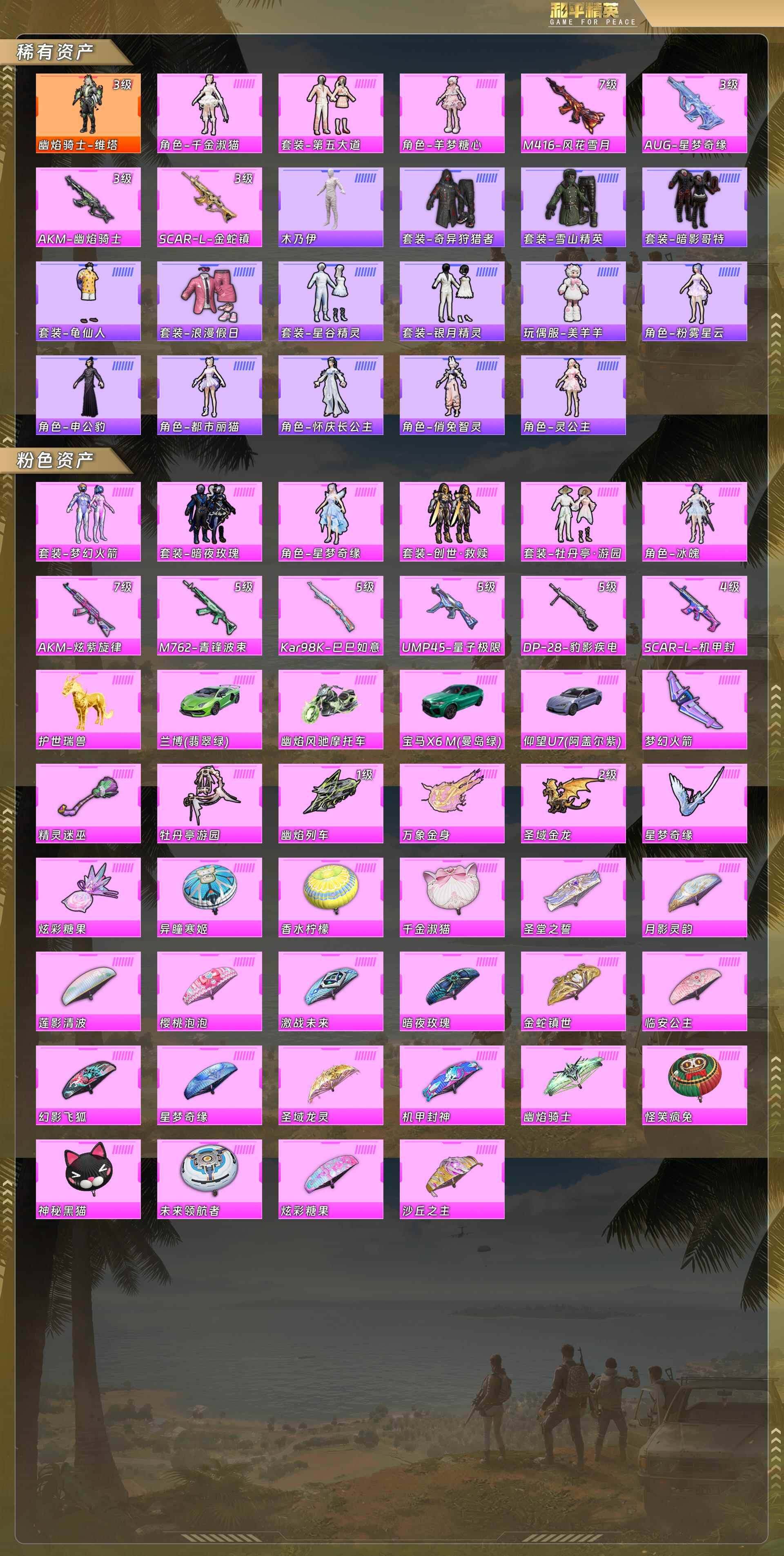 素材号/粉熊背包/维塔3级/千金淑猫/第五大道/羊梦糖心/木乃伊/奇异狩猎者/红眼罩/粉雾星云/银月精灵/星谷精灵/梦幻火箭/暗夜玫瑰/星梦奇缘/创世救赎/牡丹亭.游园/冰魄/m416风花雪月7级/aug星梦奇缘3级/ak幽焰骑士3级/scar金蛇3级/ak炫紫旋律7级/m762锋波/护世瑞兽/兰博/幽焰驰摩托车/宝马x6m/仰望u7 没战神框(1神装-9粉装-10粉呛-5载具)hp5211-8粉色飞行器-98459热力值-17王牌印记-207套装-275呛皮 【红色神装等级】:幽焰骑士-维塔三级 【红色角色神装】:幽焰骑士-维塔 【热门品类】:粉装-梦幻火箭,套装-冥河战士,套装-小丑鱼,套装-奇异狩猎者,套装-龟仙人,套装-暗影哥特 【粉色套装】:粉装-梦幻火箭,粉装-暗夜玫瑰,粉装-第五大道,套装-创世·救赎,角色-星梦奇缘,角色-千金淑猫,粉装-牡丹亭·游园,角色-冰魄,角色-羊梦糖心 【粉色呛皮等级】:akm-炫紫旋律七级,akm-幽焰骑士三级,scar-l-机甲封神四级,scar-l-金蛇镇世三级,m416-风花雪月七级,aug-星梦奇缘三级,m762-青锋波束五级,ump45-量子极限五级,kar98k-巳巳如意五级,dp-28-豹影疾电五级 【粉色载具】:兰博基尼aventad svj(翡翠绿),仰望u7(阿盖尔紫),宝马x6 m(曼岛绿),幽焰风驰摩托车,护世瑞兽 【粉色呛皮】:akm-炫紫旋律,akm-幽焰骑士,scar-l-机甲封神,scar-l-金蛇镇世,m416-风花雪月,aug-星梦奇缘,m762-青锋波束,ump45-量子极限,kar98k-巳巳如意,dp-28-豹影疾电 【粉色飞行器】:精灵迷巫飞行器,梦幻火箭飞行器,星梦奇缘飞行器,幽焰列车飞行器,万象金身飞行器,圣域金龙飞行器 【粉色降落伞】:神秘黑猫降落伞,激战未来降落伞,香水柠檬降落伞,怪笑疯兔降落伞,机甲封神降落伞,暗夜玫瑰降落伞,莲影清波降落伞,圣堂之誓降落伞,沙丘之主降落伞,星梦奇缘降落伞,未来领航者降落伞,幽焰骑士降落伞,千金淑猫降落伞,临安公主降落伞,月影灵韵降落伞,金蛇镇世降落伞,幻影飞狐降落伞,樱桃泡泡降落伞,圣域龙灵降落伞,异瞳寒姬降落伞,炫彩糖果降落伞 【稀有套装】:套装-龟仙人,套装-巳巳如意,套装-暖暖向日葵,套装-超能元气,套装-雪国风尚,套装-雏菊兔兔,套装-萝兰蝴蝶,套装-小熊娃娃,套装-先驱飞行员,套装-糖糖葫芦,套装-青团波波,套装-棉花软糖,角色-都市丽猫,角色-怀庆长公主,角色-俏兔智灵,套装-燕燕于飞,套装-鱼渊荷华,套装-镭金极速,套装-焰舞炽心,套装-粉恋花,套装-紫幽梦,套装-蓝冰羽,角色-瑰梦爱神,套装-彩虹兔,套装-云朵鹅,套装-雪绒豹,角色-灵公主,套装-朱霞炽焰,套装-凌霄紫焰,套装-擎苍青焰,玩偶服-美羊羊,角色-申公豹,角色-绯色魅影,套装-书海巡游,套装-画境星梦,套装-琴音绮想,套装-炫彩糖果 【稀有呛皮】:aug-冰晶雪宝,akm-四圣焕新,akm-夜灯,akm-彩虹符号,akm-破晓战魂,akm-缤纷海域,akm-霓虹街区,akm-龙的传人,m16a4-冥河战士,scar-l-夏日绵绵冰,scar-l-夜灯,scar-l-炫彩节奏,scar-l-玉兔迎春,scar-l-生命誓言,m416-糯团青竹,m416-红色方程式,m416-蓝色火焰,groza-懵萌河马,groza-治愈之星,groza-黑色刀锋,aug-耀粉歌者,aug-魔法学院,aug-金蛇镇世,q-洛神天依,q-银河战甲,m762-奇异狩猎者,m762-瑞龙福将,m762-云朵鹅,m762-登顶巅峰,mk47-妙红点点,mk47-洛神天依,mk47-炫光之旅,g36c-懵萌河马,g36c-时空追击者,ac-val-快闪甜心,蜜獾-天降萌叽,ace32-画境星梦,arx-凌霄紫焰,uzi-啾咪啾咪,uzi-天降萌叽,uzi-炫彩节奏,ump45-仲夏莫吉托,ump45-夜灯,ump45-天启纪元,ump45-时空追击者,ump45-生命誓言,ump45-绒宝小鹅,vect-彩虹符号,vect-治愈之星,vect-生命誓言,vect-黑色刀锋,汤姆逊-天降萌叽,汤姆逊-环太平洋,汤姆逊-耀粉歌者,汤姆逊-银刃赛罗,汤姆逊-樱桃泡泡,mp5k-画境星梦,js9-凌霄紫焰,p90-倾城蜜语,p90-快闪甜心,p90-金蛇镇世,kar98k-古堡领主,kar98k-彩虹符号,kar98k-红色方程式,kar98k-星穹咏叹调,m24-治愈之星,m24-冰封烈焰,sks-时空追击者,sks-糯团青竹,vss-彩虹符号,vss-黑色刀锋,mini14-春暖花开,mini14-梦幻火箭,mini14-炫彩节奏,mini14-阿狸红,mini14-镭金极速,mk14-治愈之星,win94-瑞龙福将,莫辛纳甘-懵萌河马,莫辛纳甘-镭金极速,amr-妙红点点,m417-惊鸿侠骨,mk20-h-快闪甜心,mk20-h-莲影清波,m200-惊鸿侠骨,svd-云朵鹅,m1加兰德-画境星梦,mk12-金蛇镇世,s686-冰封烈焰,s686-生命誓言,s686-千金淑猫,s1897-炫彩节奏,s12k-玩趣呆呆,s12k-瑞龙福将,s12k-香水柠檬,s12k-极意拳锋,dbs-圣堂之誓,dbs-彩虹符号,dbs-时空追击者,aa12-g-画境星梦,spas-12-云朵鹅,m249-四圣焕新,m249-妙红点点,m249-彩虹符号,m249-星之彼岸,m249-糯团青竹,dp-28-清新柠檬,dp-28-甜蜜旋律,mg3-妙红点点,mg3-幻世战舞者,mg3-惊鸿侠骨,mg3-瑞龙福将,pkm-懵萌河马,mg-36-凌霄紫焰,p92-雷霆特警,p92-凌霄紫焰,p1911-冰封烈焰,r1895-镭金极速,短管霰弹-圣域龙灵,蝎式手呛-千金淑猫,沙墨之鹦-快闪甜心,沙墨之鹦-云朵鹅,tmp-9-未来歌姬,爆炸猎弓-惊鸿侠骨,大砍刀-云朵鹅,平底锅-凌霄紫焰,平底锅-画境星梦,破片手留单-巳巳如意 【其他套装】:套装-ss2特训,套装-ss3特训,套装-ss5特训,套装-ss6特训,套装-ss7特训,套装-ss8特训,套装-ss9特训,套装-ss10特训,套装-ss13特训,套装-ss14特训,套装-ss15特训,套装-ss16特训,套装-ss17特训,套装-ss18特训,套装-ss19特训,套装-ss20特训,套装-ss21特训,套装-ss22特训,套装-ss23特训,套装-ss24特训,套装-ss25特训,套装-ss26特训,套装-ss27特训,套装-ss28特训,套装-ss29特训,套装-丛林猎人,套装-传奇侦探,套装-光之冒险,套装-冰川格斗者,套装-决胜时刻,套装-冷焰舞者,套装-北国孤狼,套装-幻影