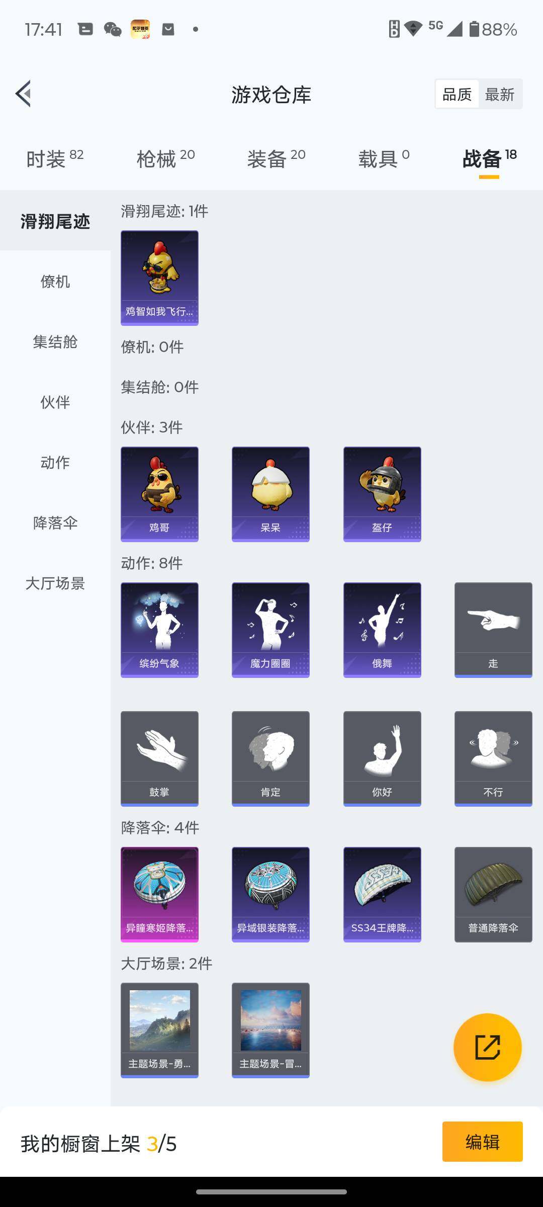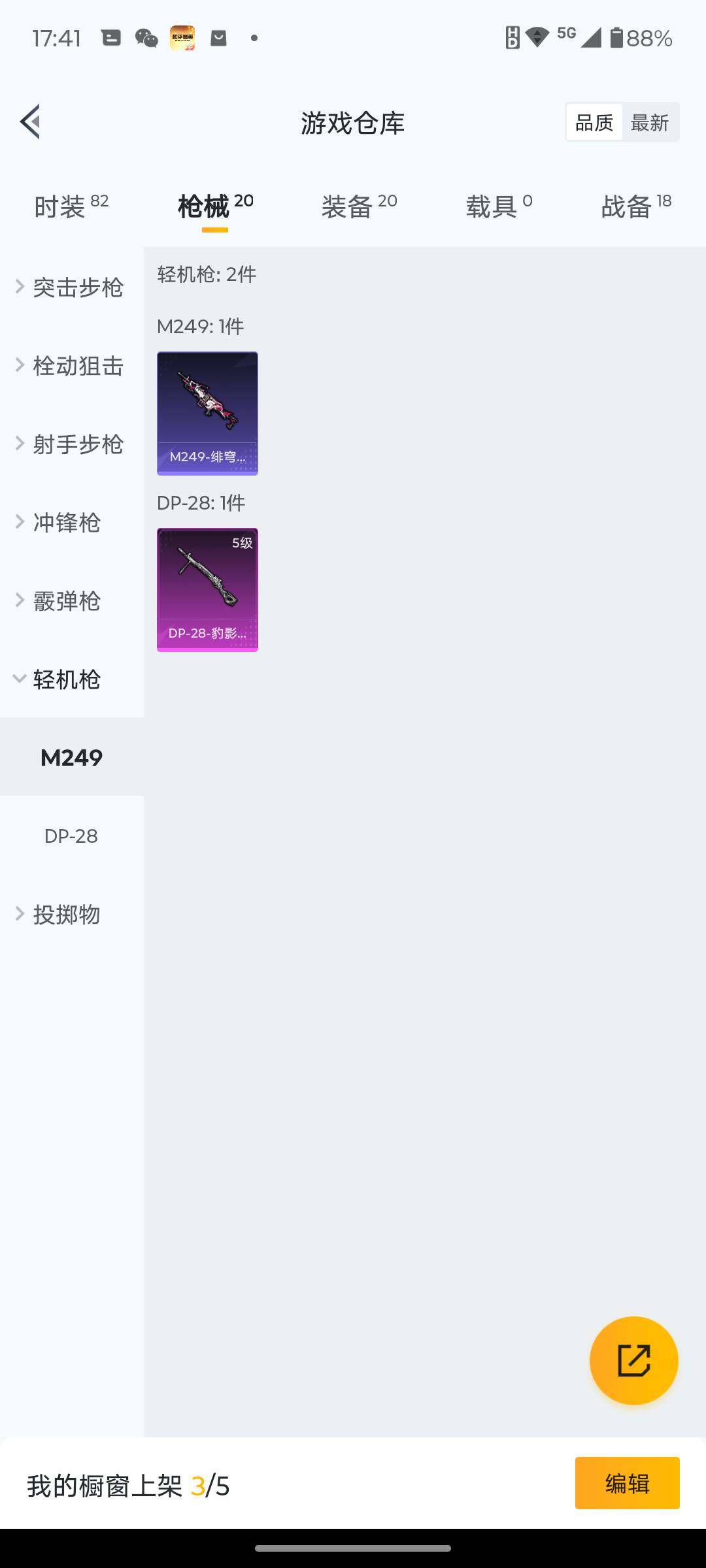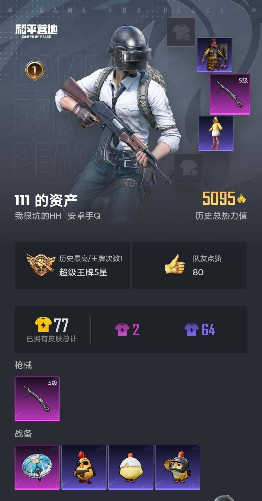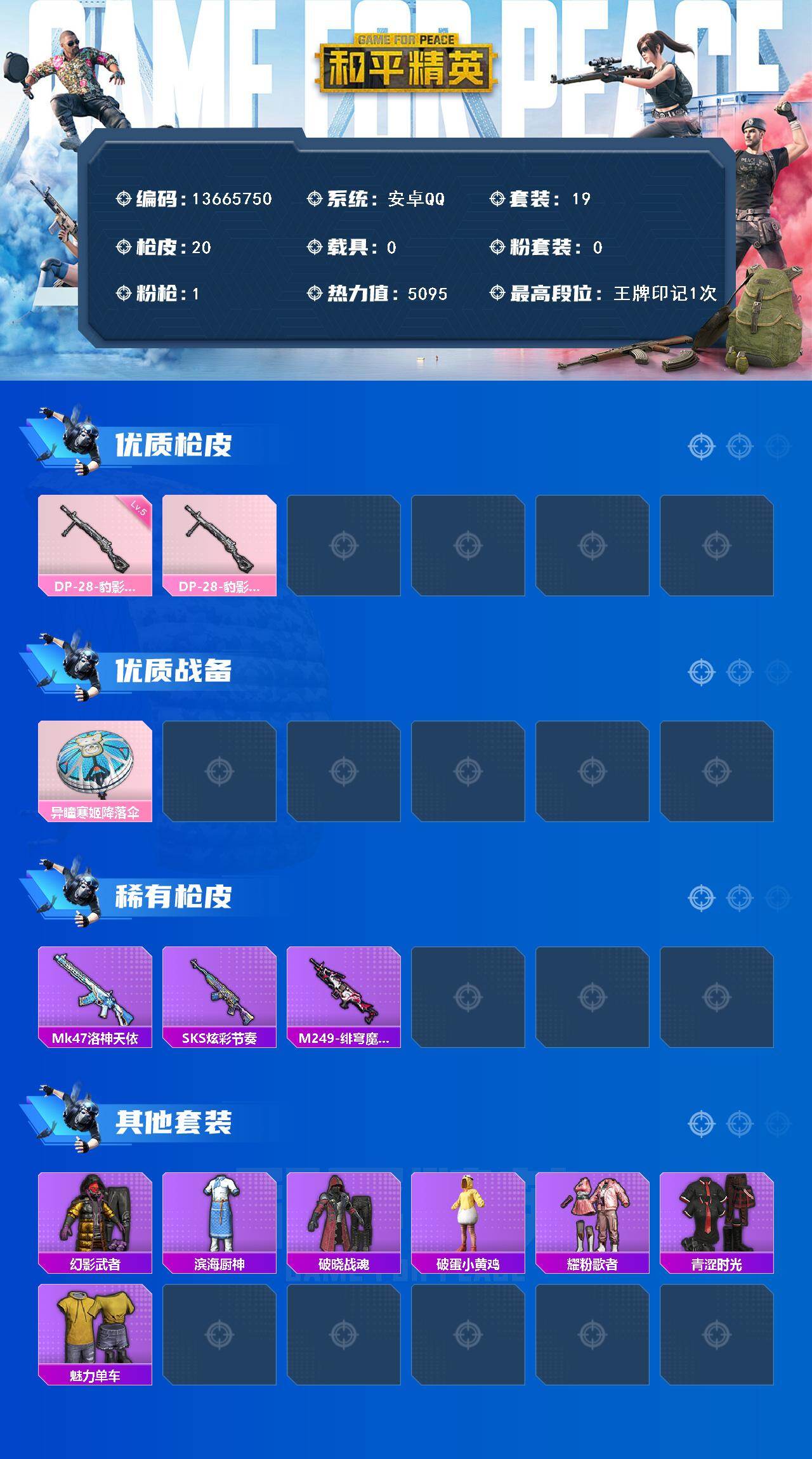 6162-1特效呛-0载具-0粉色飞行器-5095热力值-1王牌印记-19套装-20呛皮 【粉色呛皮等级】:dp-28-豹影疾电五级 【粉色呛皮】:dp-28-豹影疾电 【粉色降落伞】:异瞳寒姬降落伞 【稀有呛皮】:mk47-洛神天依,sks-炫彩节奏,m249-绯穹魔姬 【其他套装】:套装-幻影武者,套装-滨海厨神,套装-破晓战魂,套装-破蛋小黄鸡,套装-耀粉歌者,套装-青涩时光,套