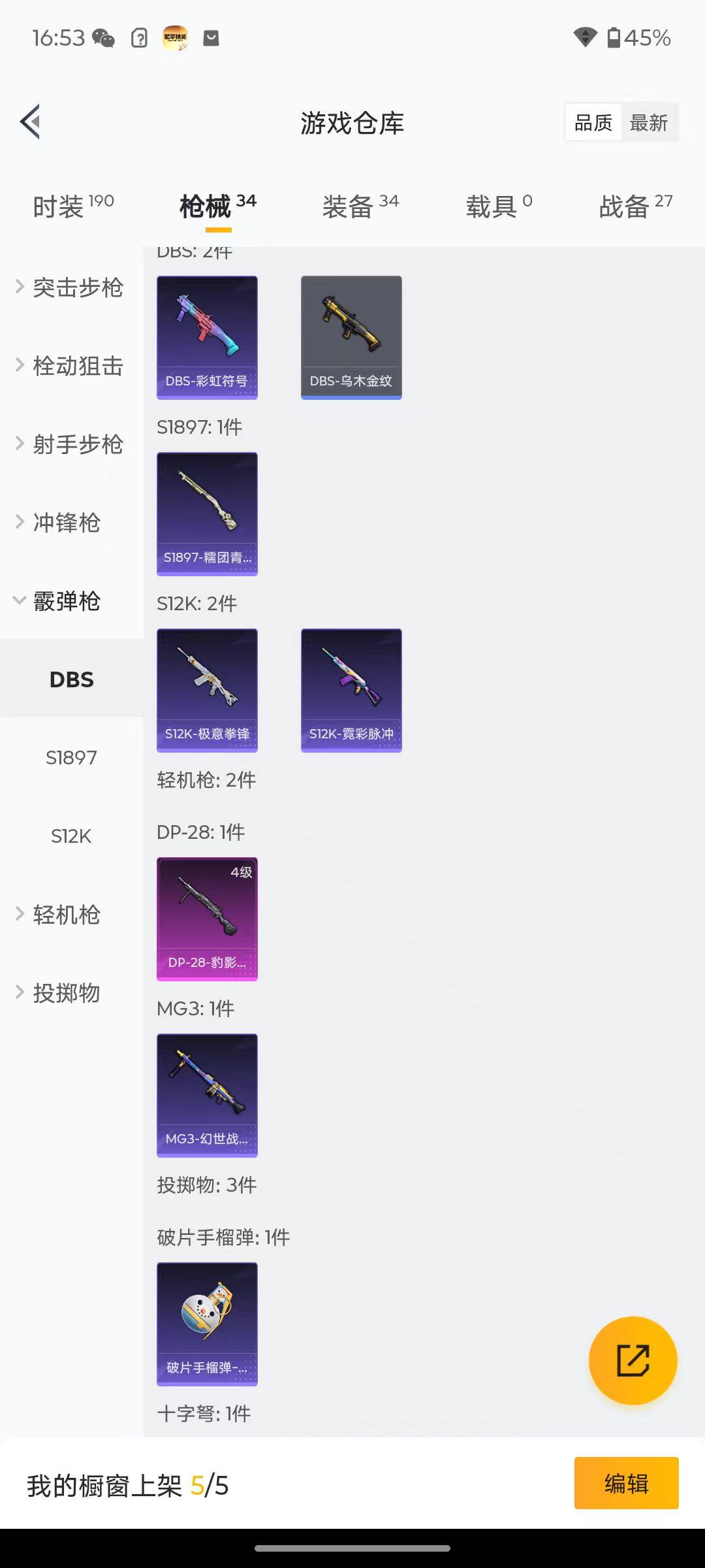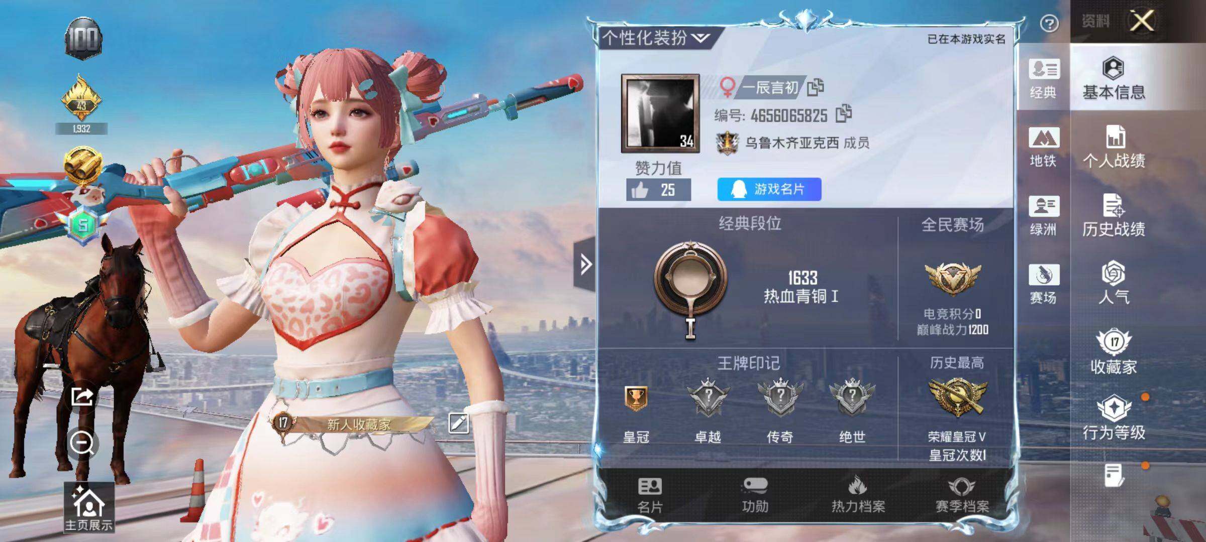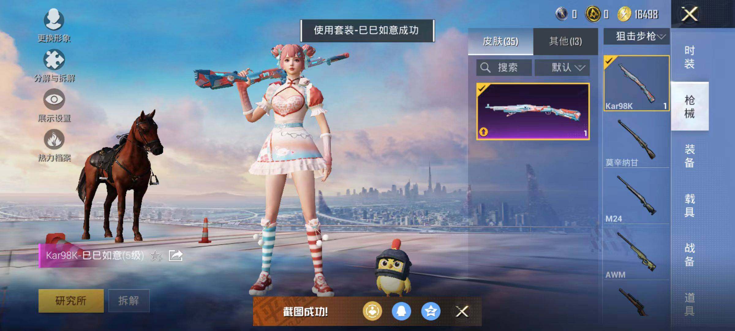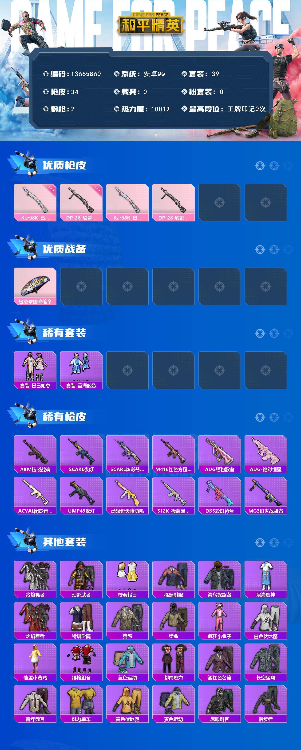 6273-0粉装-2特效呛-0载具-1粉色飞行器-10012热力值-1王牌印记-39套装-34呛皮 【粉色呛皮等级】:kar98k-巳巳如意五级,dp-28-豹影疾电四级 【粉色呛皮】:kar98k-巳巳如意,dp-28-豹影疾电 【粉色降落伞】:极意拳锋降落伞 【稀有套装】:套装-巳巳如意,套装-雪国风尚,套装-蓝海鲸歌 【稀有呛皮】:akm-破晓战魂,scar-l-夜灯,sca