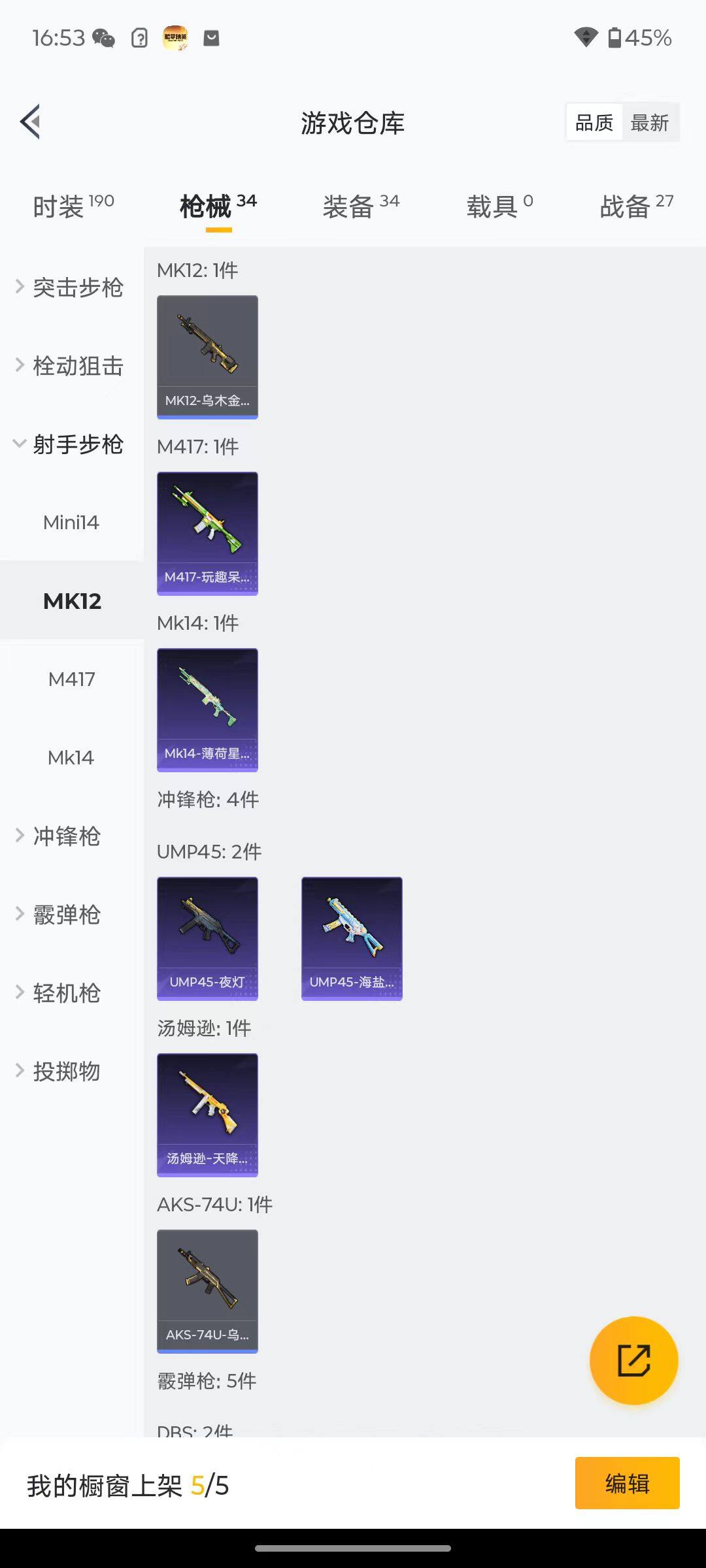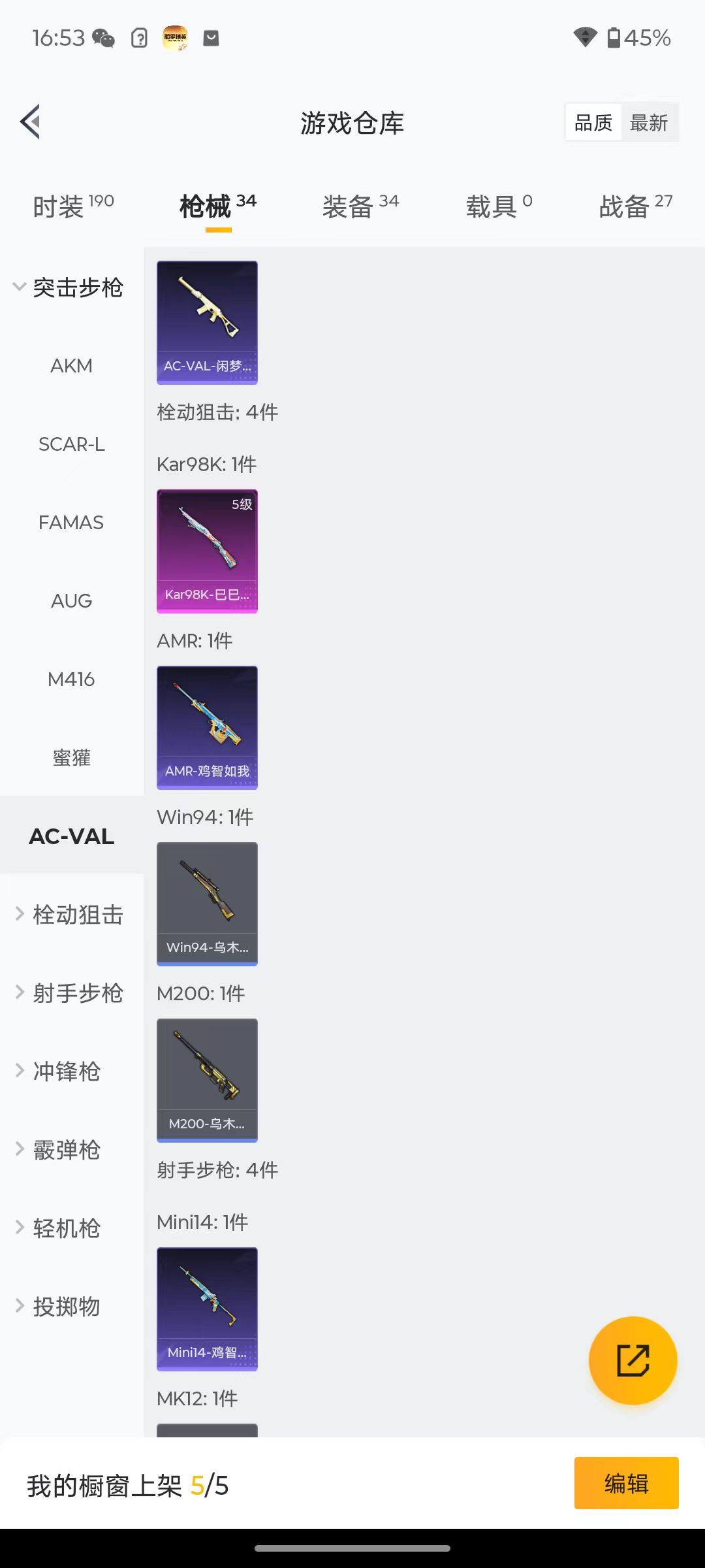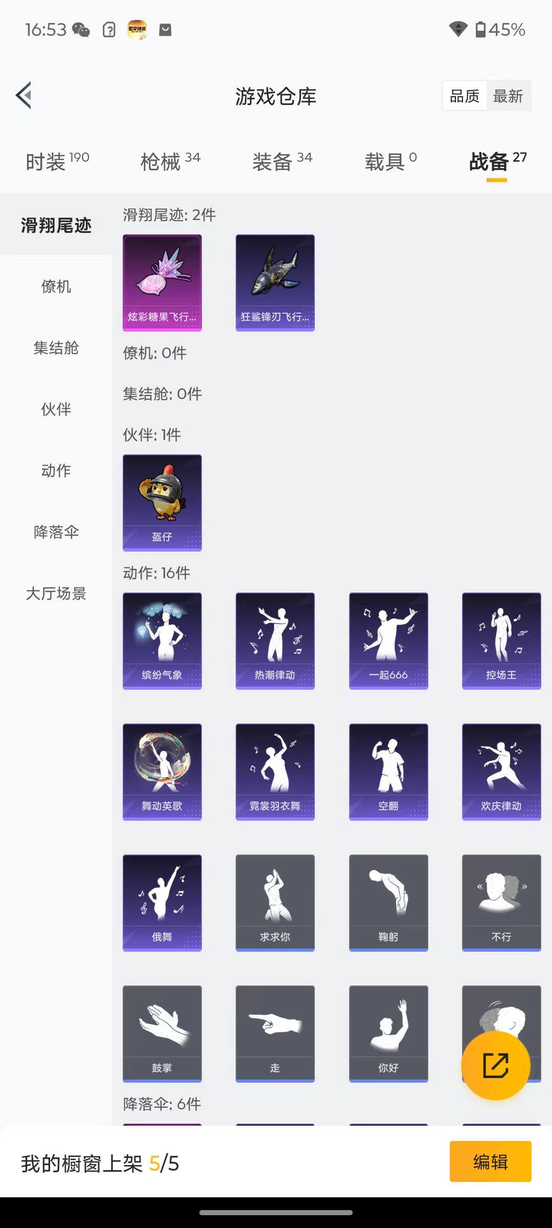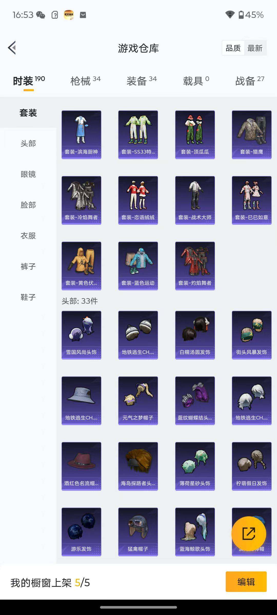 6273-0粉装-2特效呛-0载具-1粉色飞行器-10012热力值-1王牌印记-39套装-34呛皮 【粉色呛皮等级】:kar98k-巳巳如意五级,dp-28-豹影疾电四级 【粉色呛皮】:kar98k-巳巳如意,dp-28-豹影疾电 【粉色降落伞】:极意拳锋降落伞 【稀有套装】:套装-巳巳如意,套装-雪国风尚,套装-蓝海鲸歌 【稀有呛皮】:akm-破晓战魂,scar-l-夜灯,sca