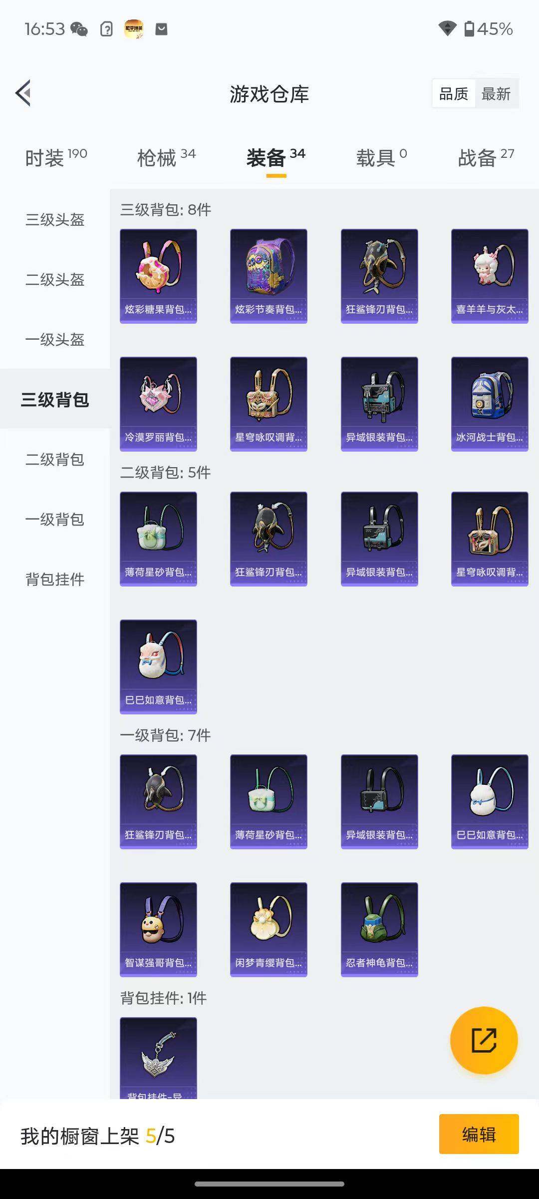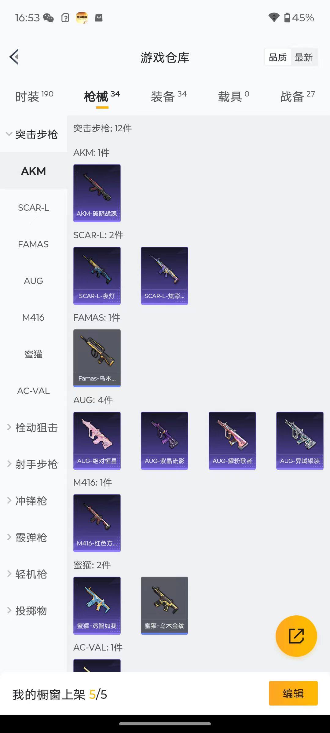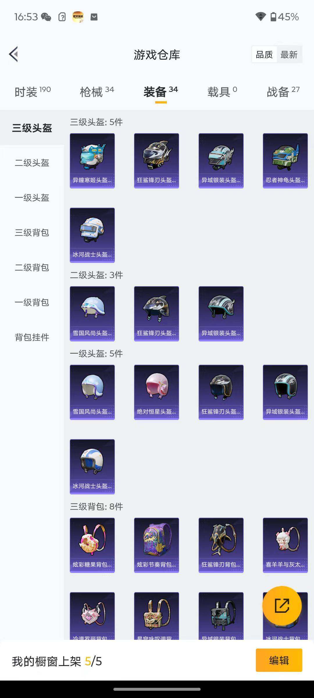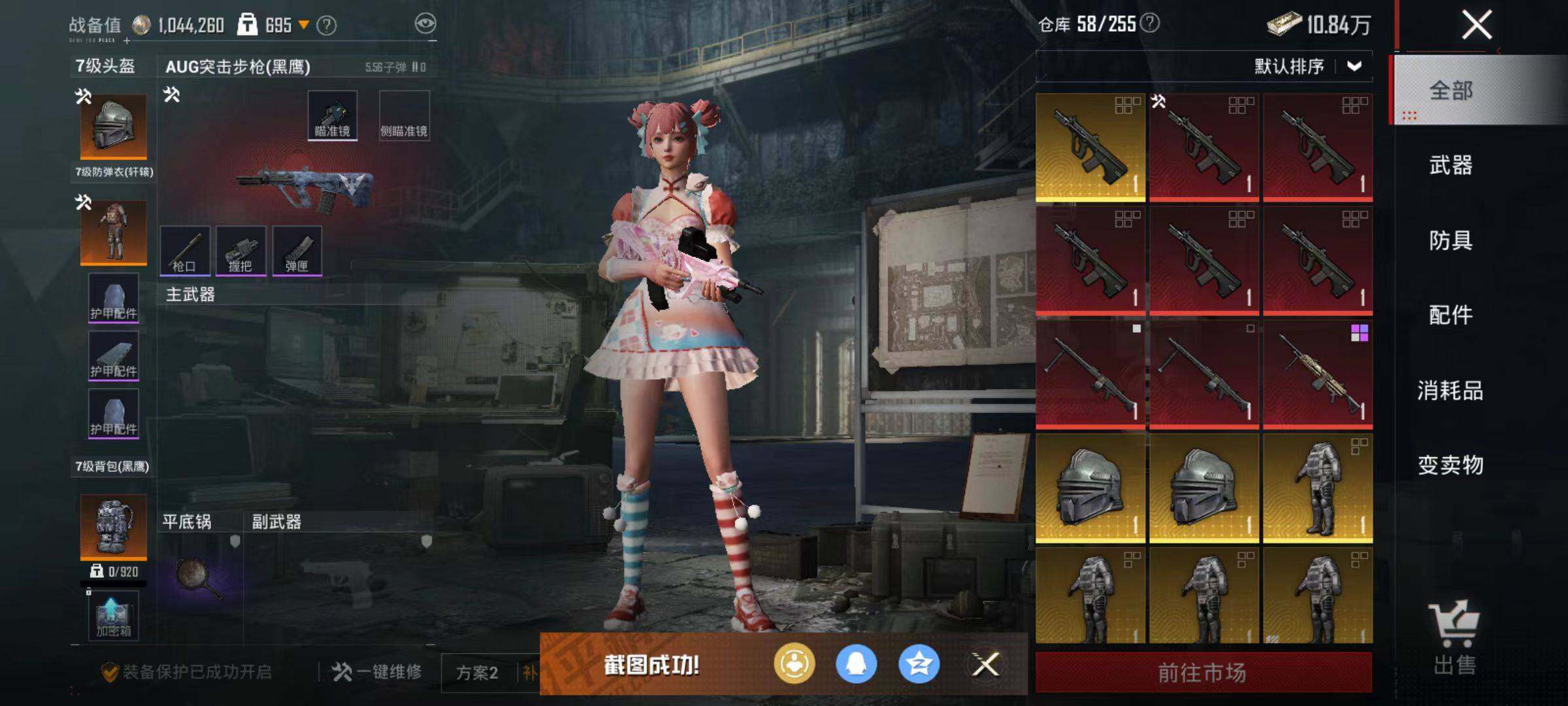 6273-0粉装-2特效呛-0载具-1粉色飞行器-10012热力值-1王牌印记-39套装-34呛皮 【粉色呛皮等级】:kar98k-巳巳如意五级,dp-28-豹影疾电四级 【粉色呛皮】:kar98k-巳巳如意,dp-28-豹影疾电 【粉色降落伞】:极意拳锋降落伞 【稀有套装】:套装-巳巳如意,套装-雪国风尚,套装-蓝海鲸歌 【稀有呛皮】:akm-破晓战魂,scar-l-夜灯,sca