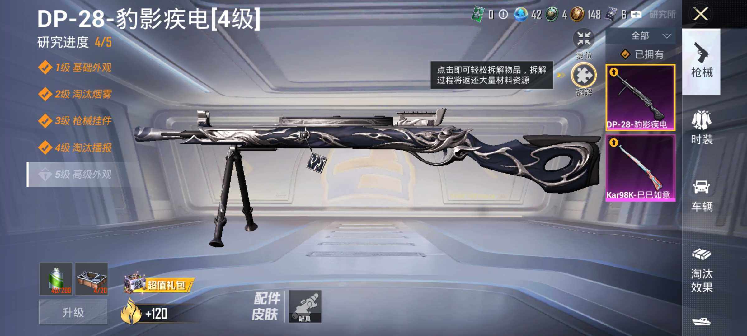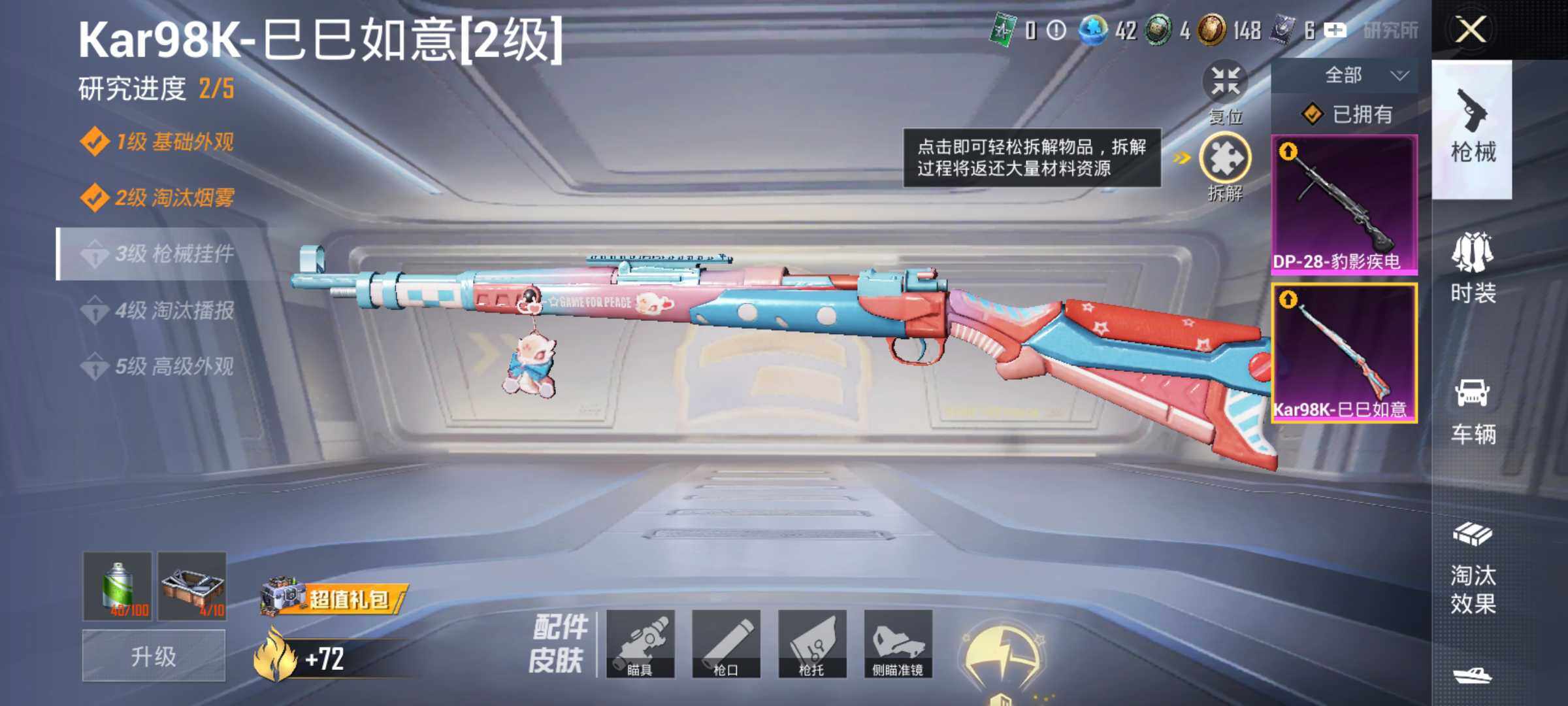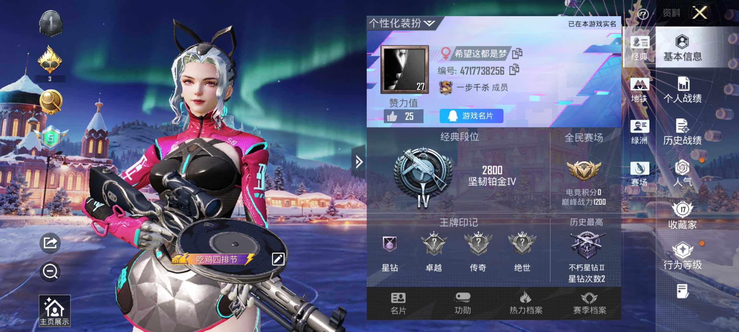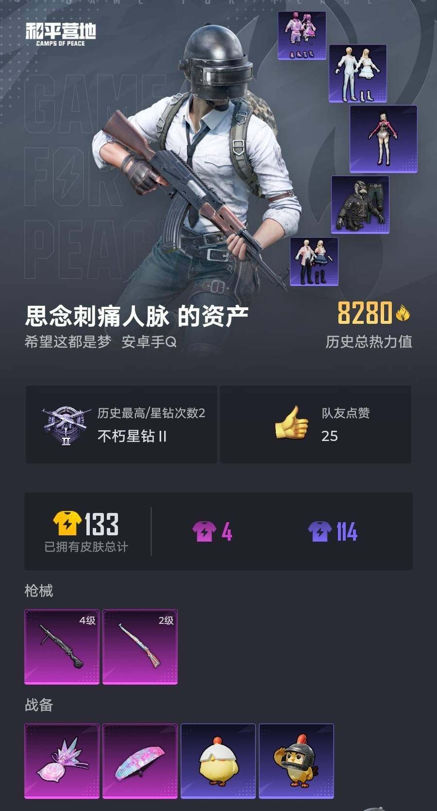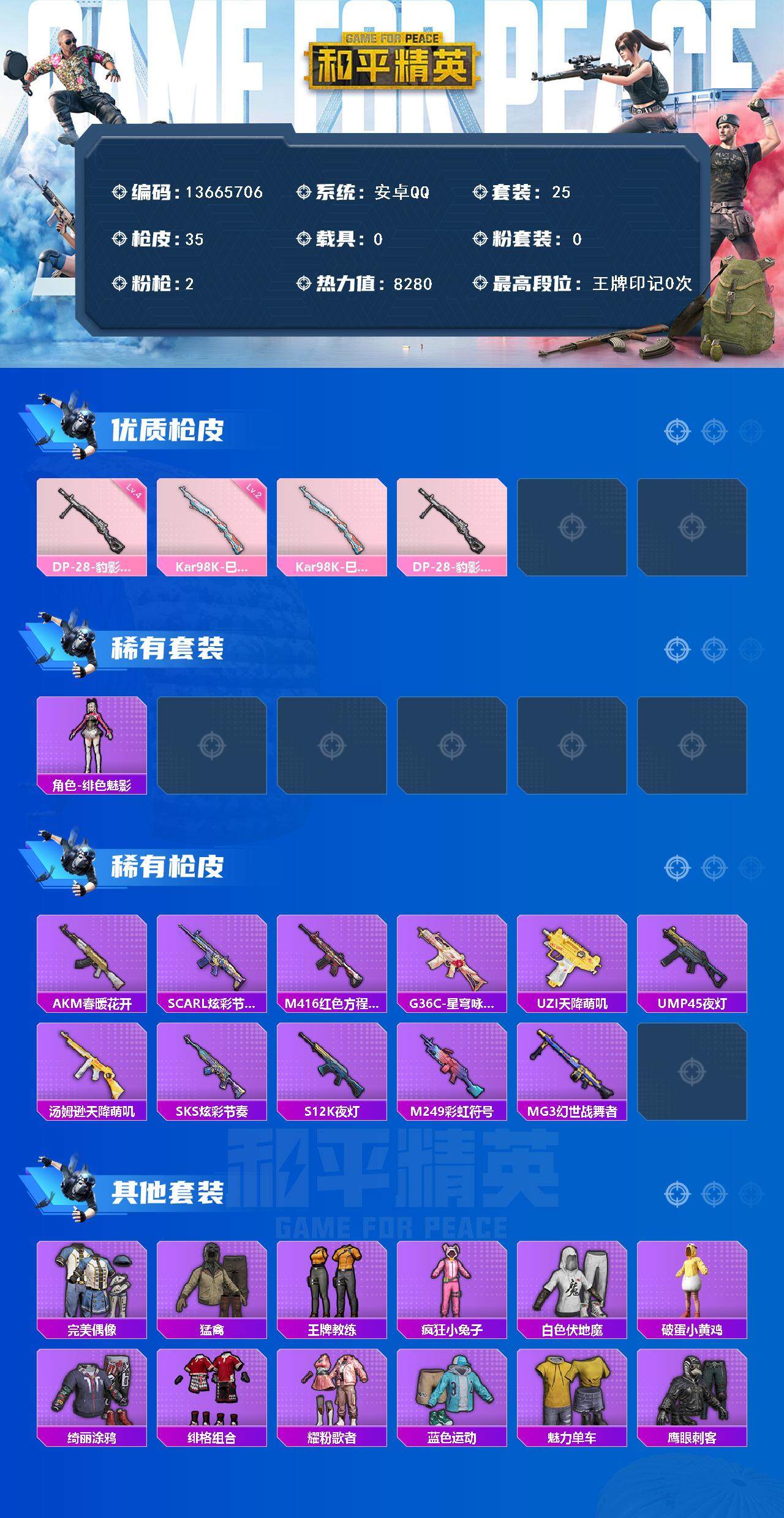 6129-2特效呛-0载具-1粉色飞行器-8280热力值-2王牌印记-25套装-35呛皮 【粉色呛皮等级】:kar98k-巳巳如意二级,dp-28-豹影疾电四级 【粉色呛皮】:kar98k-巳巳如意,dp-28-豹影疾电 【稀有套装】:角色-绯色魅影,套装-炫彩糖果 【稀有呛皮】:akm-春暖花开,scar-l-炫彩节奏,m416-红色方程式,g36c-星穹咏叹调,uzi-天降萌叽
