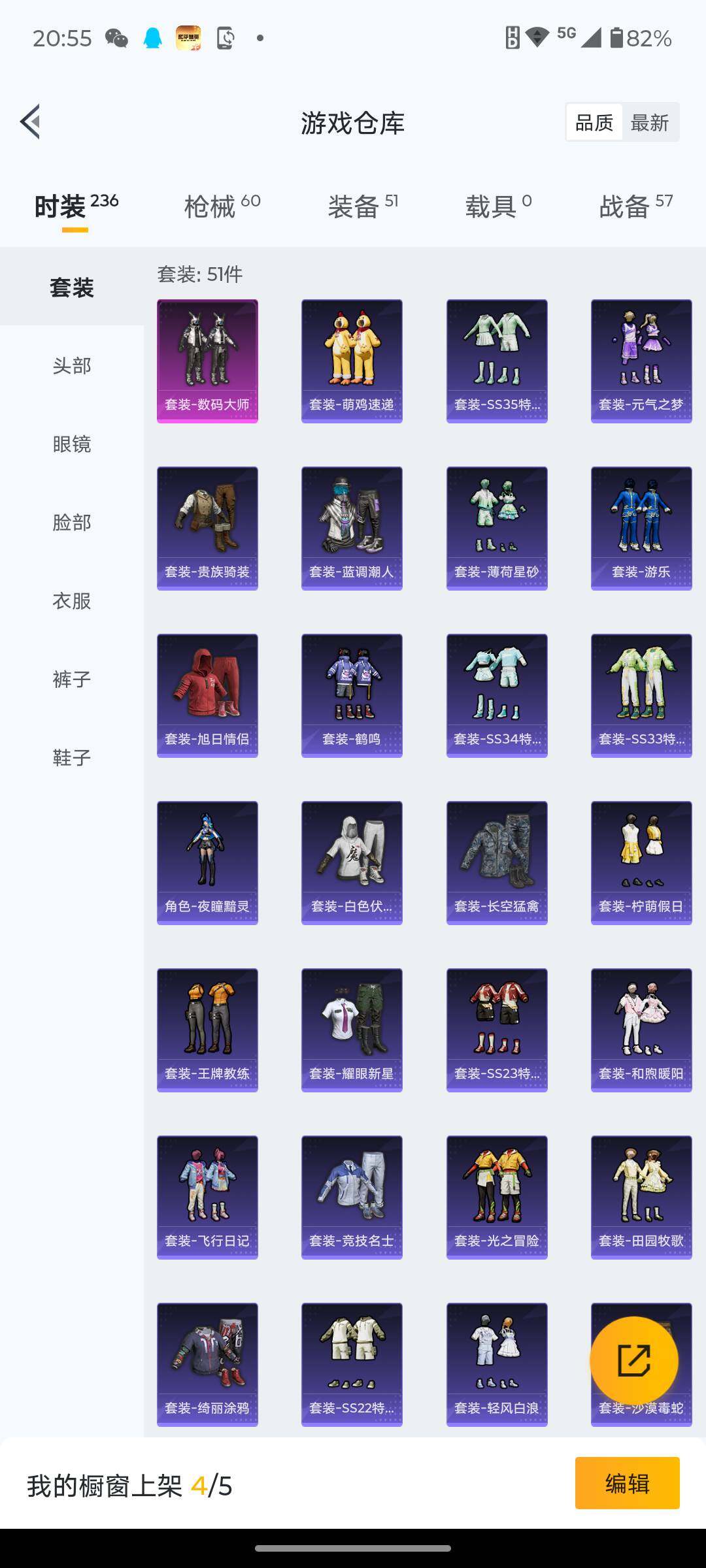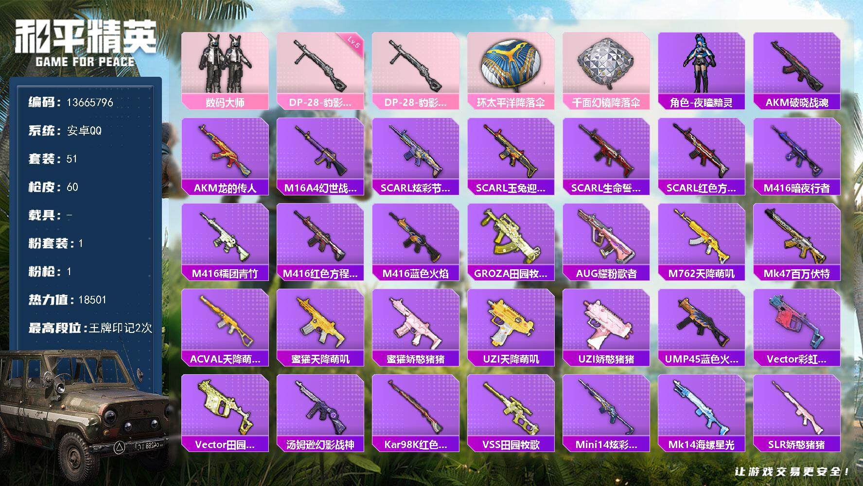 6208-1粉装-1特效呛-0载具-0粉色飞行器-18501热力值-2王牌印记-51套装-60呛皮 【粉色套装】:粉装-数码大师 【粉色呛皮等级】:dp-28-豹影疾电五级 【粉色呛皮】:dp-28-豹影疾电 【粉色降落伞】:环太平洋降落伞,千面幻镜降落伞 【稀有套装】:角色-夜瞳黯灵 【稀有呛皮】:akm-破晓战魂,akm-龙的传人,m16a4-幻世战舞者,scar-l-炫彩节奏,s