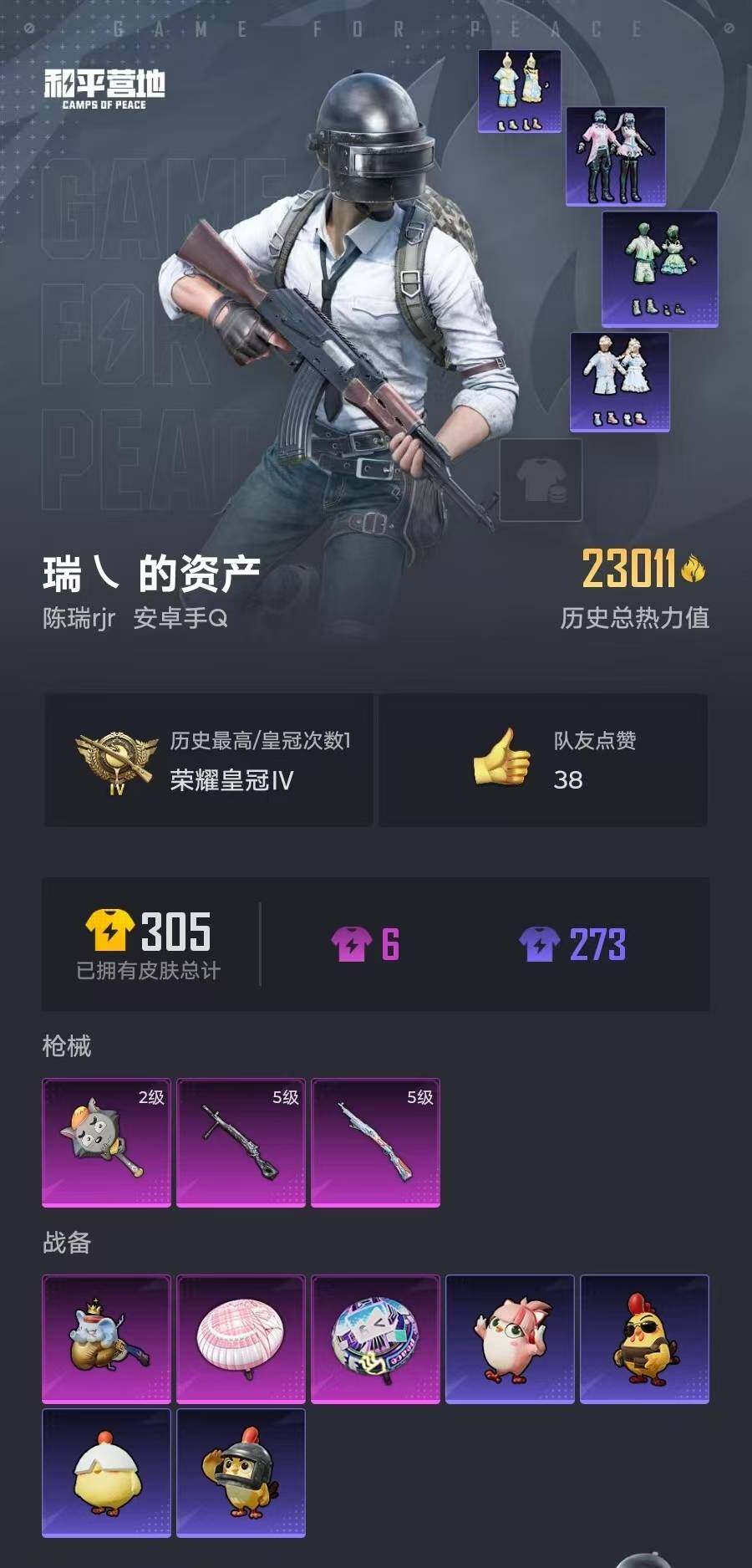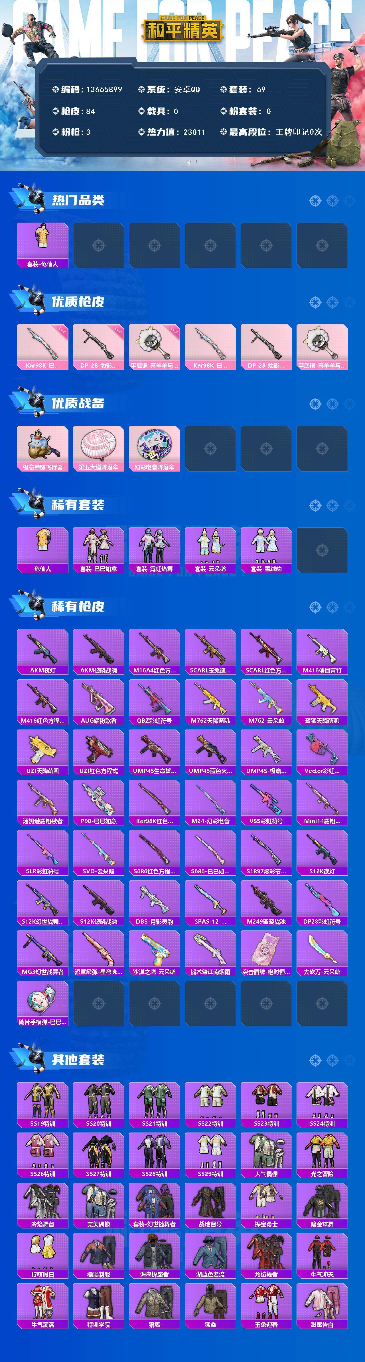 6313-0粉装-3特效呛-0载具-1粉色飞行器-23011热力值-1王牌印记-69套装-84呛皮 【热门品类】:套装-龟仙人 【粉色呛皮等级】:kar98k-巳巳如意五级,dp-28-豹影疾电五级,平底锅-喜羊羊与灰太狼二级 【粉色呛皮】:kar98k-巳巳如意,dp-28-豹影疾电,平底锅-喜羊羊与灰太狼 【粉色飞行器】:极意拳锋飞行器 【粉色降落伞】:第五大道降落伞,幻彩