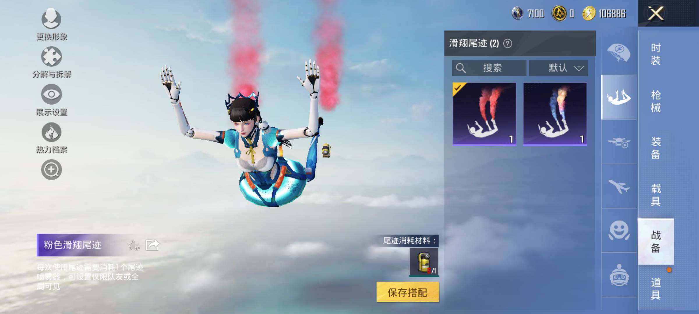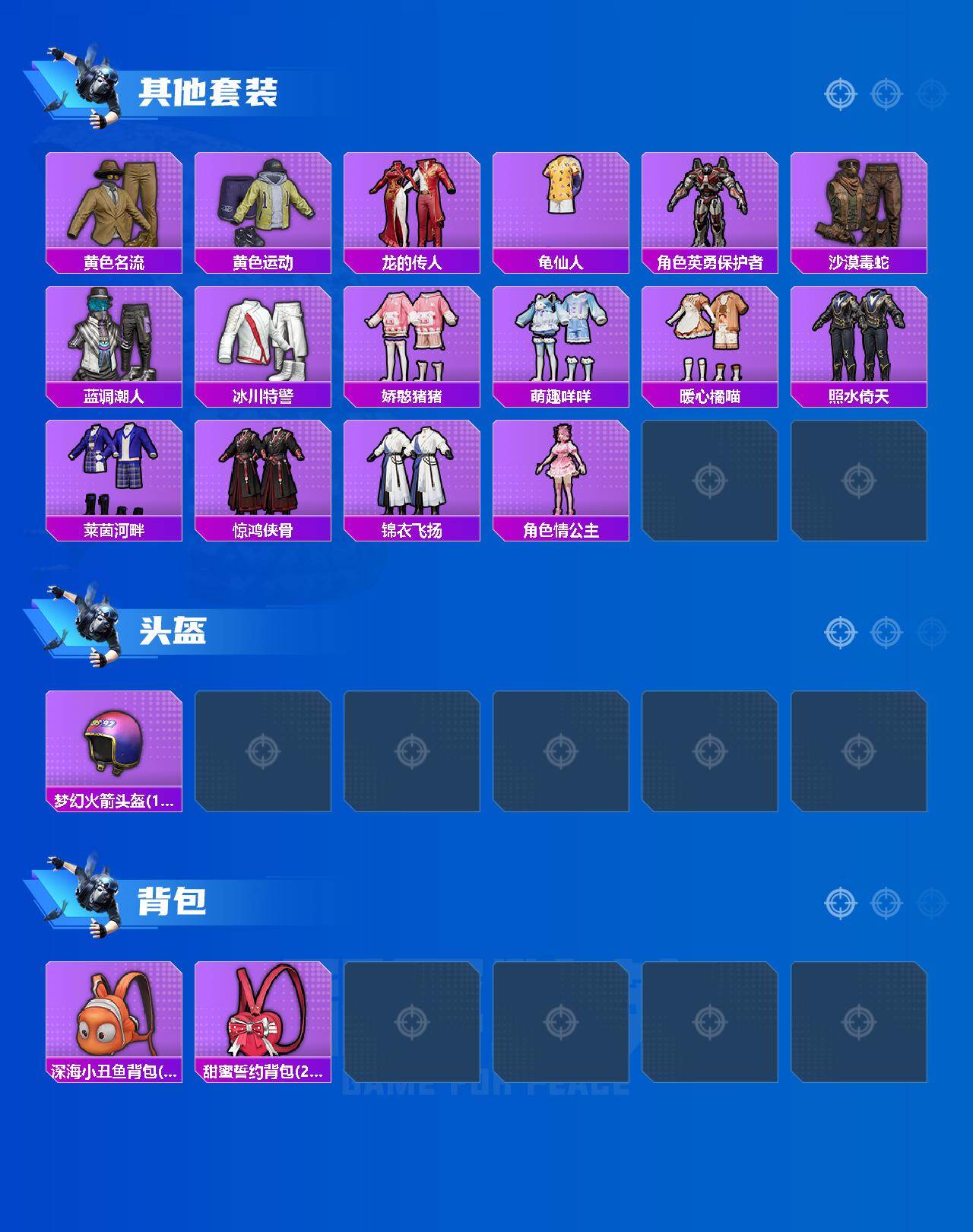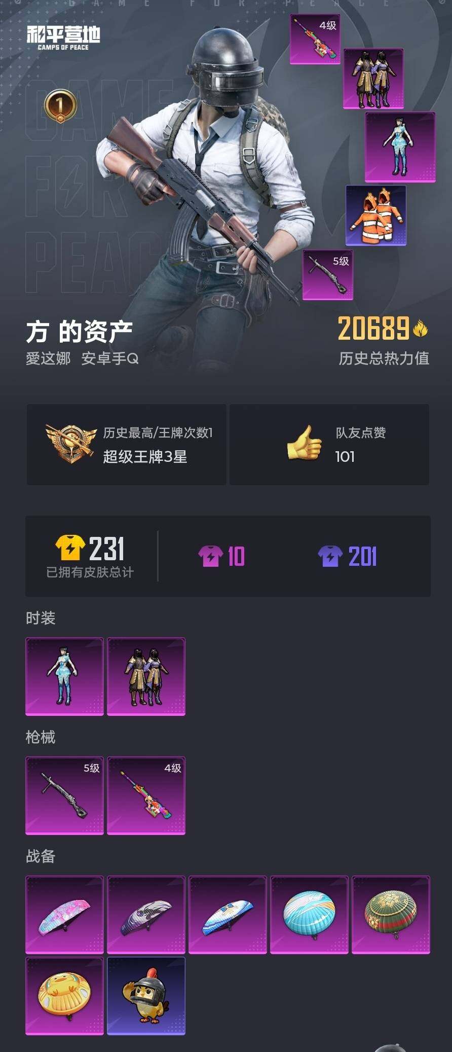 6059-2粉装-2特效呛-0载具-0粉色飞行器-20689热力值-1王牌印记-59套装-61呛皮 【热门品类】:套装-小丑鱼,角色-军刀雅典娜,套装-龟仙人 【粉色套装】:粉装-朗月武圣,角色-异瞳寒姬 【粉色呛皮等级】:amr-炫光之旅四级,dp-28-豹影疾电五级 【粉色呛皮】:amr-炫光之旅,dp-28-豹影疾电 【粉色降落伞】:幻影战神降落伞,垂柳戏鸭降落伞,翩跹演武降