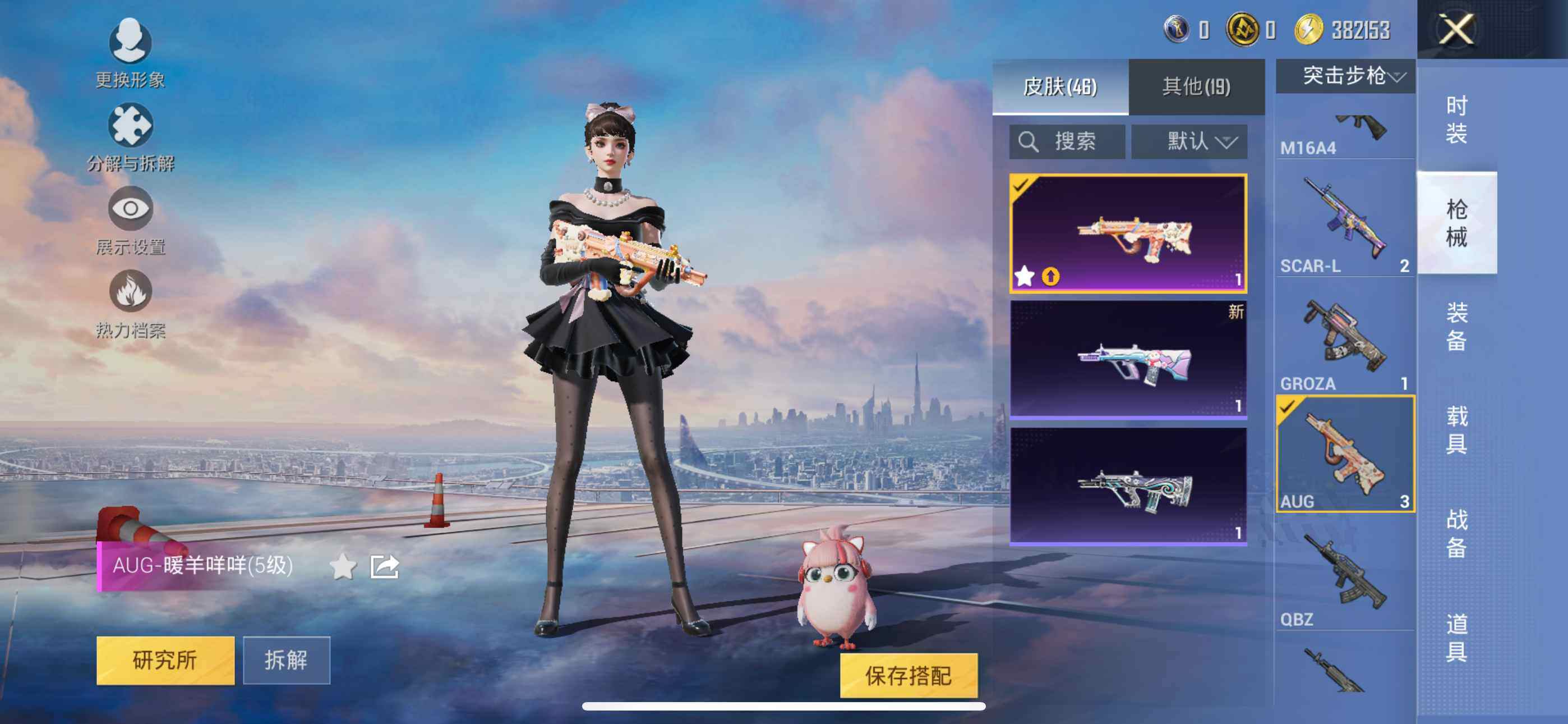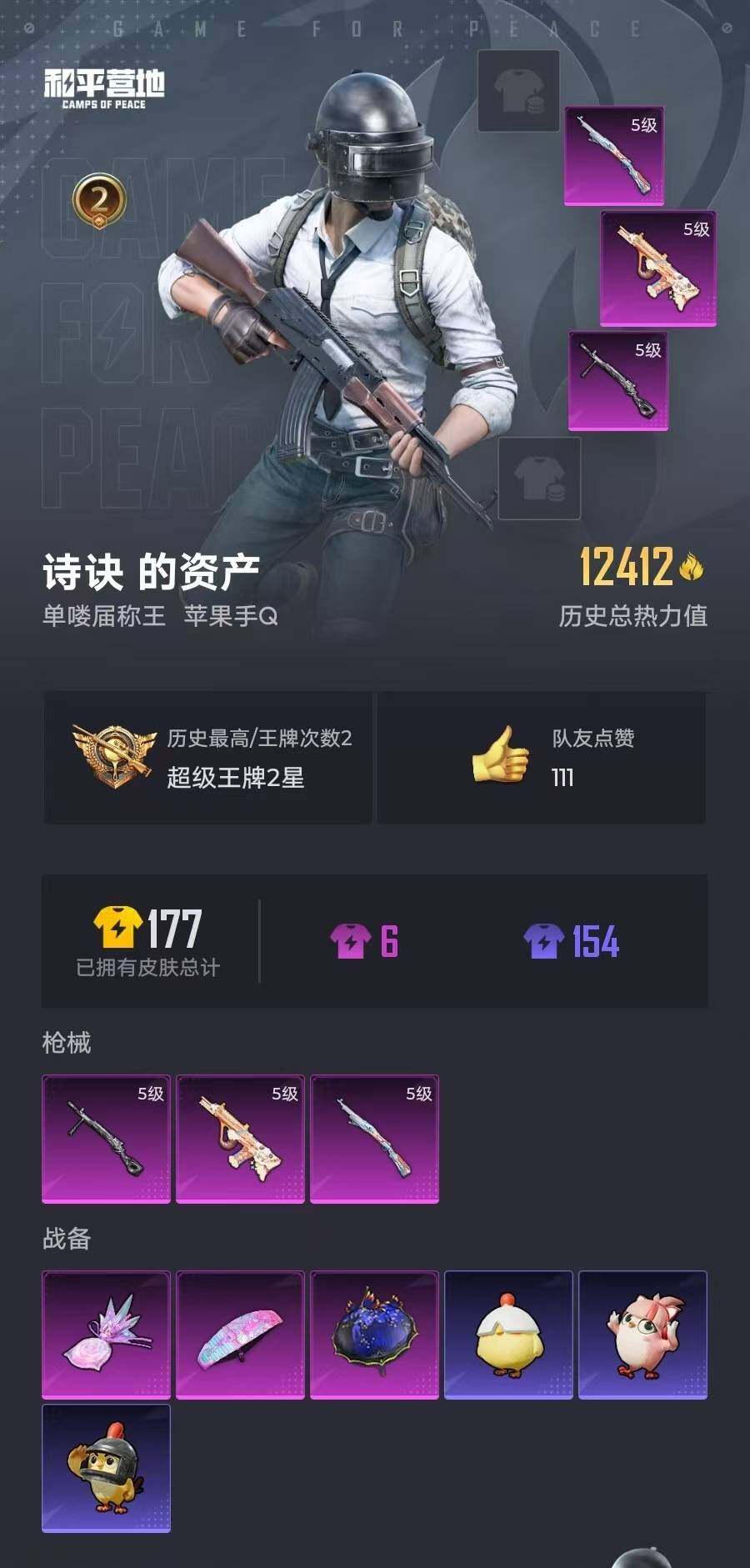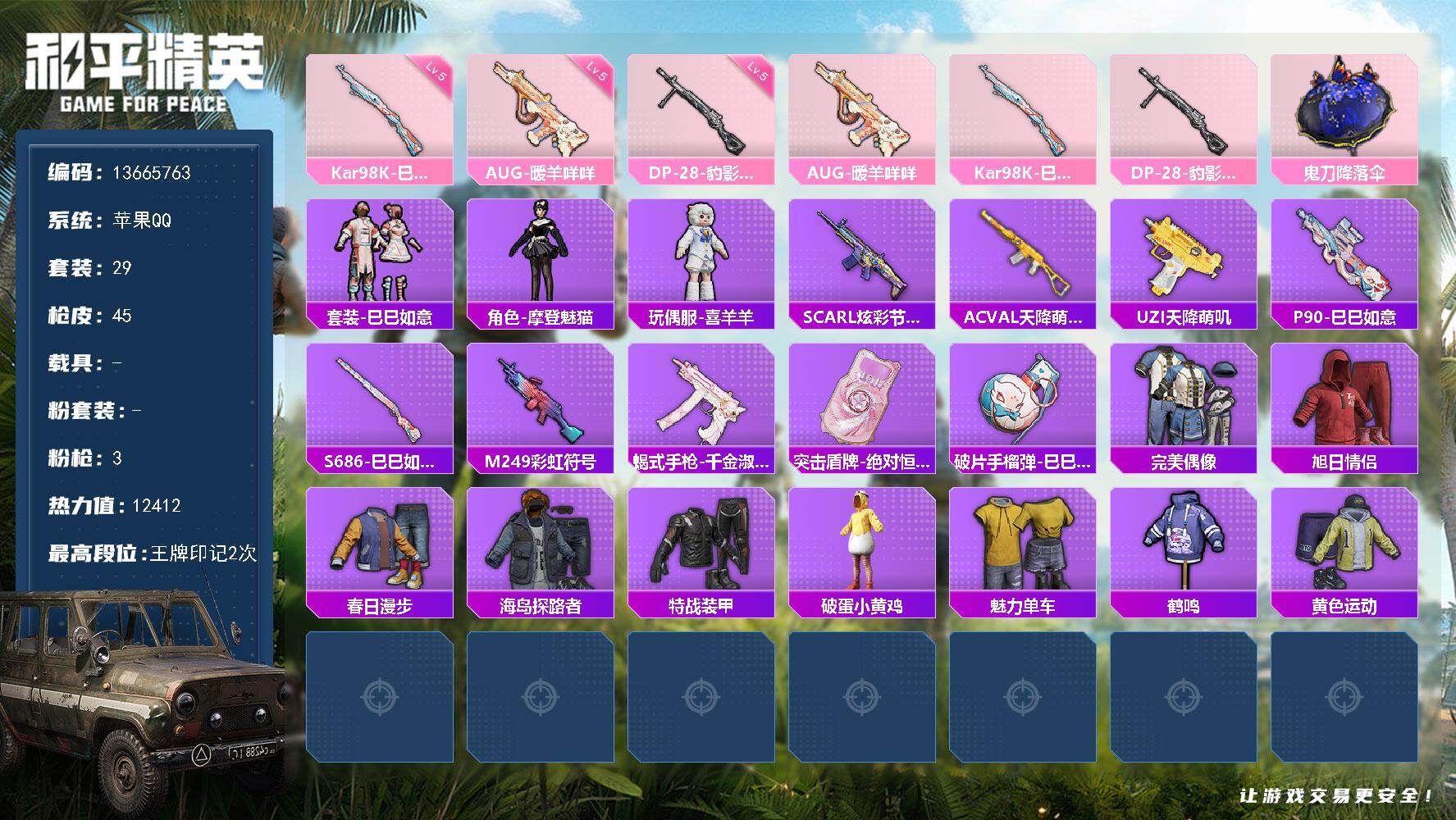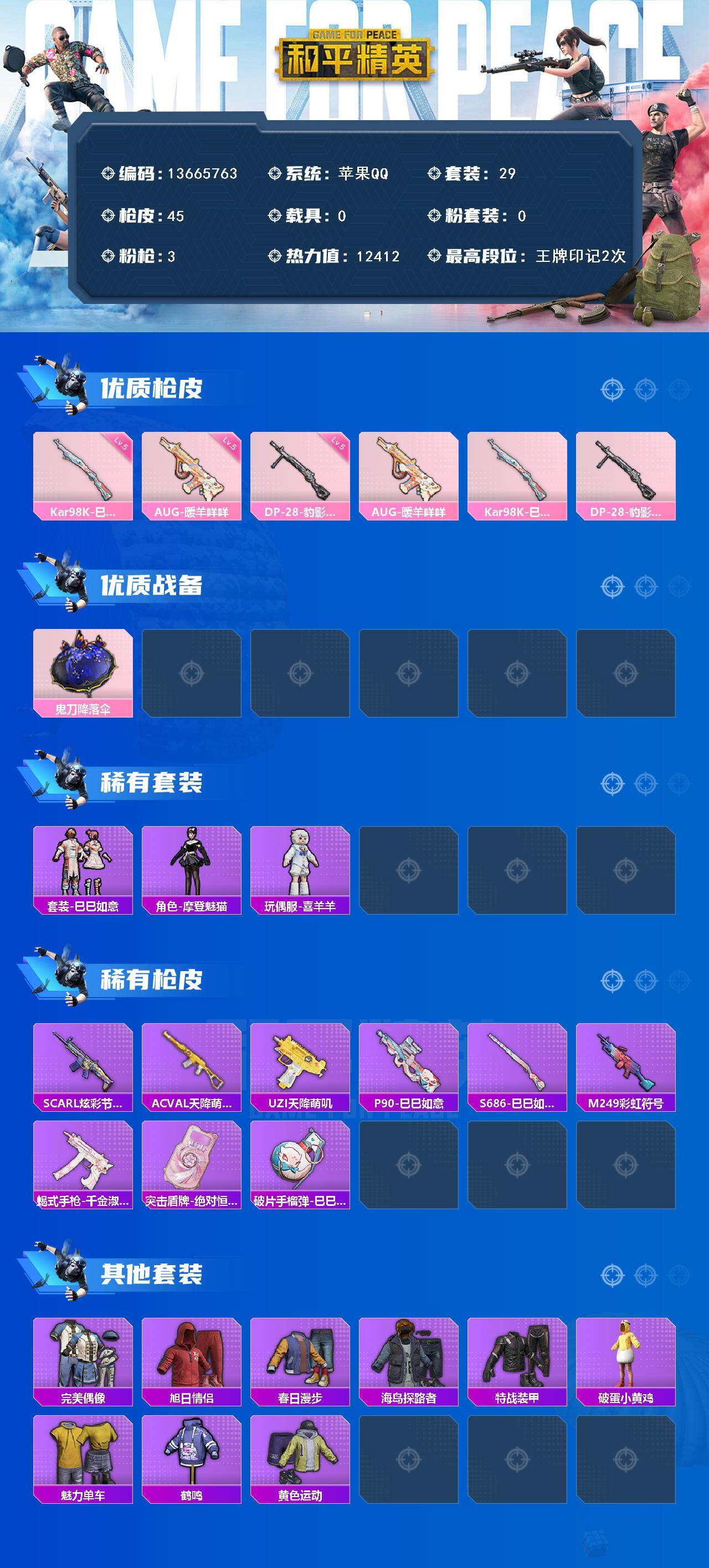 6176-3特效呛-0载具-1粉色飞行器-12412热力值-2王牌印记-29套装-45呛皮 【粉色呛皮等级】:aug-暖羊咩咩五级,kar98k-巳巳如意五级,dp-28-豹影疾电五级 【粉色呛皮】:aug-暖羊咩咩,kar98k-巳巳如意,dp-28-豹影疾电 【粉色降落伞】:鬼刀降落伞 【稀有套装】:套装-巳巳如意,角色-摩登魅猫,玩偶服-喜羊羊,套装-炫彩糖果 【稀有呛皮