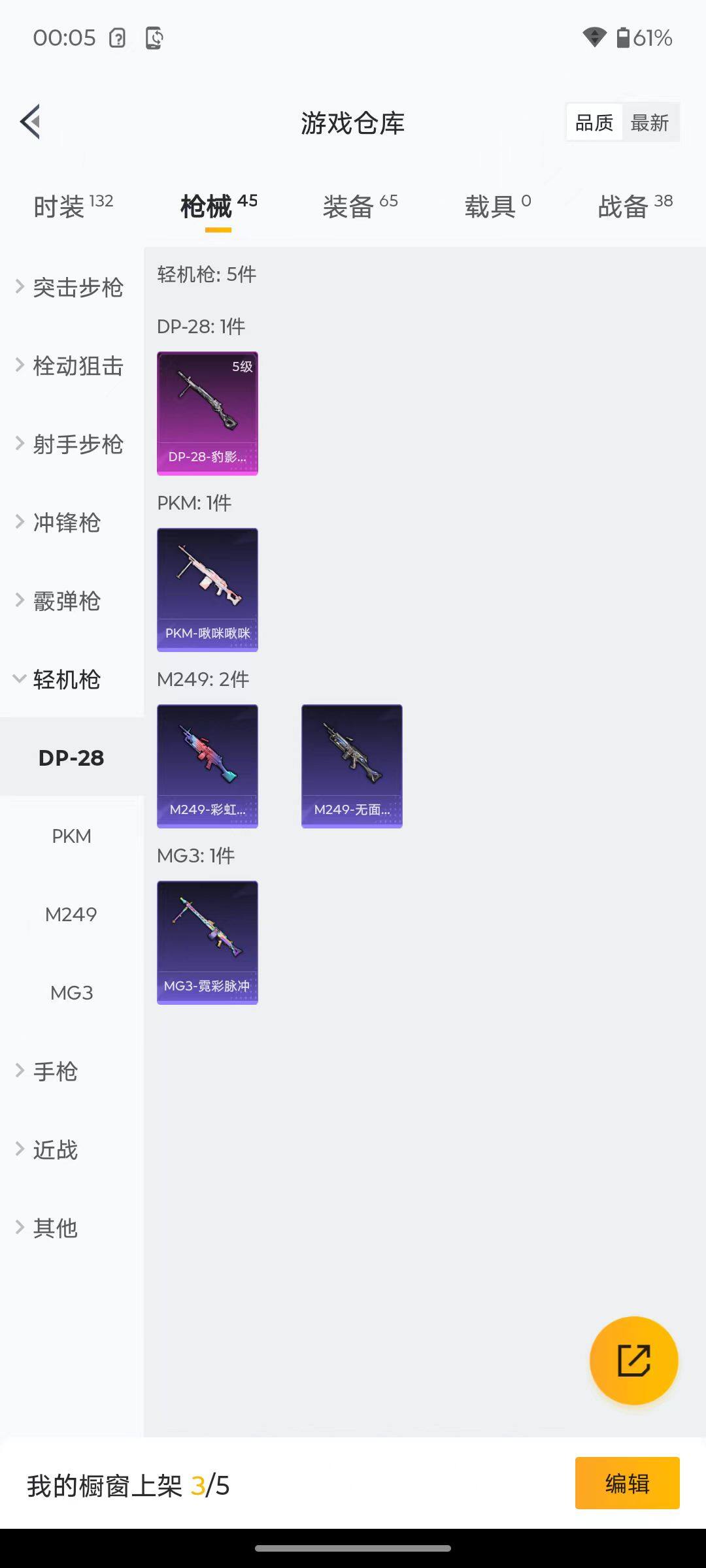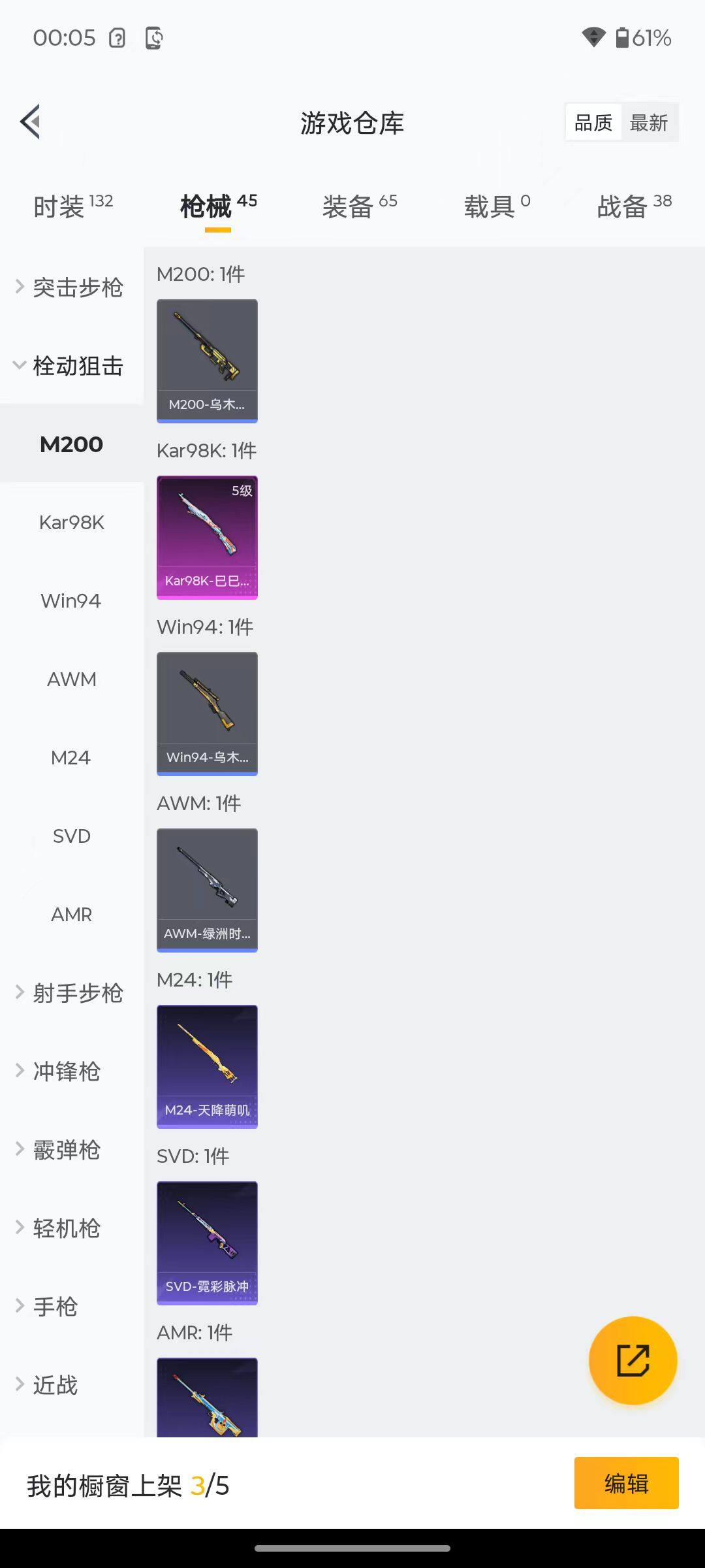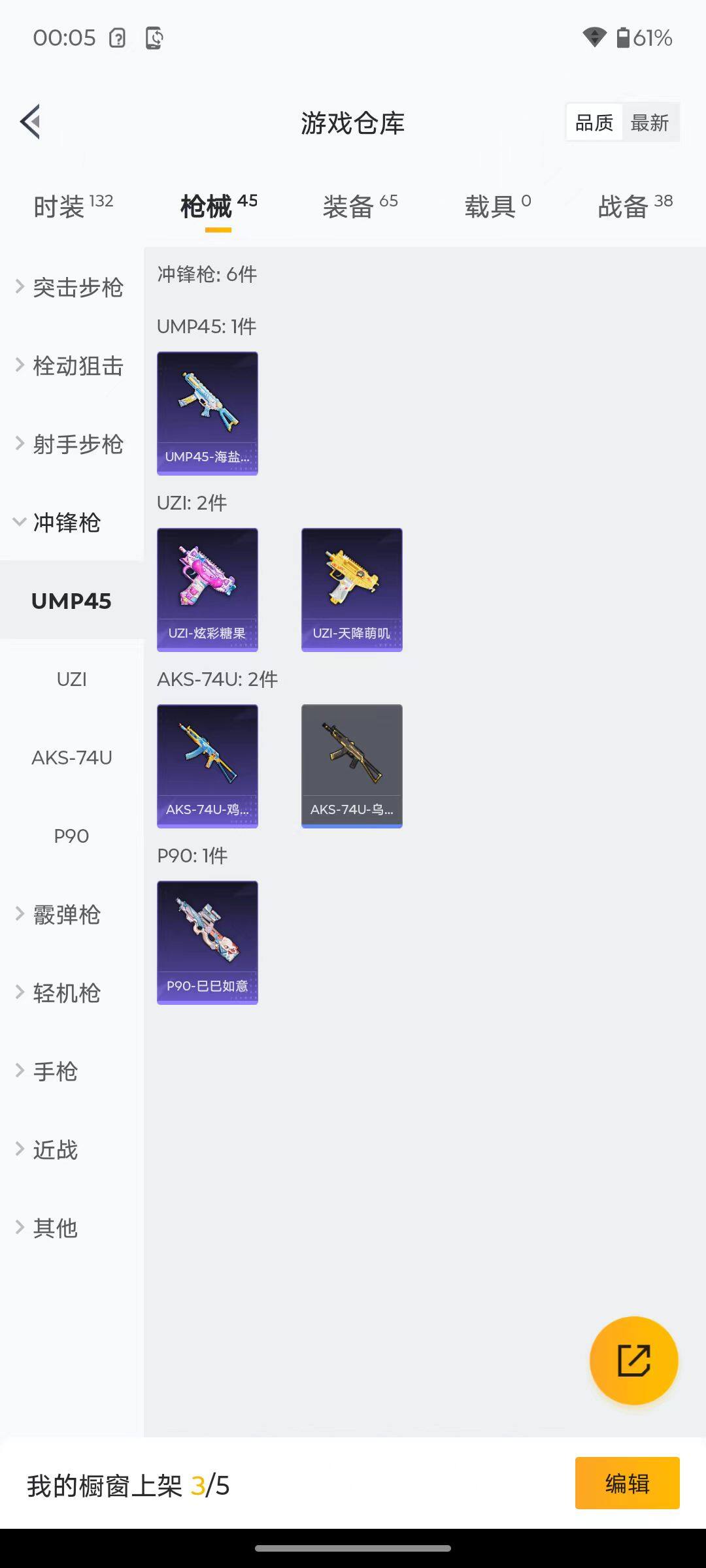 6176-3特效呛-0载具-1粉色飞行器-12412热力值-2王牌印记-29套装-45呛皮 【粉色呛皮等级】:aug-暖羊咩咩五级,kar98k-巳巳如意五级,dp-28-豹影疾电五级 【粉色呛皮】:aug-暖羊咩咩,kar98k-巳巳如意,dp-28-豹影疾电 【粉色降落伞】:鬼刀降落伞 【稀有套装】:套装-巳巳如意,角色-摩登魅猫,玩偶服-喜羊羊,套装-炫彩糖果 【稀有呛皮