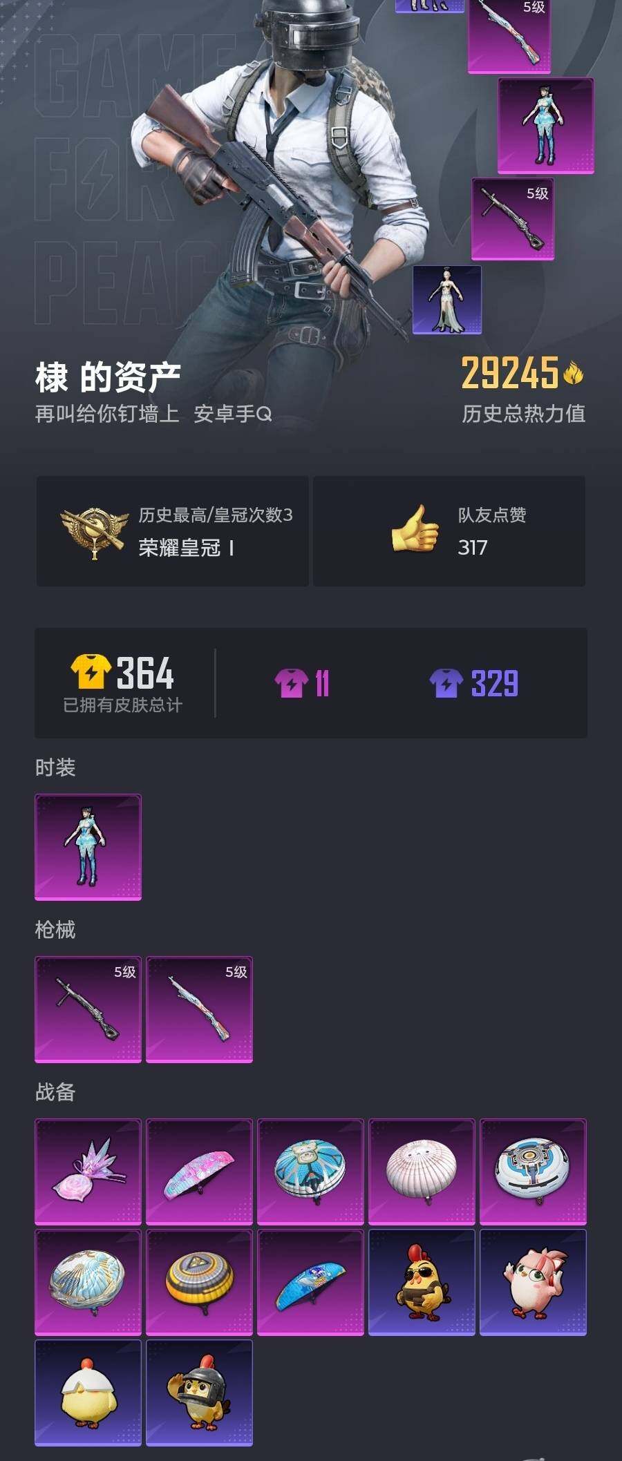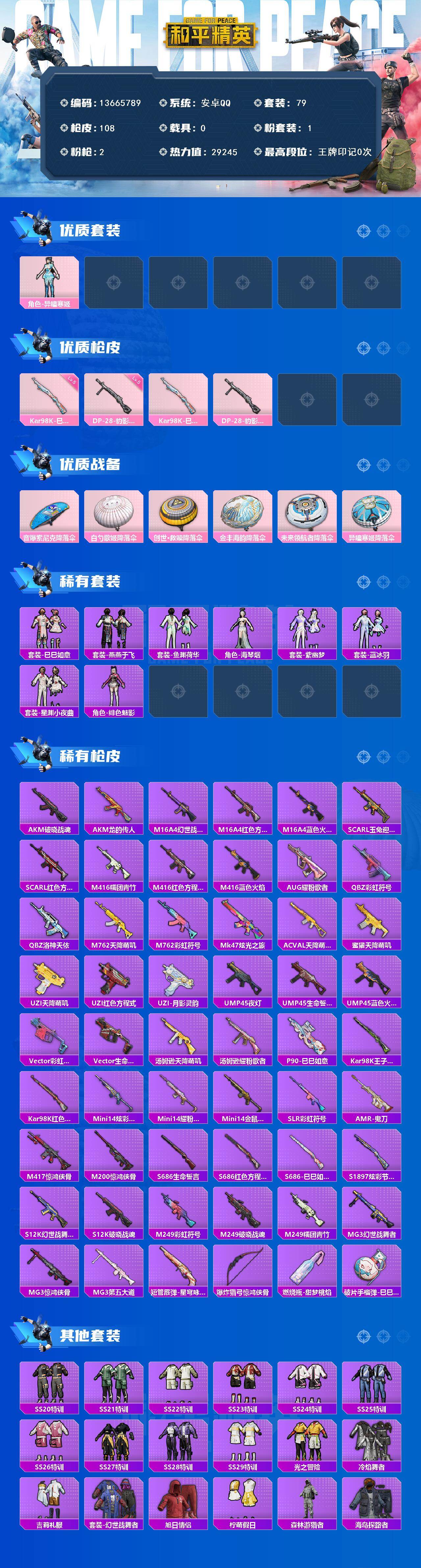 6200-1粉装-2特效呛-0载具-1粉色飞行器-29245热力值-1王牌印记-79套装-108呛皮 【热门品类】:套装-龟仙人,套装-粉红小猪 【粉色套装】:角色-异瞳寒姬 【粉色呛皮等级】:kar98k-巳巳如意五级,dp-28-豹影疾电五级 【粉色呛皮】:kar98k-巳巳如意,dp-28-豹影疾电 【粉色降落伞】:音爆索尼克降落伞,白勺歌姬降落伞,创世·救赎降落伞,金丰海韵