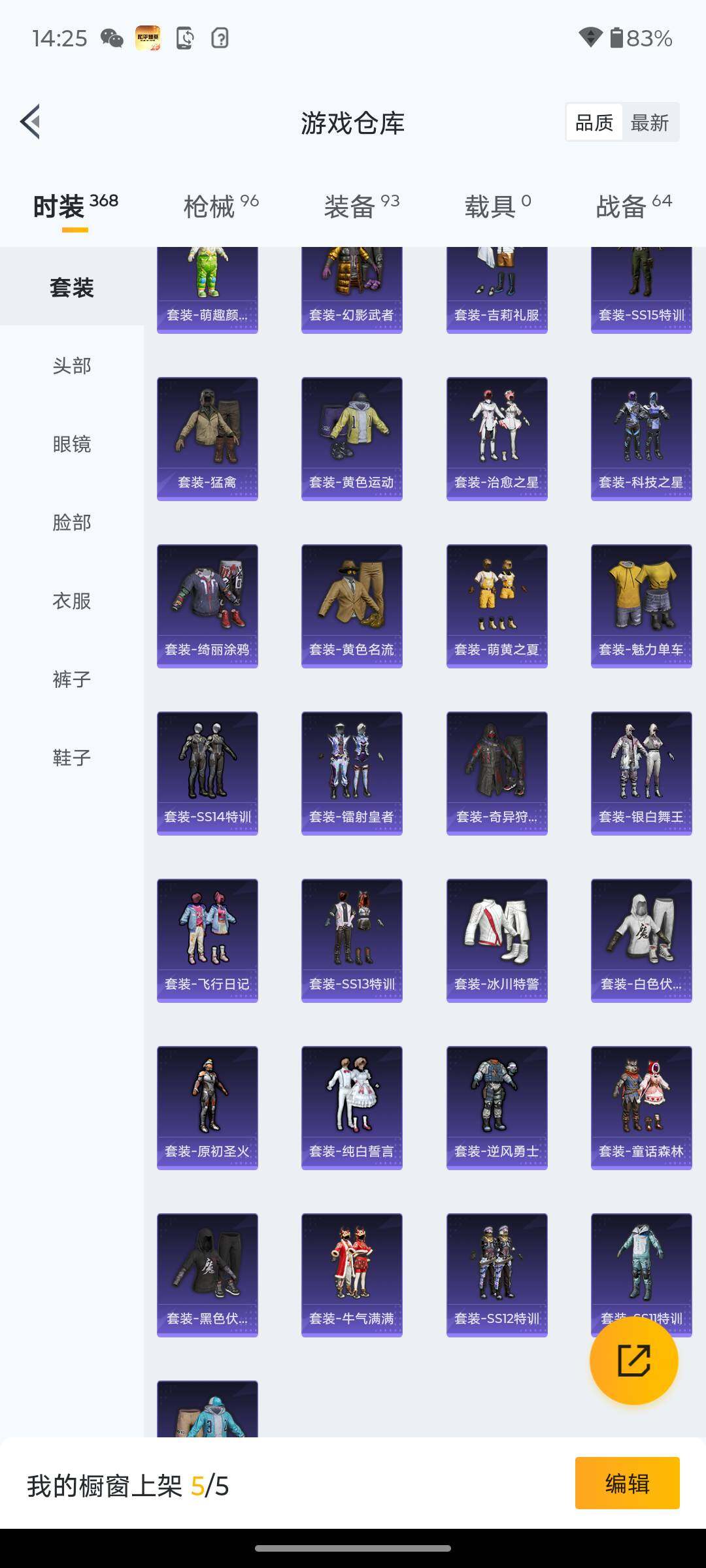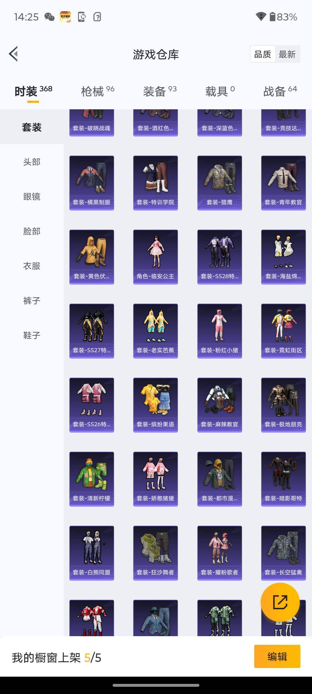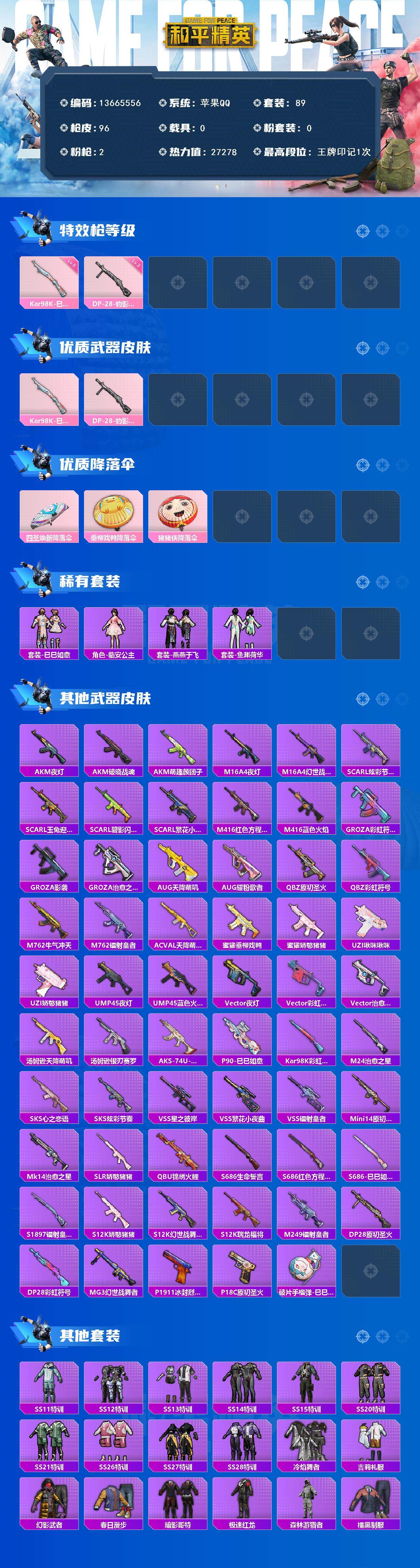 5981-2特效呛-0载具-1粉色飞行器-27278热力值-1王牌印记-89套装-96呛皮 【热门品类】:套装-奇异狩猎者,套装-暗影哥特,套装-粉红小猪 【粉色呛皮等级】:kar98k-巳巳如意五级,dp-28-豹影疾电三级 【粉色呛皮】:kar98k-巳巳如意,dp-28-豹影疾电 【粉色降落伞】:四圣焕新降落伞,垂柳戏鸭降落伞,猪猪侠降落伞 【稀有套装】:套装-巳巳如意,角色