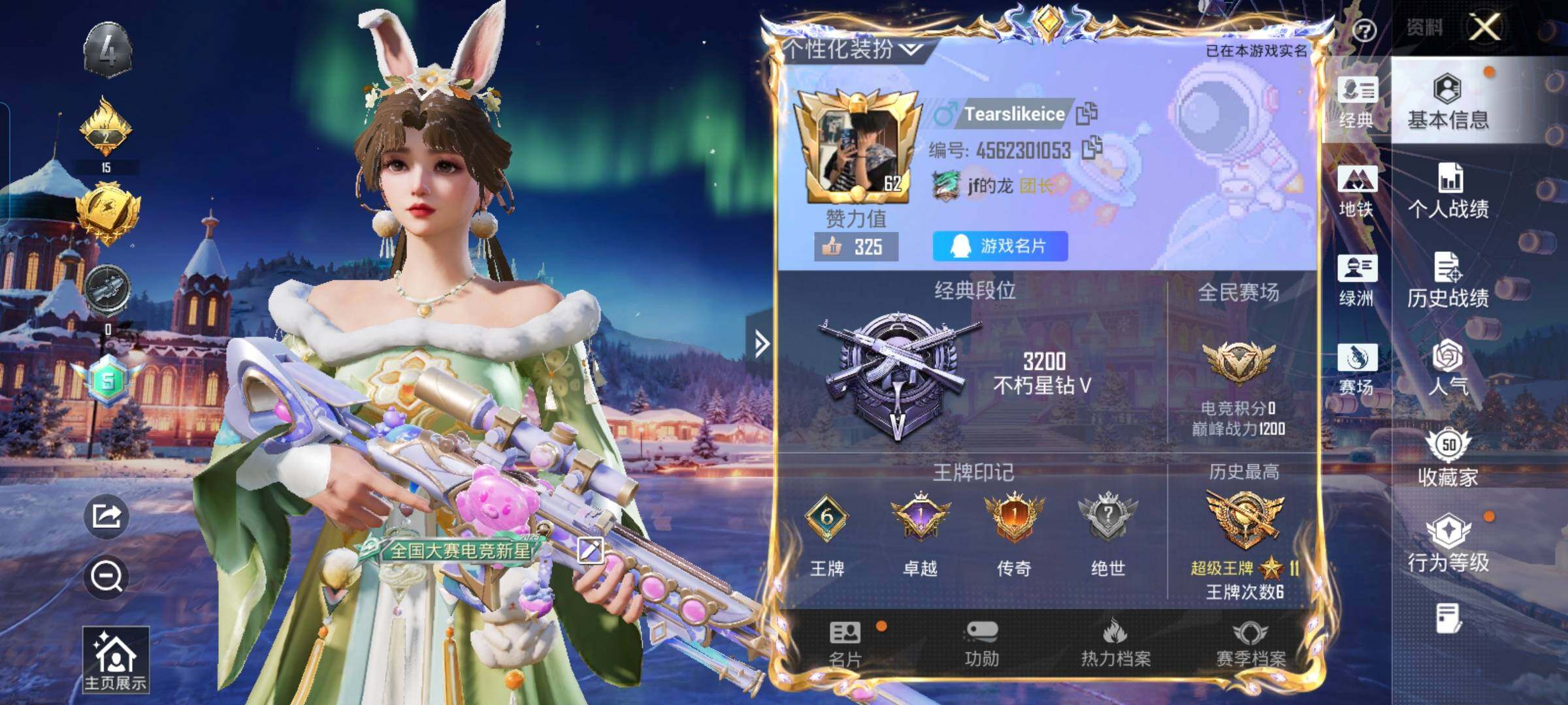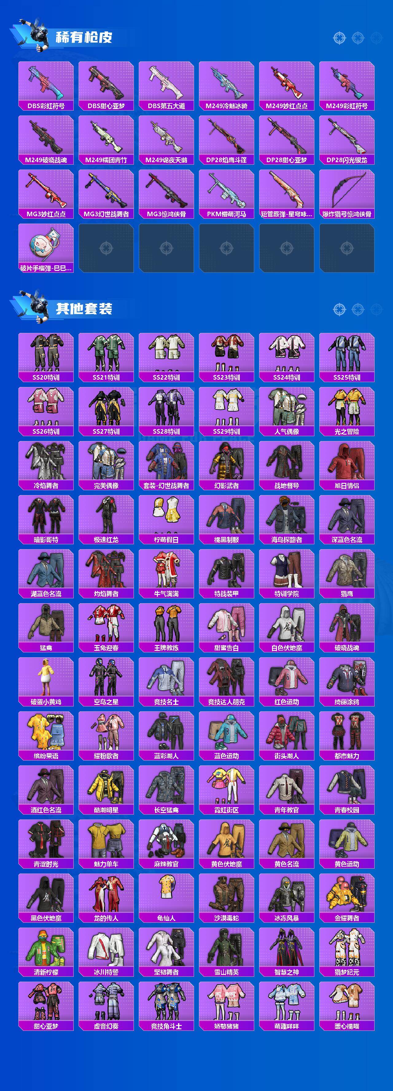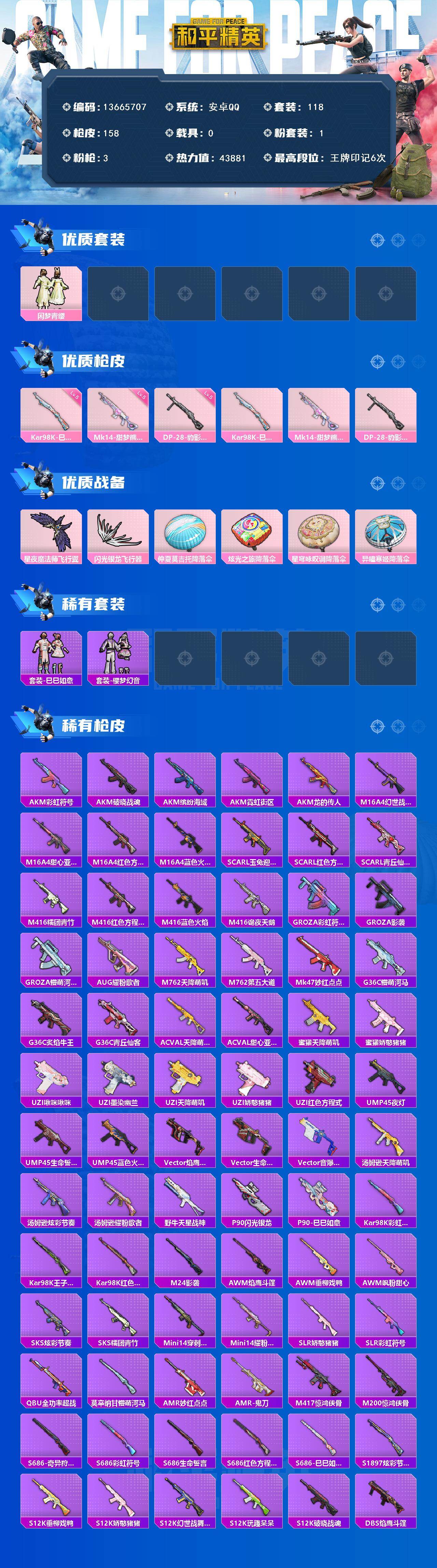 6130-1粉装-3特效呛-0载具-2粉色飞行器-43881热力值-6王牌印记-118套装-158呛皮 【热门品类】:套装-龟仙人,套装-暗影哥特 【粉色套装】:粉装-闲梦青缨 【粉色呛皮等级】:kar98k-巳巳如意五级,mk14-甜梦熊击五级,dp-28-豹影疾电五级 【粉色呛皮】:kar98k-巳巳如意,mk14-甜梦熊击,dp-28-豹影疾电 【粉色飞行器】:星夜魔法师