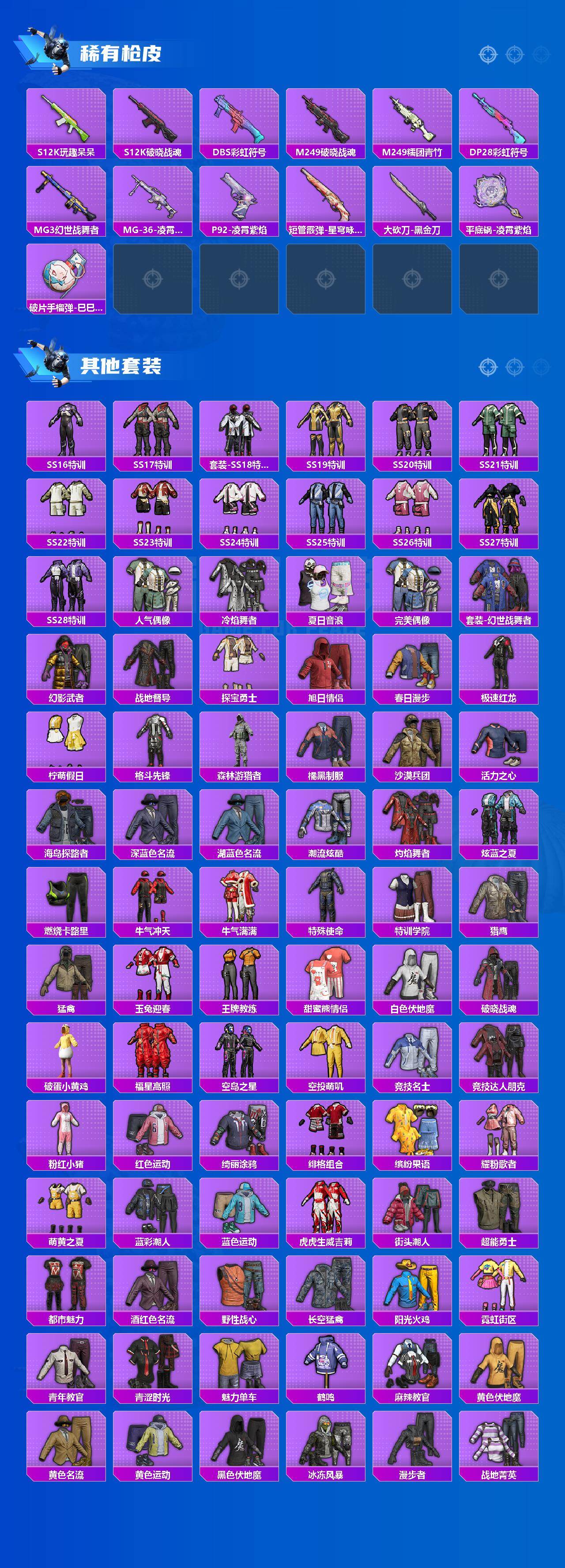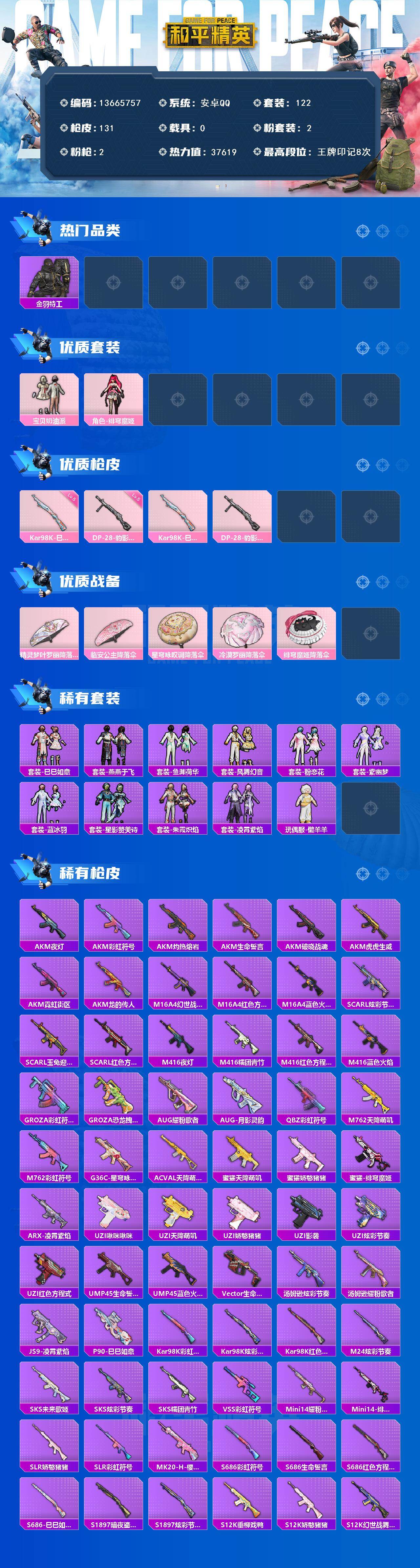 6169-2粉装-2特效呛-0载具-0粉色飞行器-37619热力值-8王牌印记-122套装-131呛皮 【热门品类】:套装-金羽特工,套装-粉红小猪 【粉色套装】:粉装-宝贝奶油派,角色-绯穹魔姬 【粉色呛皮等级】:kar98k-巳巳如意五级,dp-28-豹影疾电五级 【粉色呛皮】:kar98k-巳巳如意,dp-28-豹影疾电 【粉色降落伞】:精灵梦叶罗丽降落伞,临安公主降落伞,星