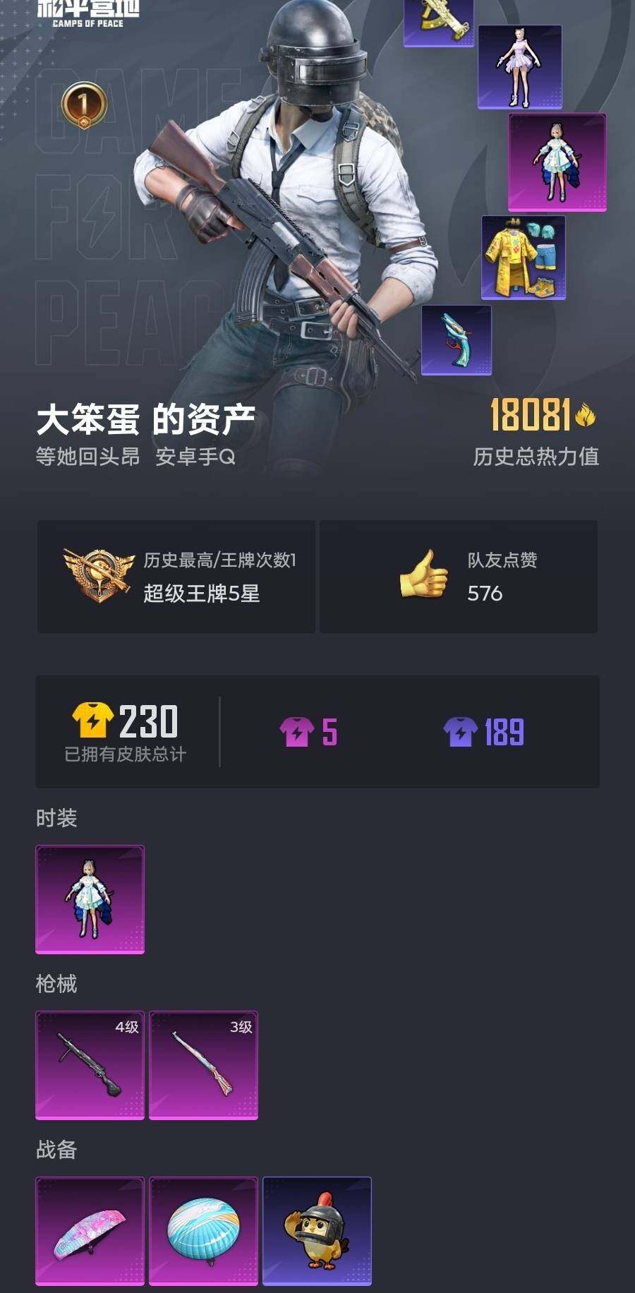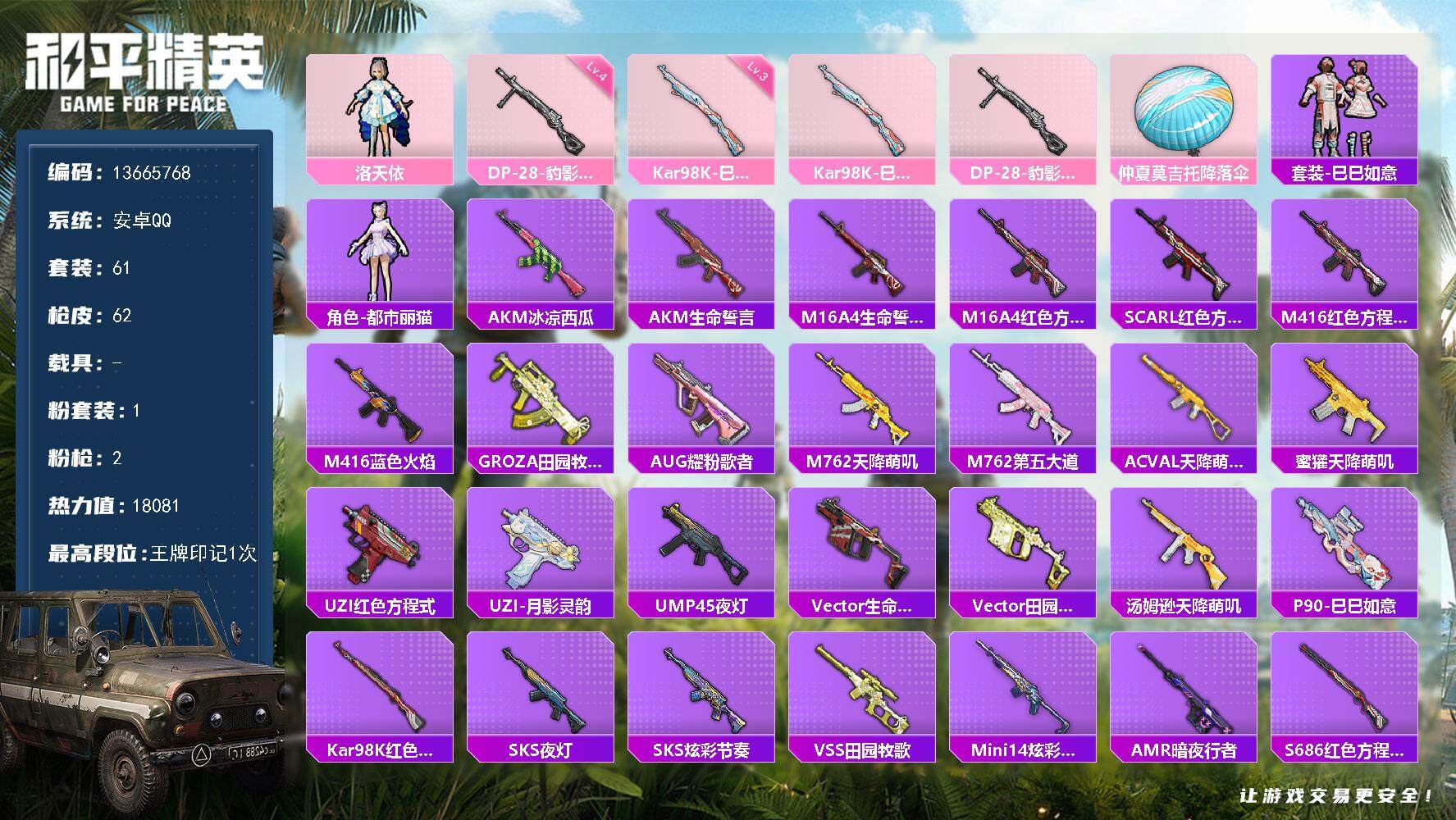 6178-1粉装-2特效呛-0载具-0粉色飞行器-18081热力值-1王牌印记-61套装-62呛皮 【粉色套装】:角色-洛天依 【粉色呛皮等级】:kar98k-巳巳如意三级,dp-28-豹影疾电四级 【粉色呛皮】:kar98k-巳巳如意,dp-28-豹影疾电 【粉色降落伞】:仲夏莫吉托降落伞 【稀有套装】:套装-巳巳如意,角色-都市丽猫 【稀有呛皮】:akm-冰凉西瓜,akm-生命