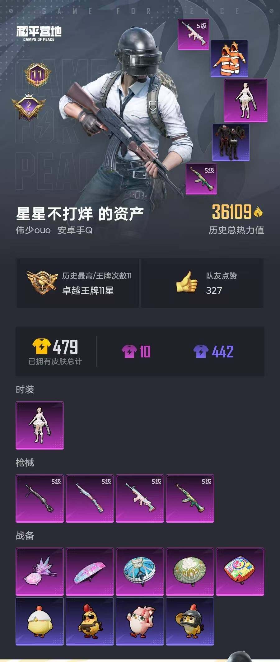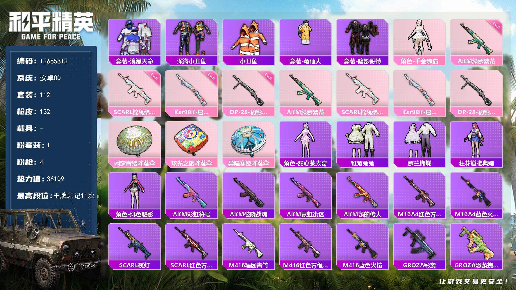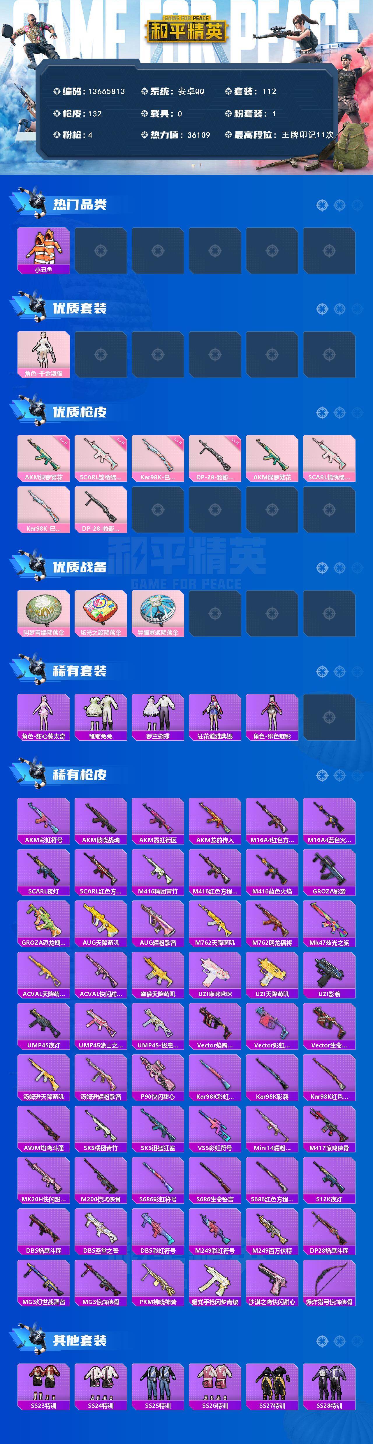 6226-1粉装-4特效呛-0载具-1粉色飞行器-36109热力值-11王牌印记-112套装-132呛皮 【热门品类】:套装-浪漫天命,套装-深海小丑鱼,套装-小丑鱼,套装-龟仙人,套装-暗影哥特 【粉色套装】:角色-千金淑猫 【粉色呛皮等级】:akm-绿萝繁花五级,scar-l-锦绣绵绵五级,kar98k-巳巳如意五级,dp-28-豹影疾电五级 【粉色呛皮】:akm-绿萝