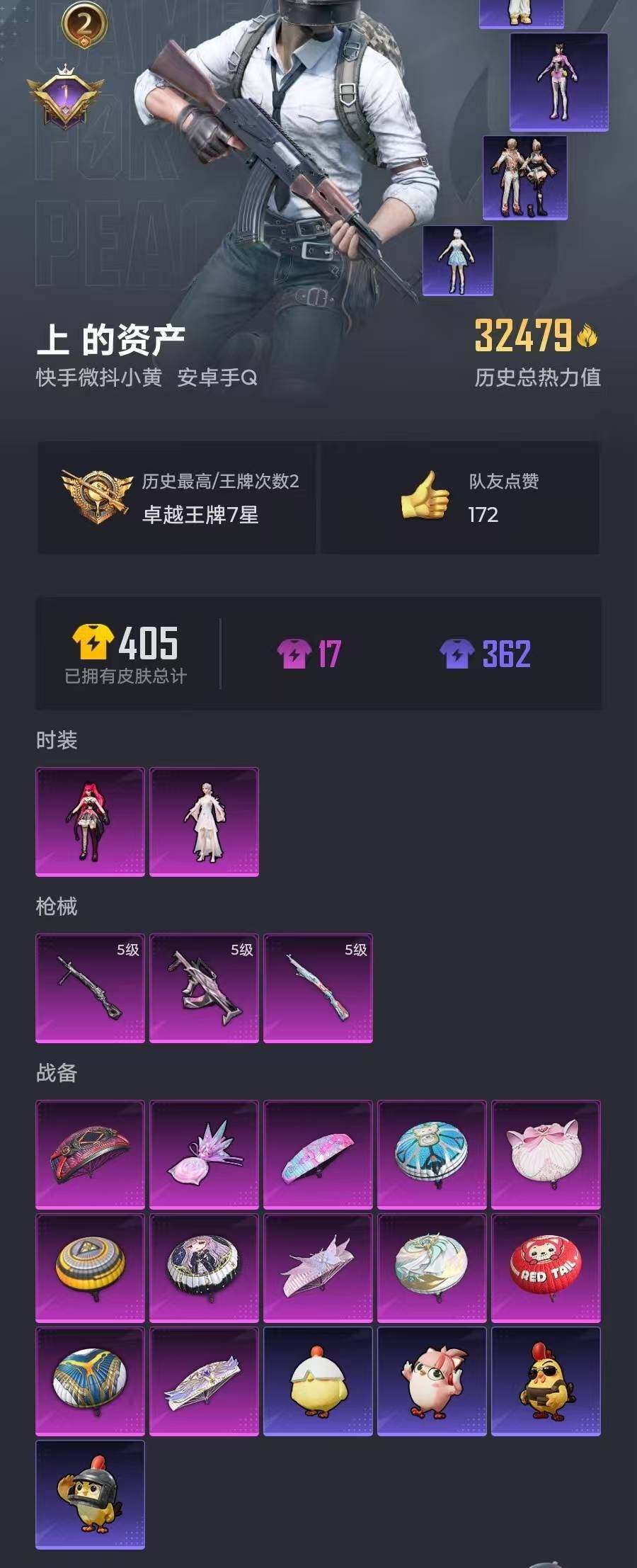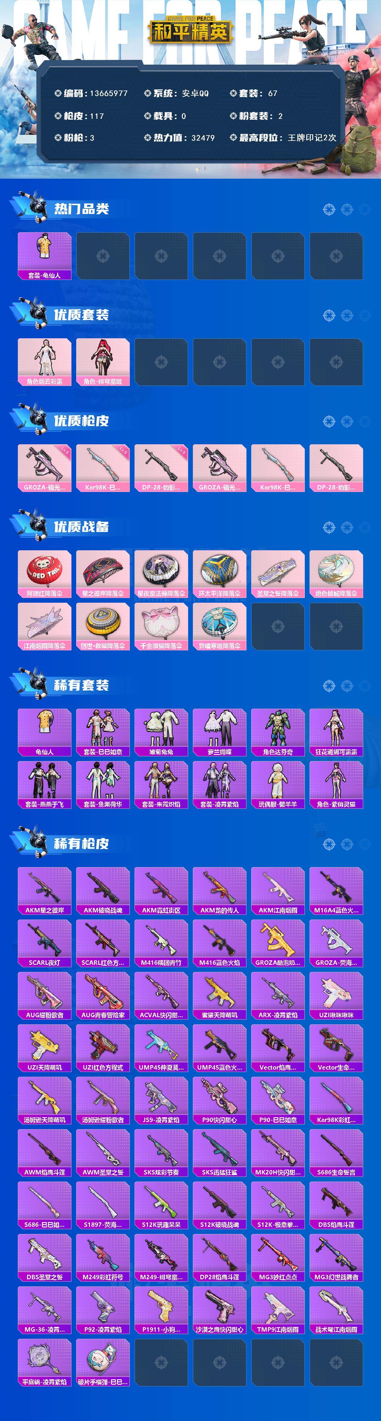 6376【龟仙人2粉装3特效呛1粉色飞行器】32479热力值-2王牌印记-67套装-117呛皮 【热门品类】:套装-龟仙人 【粉色套装】:角色-烟云彩露,角色-绯穹魔姬 【粉色呛皮等级】:groza-镜光银凌五级 【粉色呛皮】:groza-镜光银凌,kar98k-巳巳如意,dp-28-豹影疾电 【粉色降落伞】:阿狸红降落伞,环太平洋降落伞,绝色倾城降落伞,江南烟雨降落伞,圣堂之誓降落伞