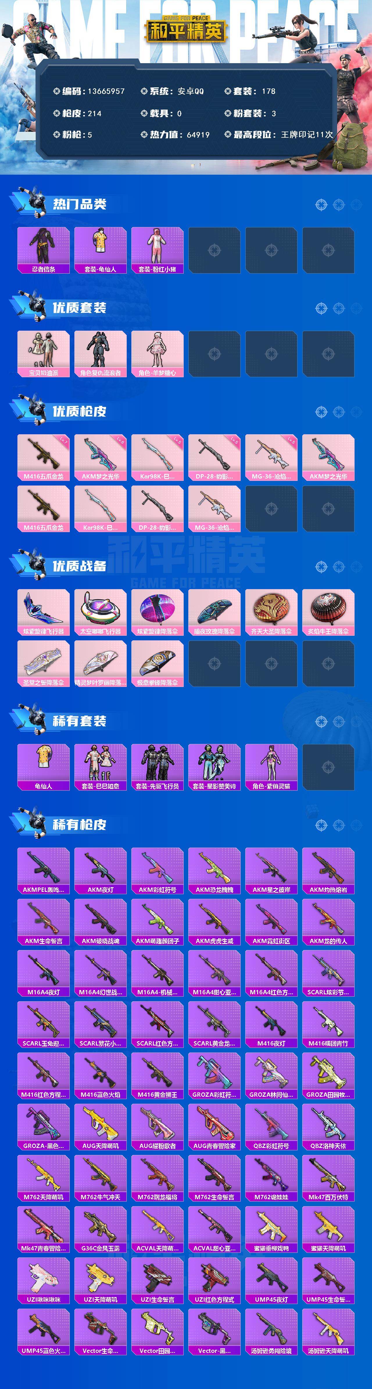 63513粉装-5特效呛-3粉色飞行器-64919热力值-11王牌印记-178套装-214呛皮 【热门品类】:套装-忍者信条,套装-龟仙人,套装-粉红小猪,小恶魔头饰 【粉色套装】:粉装-宝贝奶油派,角色-复仇流浪者,角色-羊梦糖心 【粉色呛皮等级】:akm-梦之光华六级,m416-五爪金龙七级,mg-36-沧焰双生五级 【粉色呛皮】:akm-梦之光华,m416-五爪金龙,