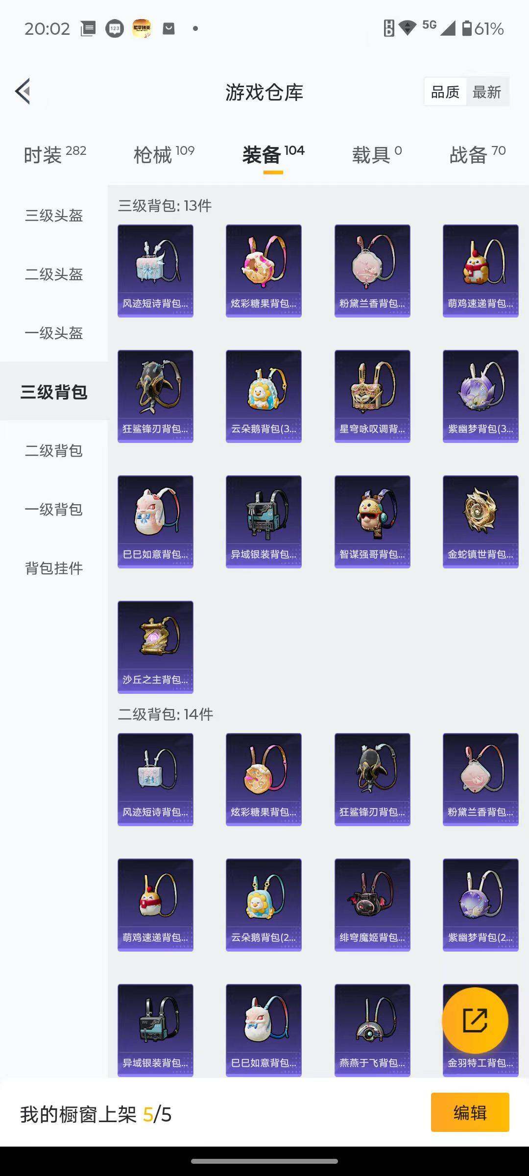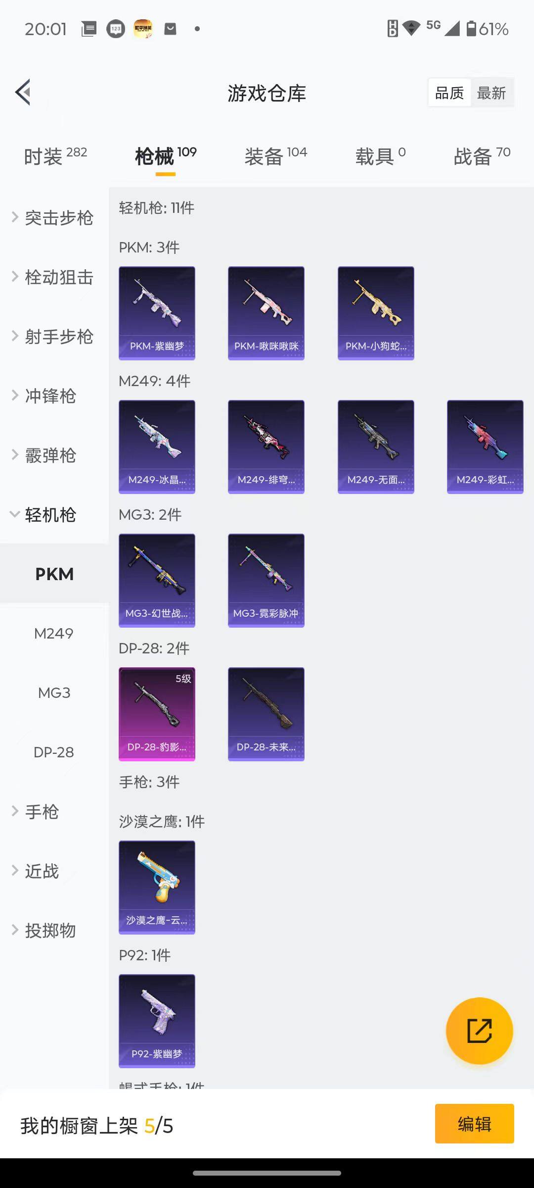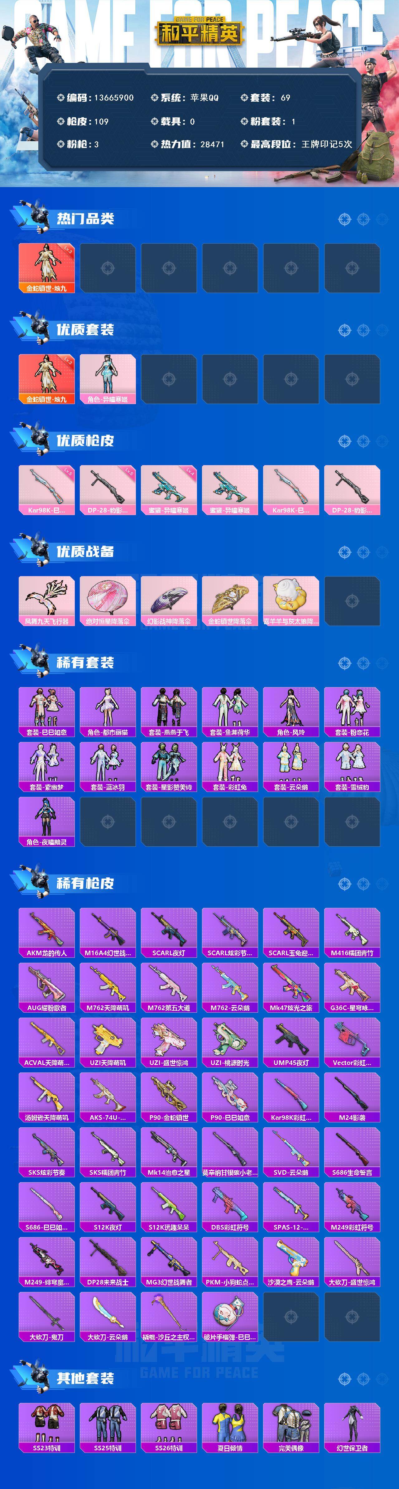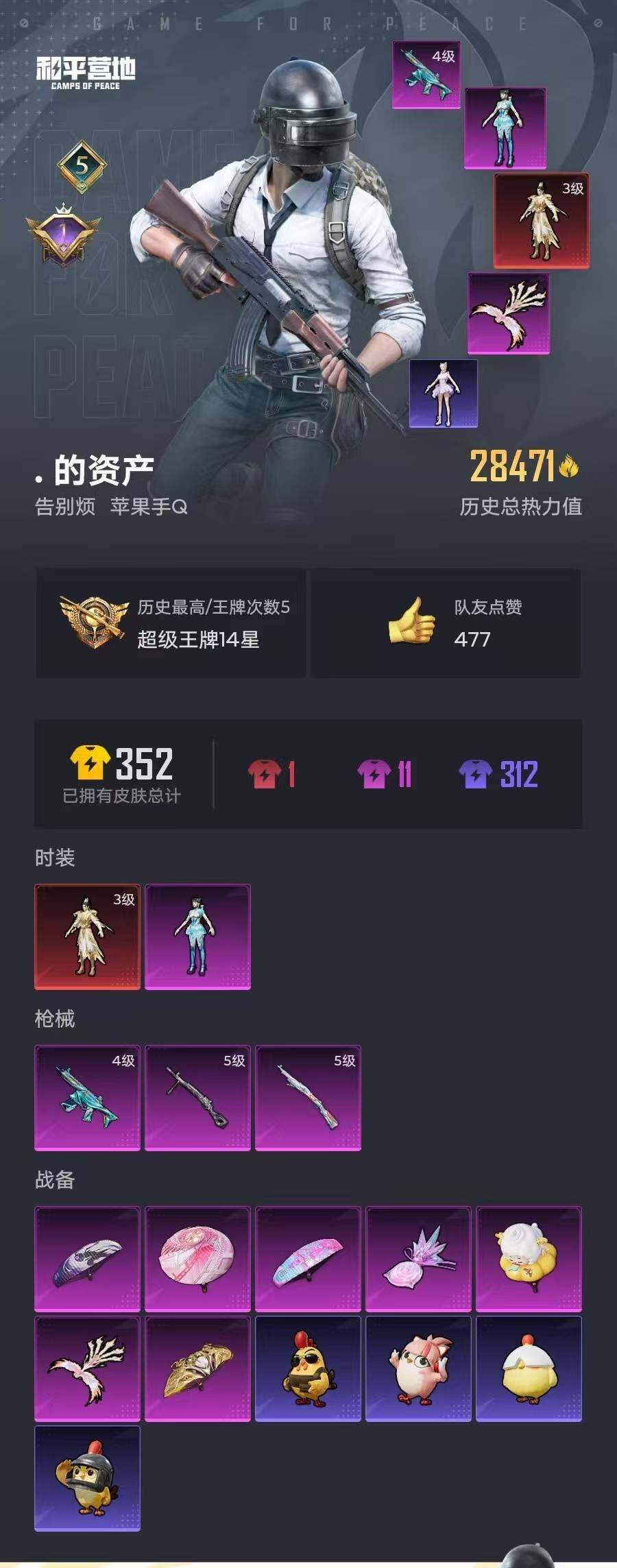 6314-1神装-1粉装-3特效呛-0载具-2粉色飞行器-28471热力值-5王牌印记-69套装-109呛皮 【红色神装等级】:金蛇镇世-烛九三级 【红色角色神装】:金蛇镇世-烛九 【粉色套装】:角色-异瞳寒姬 【粉色呛皮等级】:蜜獾-异瞳寒姬四级,kar98k-巳巳如意五级,dp-28-豹影疾电五级 【粉色呛皮】:蜜獾-异瞳寒姬,kar98k-巳巳如意,dp-28-豹影疾