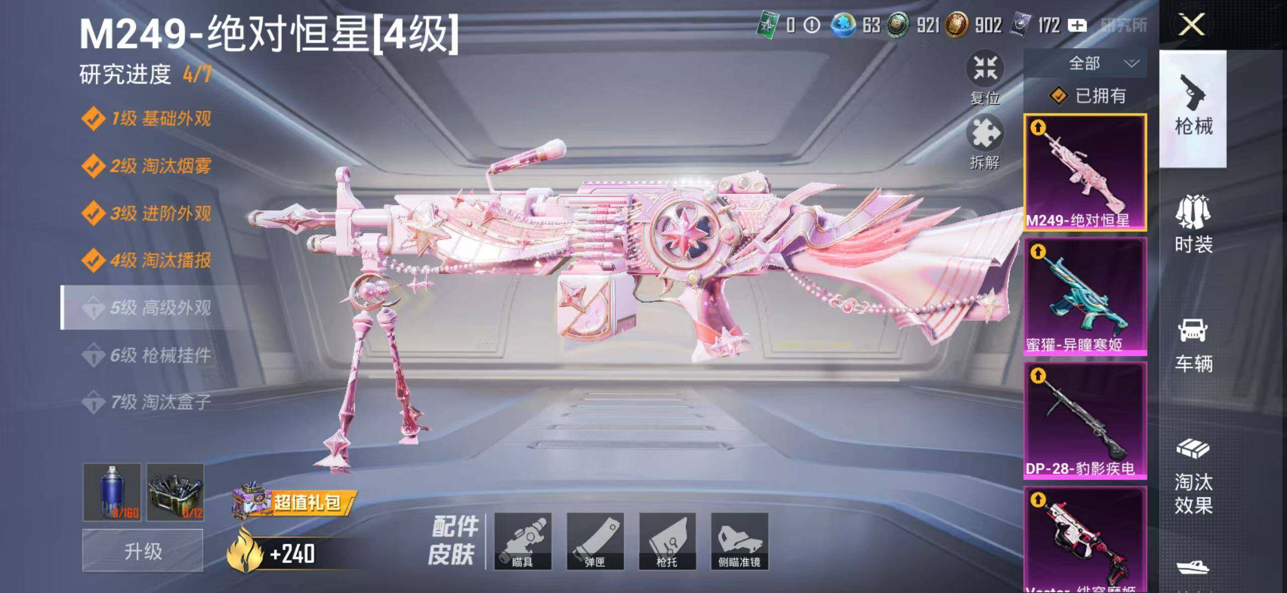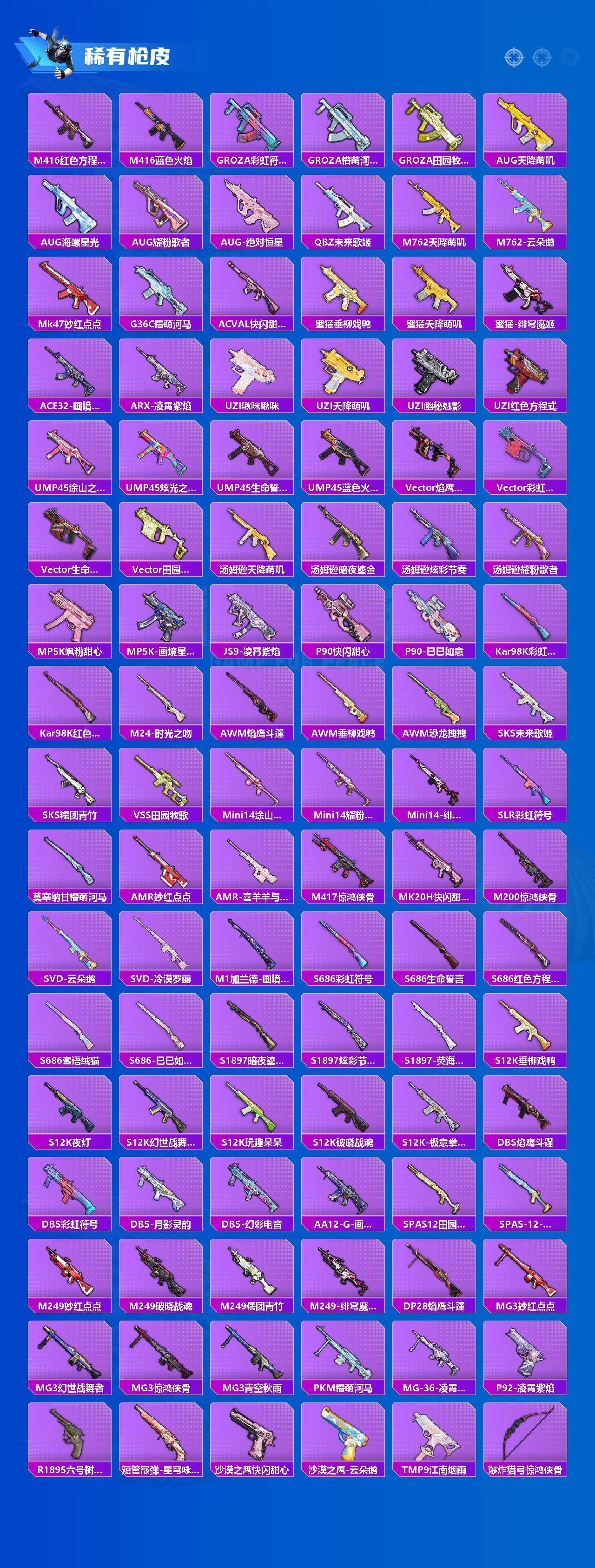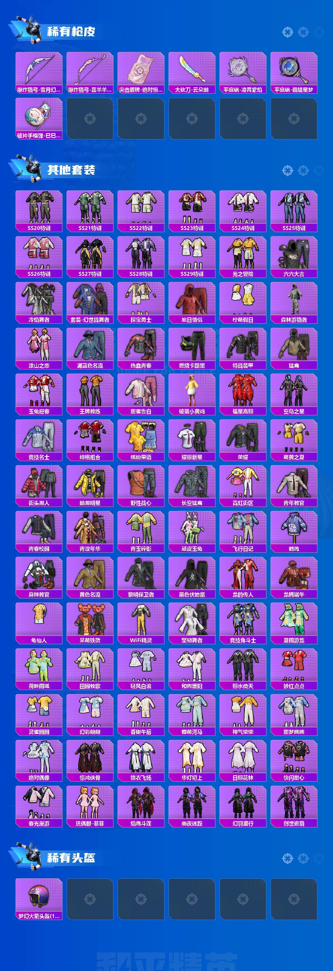 6296 7粉装-11特效呛-0载具-2粉色飞行器-69236热力值-8王牌印记-149套装-234呛皮 【热门品类】:套装-龟仙人 【粉色套装】:粉装-星之彼岸,粉装-射星猎手,粉装-莲影清波,套装-创世·救赎,角色-凤凰座 一辉,角色-绯穹魔姬,角色-异瞳寒姬 【粉色呛皮等级】:m16a4-垂柳戏鸭六级,m416-五爪金龙七级,蜜獾-异瞳寒姬一级,vect-绯穹魔姬七