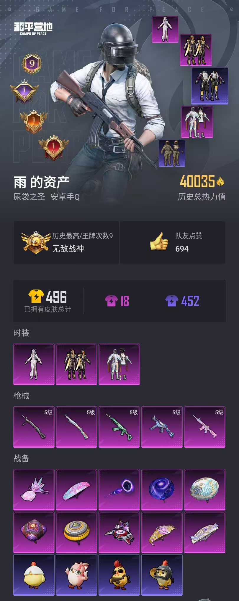 【和平精英】【lyhp20812】3粉装,5特效呛,0载具,历史最高段位:无敌战神 王牌印记9次 热力值:0,92套装,132呛械,179装备,78战备;套装:套装-智能音符,套装-创世·救赎,角色-冷漠罗丽,套装-白色伏地魔,套装-黑色伏地魔,套装-竞技名士,套装-长空猛禽,套装-海岛探路者,套装-旭日情侣,套装-灼焰舞者,套装-春日漫步,套装-幻影武者,套装-街头潮人,套装-蓝彩潮人,套装-魅力单车,套装-绮丽涂鸦,套装-破晓战魂,套装-幻世战舞者,套装-弄潮海豚,套装-缤纷果语,套装-元素星魂,套装-极速红龙,套装-东方飞龙,套装-破蛋小黄鸡,套装-鹤鸣,套装-霓虹街区,套装-nv战队服,套装-白糯汤圆,套装-战术大师,套装-耀粉歌者,套装-热情海星,套装-纯真浪花,套装-nv追光队服,套装-光之冒险,套装-王牌教练,套装-龟仙人,套装-冰河战士,套装-ss26特训,套装-快闪甜心,套装-春光漫游,套装-空岛之星,套装-无暇誓言,套装-明鸳圣池,套装-云魄琉璃,套装-贝斯之夜,套装-焰鹰斗篷,套装-幻羽潜行,套装-ss27特训,套装-恋语绒绒,套装-老实芭蕉,套装-ss28特训,角色-拉斐尔,角色-白光莹,角色-8号机,角色-mark.06,套装-海盐绵绵冰,套装-蝶变,套装-粉日山川,套装-小熊娃娃,套装-ss29特训,套装-雏菊兔兔,角色-狂花道·娜可露露,套装-萝兰蝴蝶,套装-鹿角斗士,角色-紫俏灵猫,套装-异域银装,角色-都市丽猫,套装-星途旅人,套装-ss30特训,套装-青团波波,套装-糖糖葫芦,套装-ss31特训,套装-ss33特训,套装-巳巳如意,套装-ss32特训,套装-青翼流星,套装-狂鲨锋刃,角色-灵公主,套装-炫彩糖果,套装-元气之梦,套装-ss34特训,套装-擎苍青焰,套装-朱霞炽焰,套装-凌霄紫焰,套装-薄荷星砂,套装-ss35特训,套装-琴音绮想,套装-画境星梦,套装-书海巡游,套装-ss36特训,套装-雪国风尚,套装-萌鸡速递;呛皮:famas-突变脉冲,famas-霓彩脉冲,famas-乌木金纹,5级m416-电玩时刻,m416-蓝色火焰,aug-耀粉歌者,aug-异域银装,aug-冰晶雪宝,aug-紫晶流影,5级m762-青锋波束,m762-雏菊兔兔,g36c-桃粉嫣然,groza-影袭,groza-守护天翼,groza-海盐豹豹,蜜獾-精灵梦叶罗丽,蜜獾-糖糖葫芦,蜜獾-乌木金纹,scar-l-炫彩节奏,scar-l-彩虹符号,scar-l-星途旅人,scar-l-海盐豹豹,akm-影袭,akm-霓虹街区,akm-涂鸦街区,akm-彩虹符号,akm-江南烟雨,akm-霓彩脉冲,q-彩虹符号,q-纯真浪花,ace32-画境星梦,ace32-冰晶雪宝,ac-val-天降萌叽,ac-val-快闪甜心,m16a4-冰河战士,arx-凌霄紫焰,5级kar98k-巳巳如意,kar98k-彩虹符号,kar98k-顶峰精英,amr-鸡智如我,amr-乌木金纹,m200-乌木金纹,svd-霓彩脉冲,awm-圣堂之誓,awm-焰鹰斗篷,awm-纯真浪花,win94-乌木金纹,m1加兰德-画境星梦,mini14-香桃花海,mini14-雏菊兔兔,mini14-鸡智如我,mk20-h-快闪甜心,mk20-h-星途旅人,mk20-h-糖糖葫芦,mk20-h-狂鲨锋刃,mk20-h-乌木金纹,mk14-冰河战士,mk14-薄荷星砂,slr-霓彩脉冲,vss-香桃花海,mk12-乌木金纹,m417-玩趣呆呆,p90-快闪甜心,p90-玩趣呆呆,p90-巳巳如意,p90-宁雨蝶,aks-74u-乌木金纹,vect-焰鹰斗篷,vect-突变脉冲,野牛-沙丘之主,野牛-雏菊兔兔,js9-凌霄紫焰,5级ump45-量子极限,ump45-生命誓言,ump45-糖糖葫芦,uzi-天降萌叽,uzi-冰河战士,uzi-啾咪啾咪,uzi-炫彩糖果,汤姆逊-纯真浪花,mp5k-画境星梦,mp5k-乌木金纹,dbs-圣堂之誓,dbs-焰鹰斗篷,dbs-乌木金纹,spas-12-狂鲨锋刃,spas-12-乌木金纹,aa12-g-纯真浪花,aa12-g-画境星梦,s12k-玩趣呆呆,s12k-智耀战神,s12k-霓彩脉冲,s1897-糯团青竹,s686-千金淑猫,s686-巳巳如意,m249-彩虹符号,m249-糯团青竹,m249-无面战甲,m249-冰晶雪宝,5级dp-28-豹影疾电,dp-28-焰鹰斗篷,pkm-啾咪啾咪,mg-36-凌霄紫焰,mg-36-薄荷星砂,mg3-幻世战舞者,p18c-糖糖葫芦,r1895-雏菊兔兔,tmp-9-江南烟雨,p92-凌霄紫焰,沙墨之鹦-快闪甜心,平底锅-快闪甜心,平底锅-空岛之星,平底锅-焰鹰斗篷,平底锅-精灵梦叶罗丽,平底锅-纯真浪花,平底锅-雏菊兔兔,平底锅-糖糖葫芦,平底锅-凌霄紫焰,平底锅-画境星梦,撬棍-突变脉冲,撬棍-朗基努斯之呛,撬棍-冰晶雪宝,镰刀-咒蚀之裁,破片手留单-呆爆全场,破片手留单-星途旅人,破片手留单-拽到爆炸,破片手留单-巳巳如意,破片手留单-咒蚀之裁,盐雾蛋-冰氧夏日,铝热弹-炫彩糖果,十子怒-异瞳寒姬,十子怒-异域银装;降落伞:花傲天飞行器,深渊漩涡飞行器,炫彩糖果飞行器,空岛之星尾迹,霓裳绵绵飞行器,异域银装飞行器,顶峰精英尾迹,狂鲨锋刃飞行器,鸡智如我飞行器; 详情看图(ss35无敌战神框 金logo 满天赋) 3粉装5特效呛 智能音符 追光服 东方飞龙