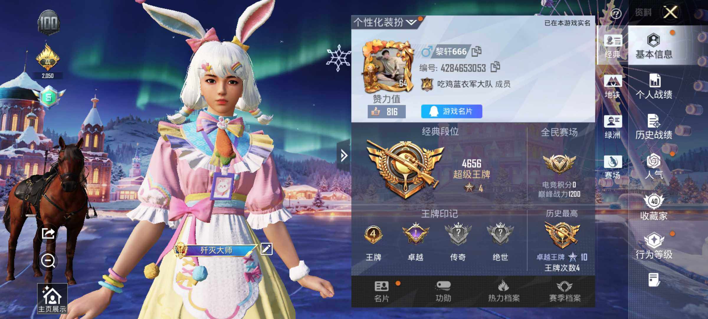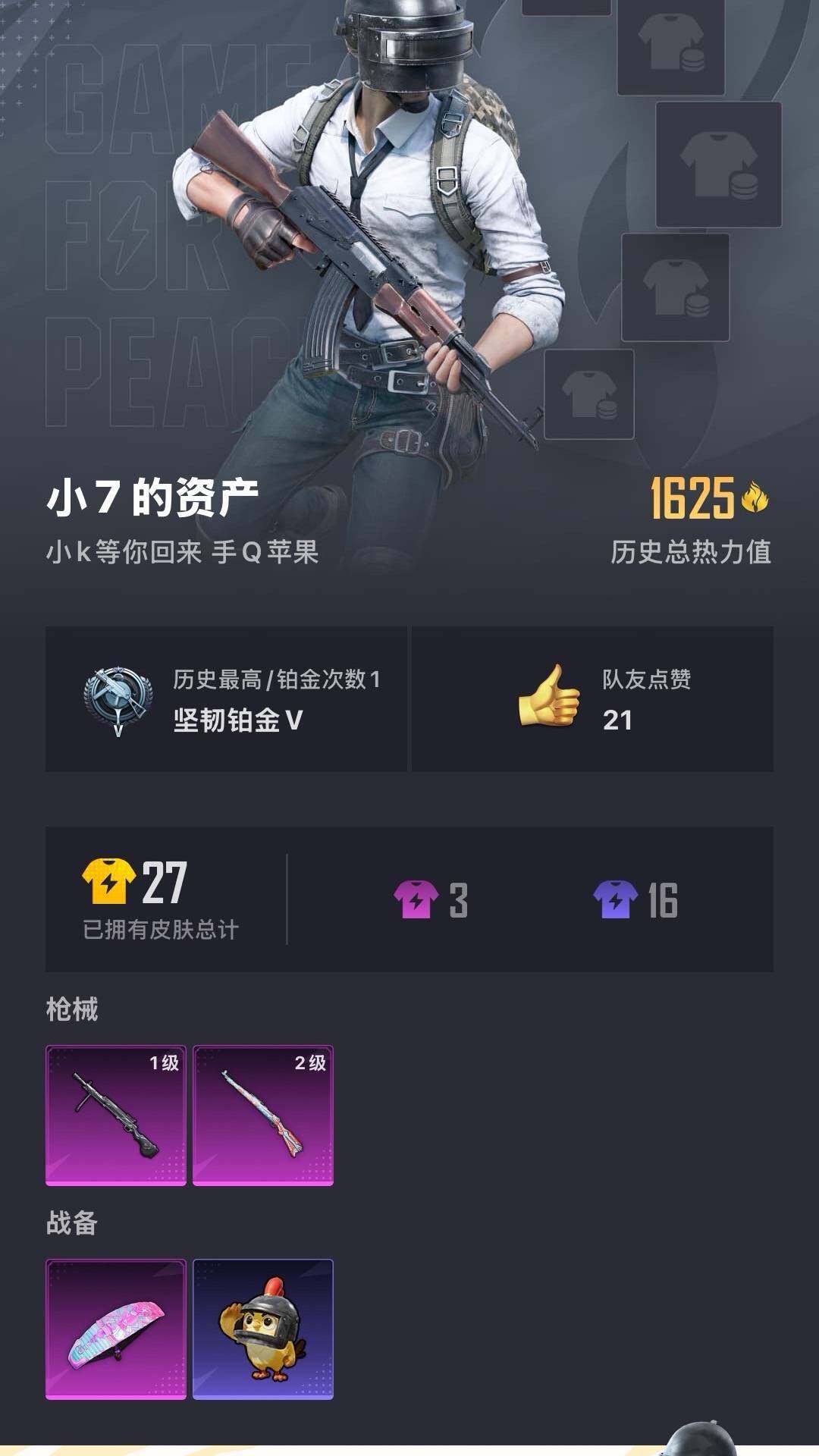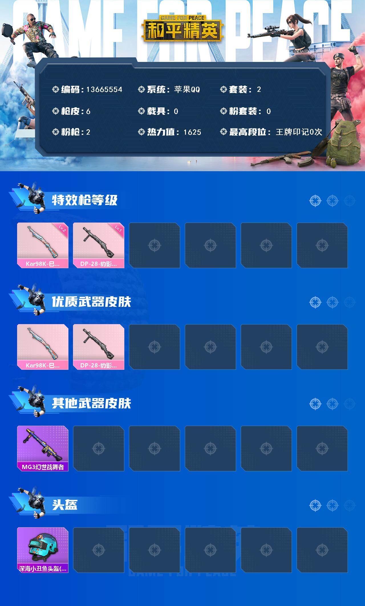 5979-2特效呛-0载具-0粉色飞行器-1625热力值-0王牌印记-2套装-6呛皮 【粉色呛皮等级】:kar98k-巳巳如意二级,dp-28-豹影疾电一级 【粉色呛皮】:kar98k-巳巳如意,dp-28-豹影疾电 【稀有呛皮】:mg3-幻世战舞者 【稀有头盔】:深海小丑鱼头盔3级 【营地id】:1035224996