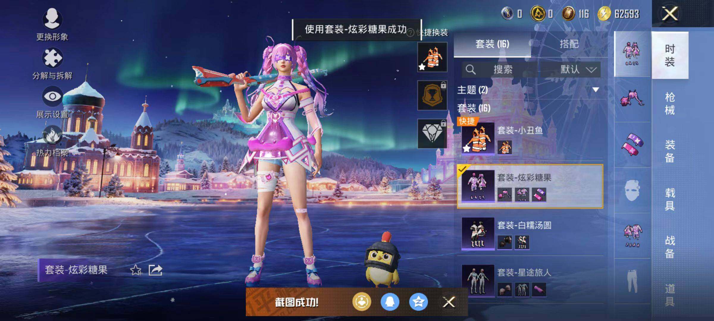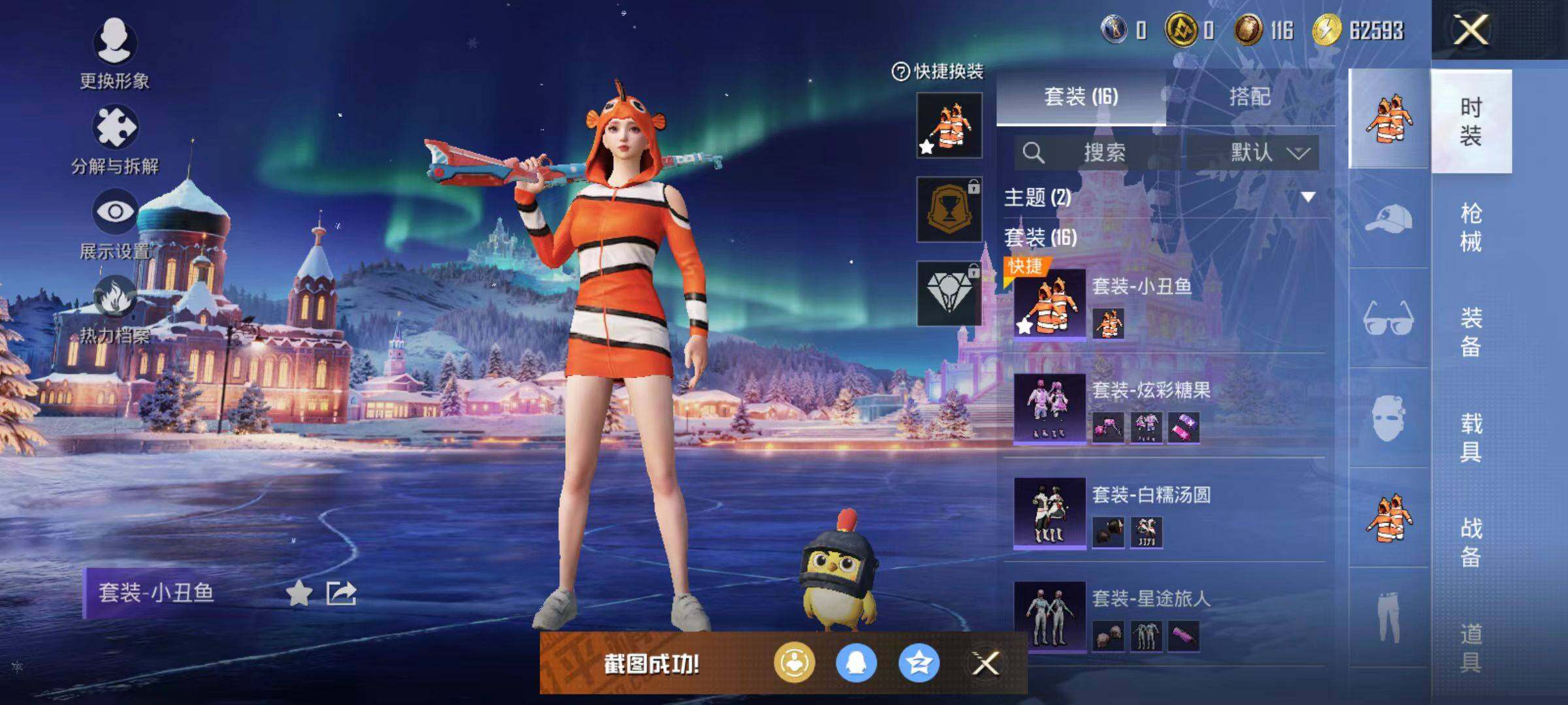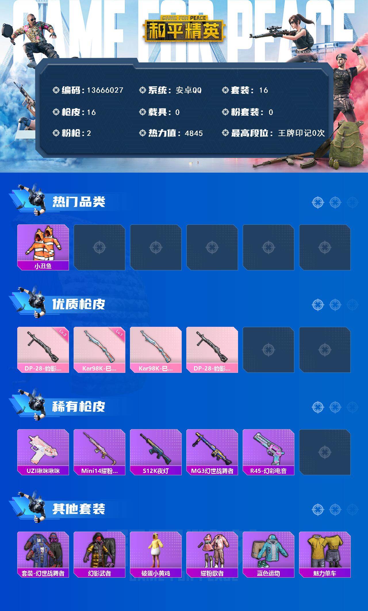 6437【小丑鱼2特效呛1粉色飞行器4845热力值2王牌印记16套装16呛皮】 【热门品类】:套装-小丑鱼 【粉色呛皮】:kar98k-巳巳如意,dp-28-豹影疾电 【粉色降落伞】:炫彩糖果降落伞 【稀有套装】:套装-炫彩糖果 【稀有呛皮】:mini14-耀粉歌者,mg3-幻世战舞者,s12k-夜灯,uzi-啾咪啾咪,aug-冰晶雪宝,r45-幻彩电音 【其他套装】:套装-幻世战舞者,套