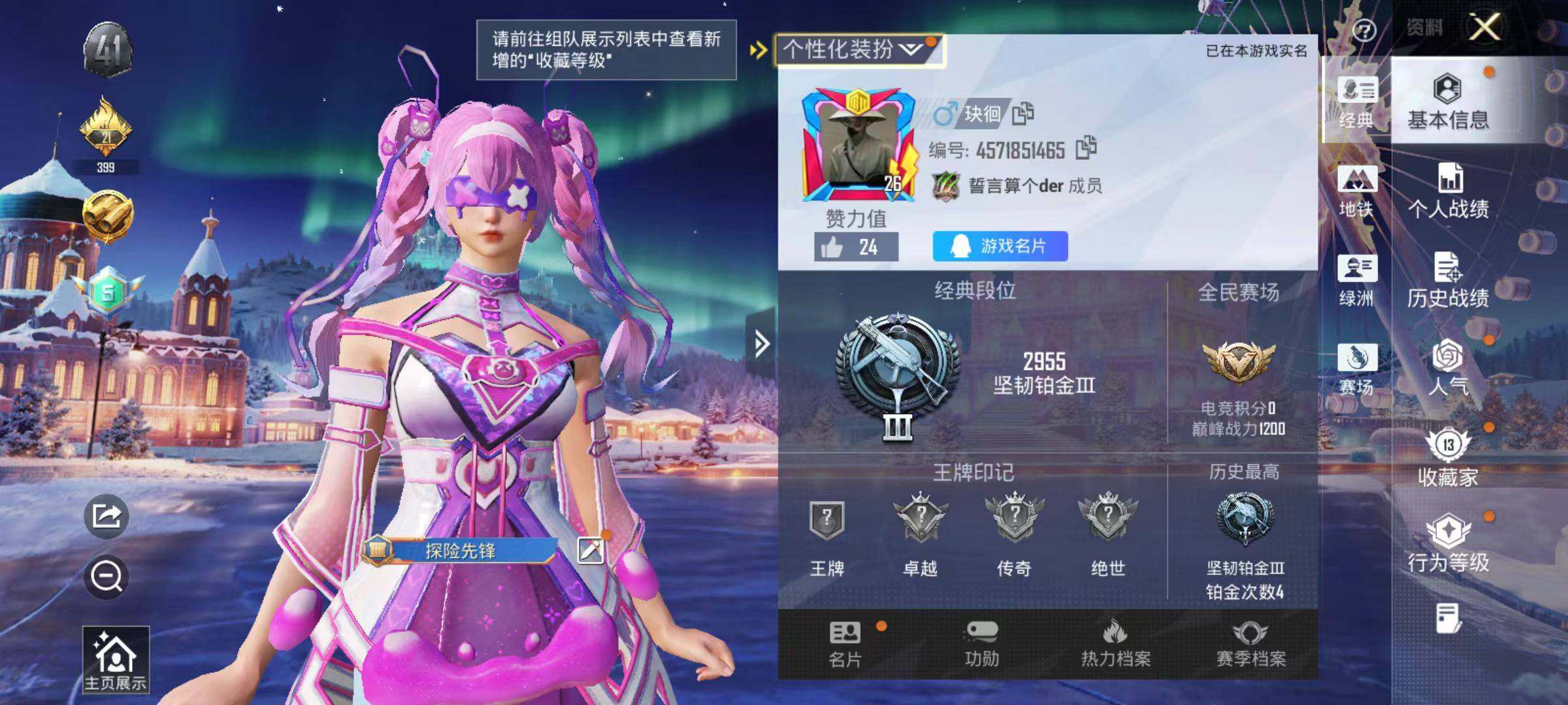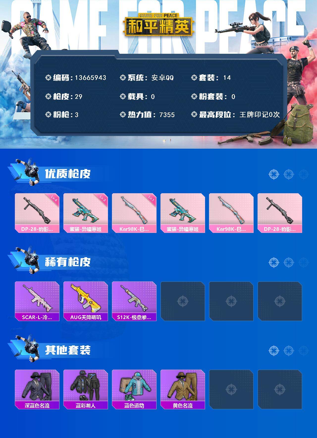 63553特效呛-1粉色飞行器-7355热力值-0王牌印记-14套装-29呛皮 【粉色呛皮】:蜜獾-异瞳寒姬,kar98k-巳巳如意,dp-28-豹影疾电 【粉色降落伞】:炫彩糖果降落伞 【稀有套装】:套装-雪国风尚,套装-炫彩糖果 【稀有呛皮】:aug-天降萌叽,aug-冰晶雪宝,scar-l-冷漠罗丽,s12k-极意拳锋 【其他套装】:套装-深蓝色名流,套装-蓝彩潮人,套装-蓝色运