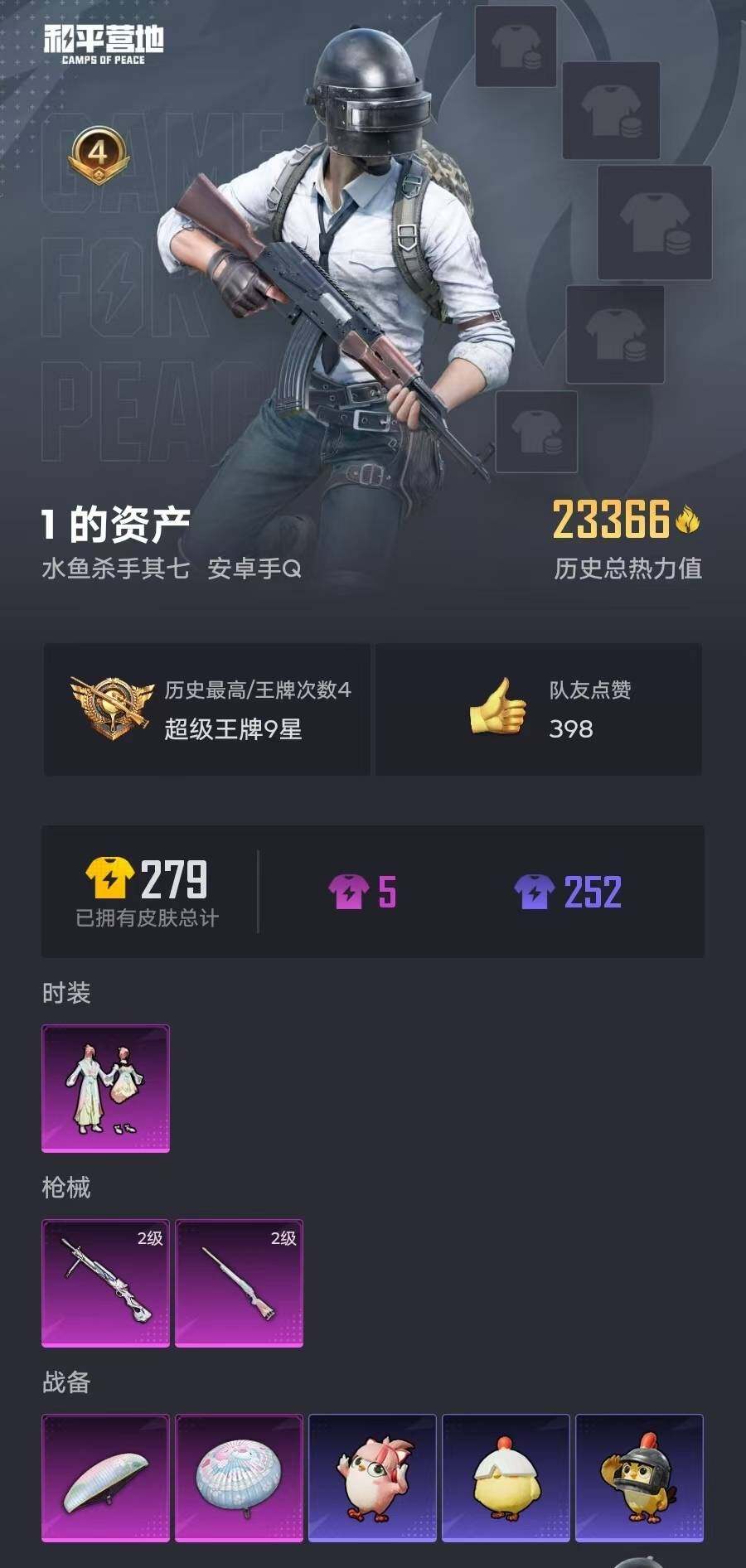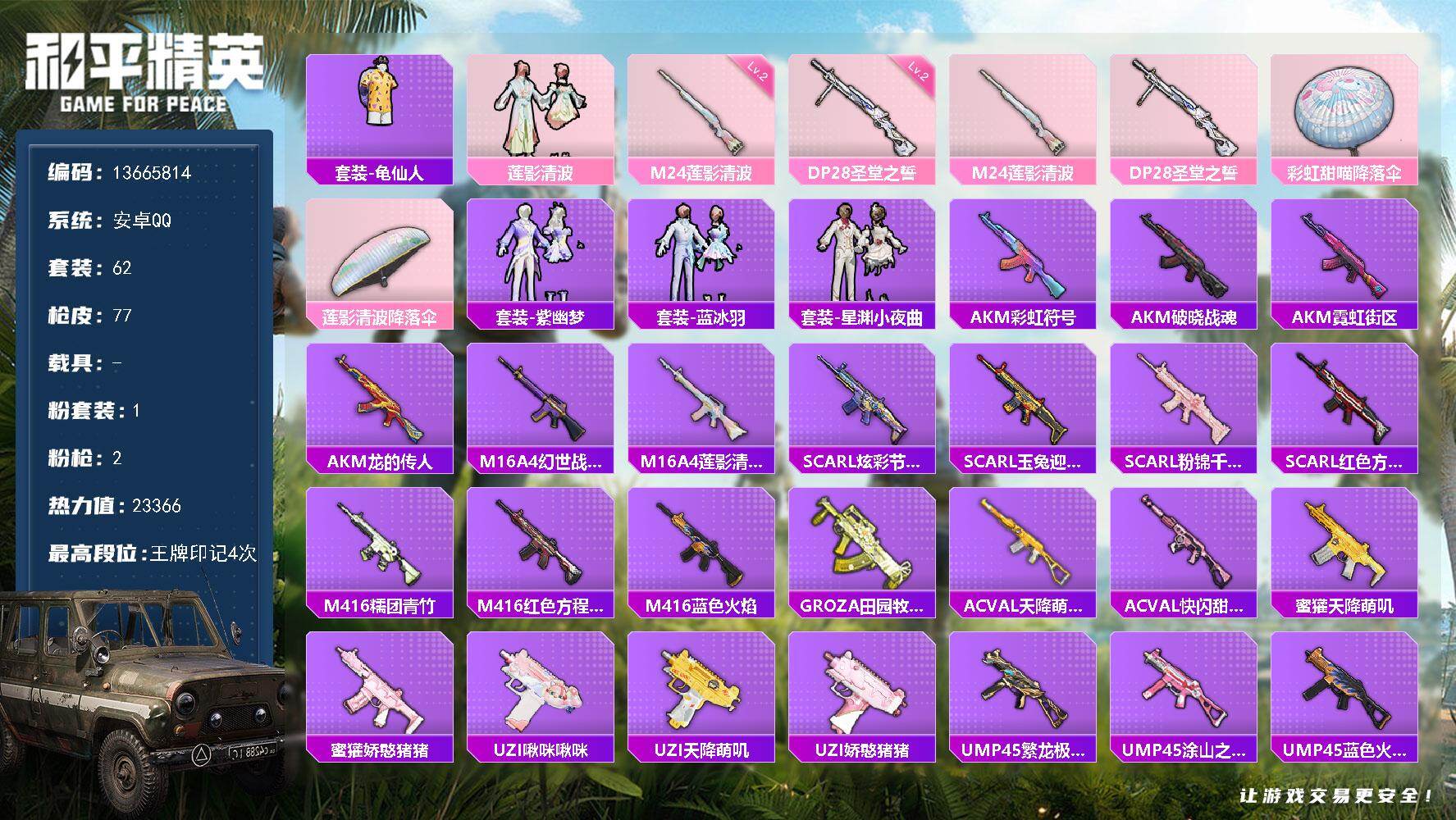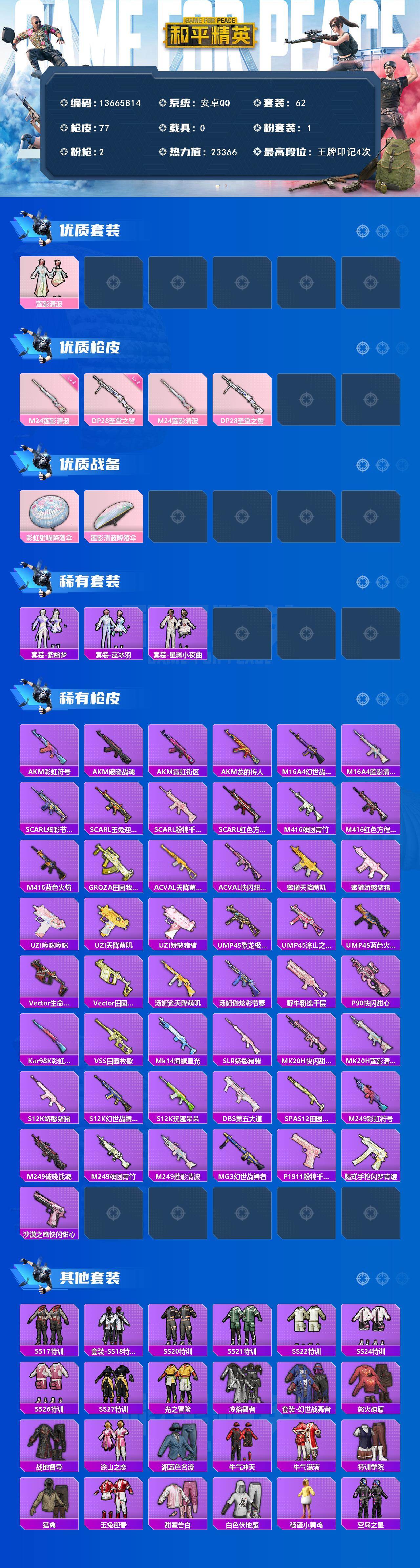 6227-1粉装-2特效呛-0载具-0粉色飞行器-23366热力值-4王牌印记-62套装-77呛皮 【热门品类】:套装-龟仙人 【粉色套装】:粉装-莲影清波 【粉色呛皮等级】:m24-莲影清波二级,dp-28-圣堂之誓二级 【粉色呛皮】:m24-莲影清波,dp-28-圣堂之誓 【粉色降落伞】:彩虹甜喵降落伞,莲影清波降落伞 【稀有套装】:套装-龟仙人,套装-紫幽梦,套装-蓝冰羽,套