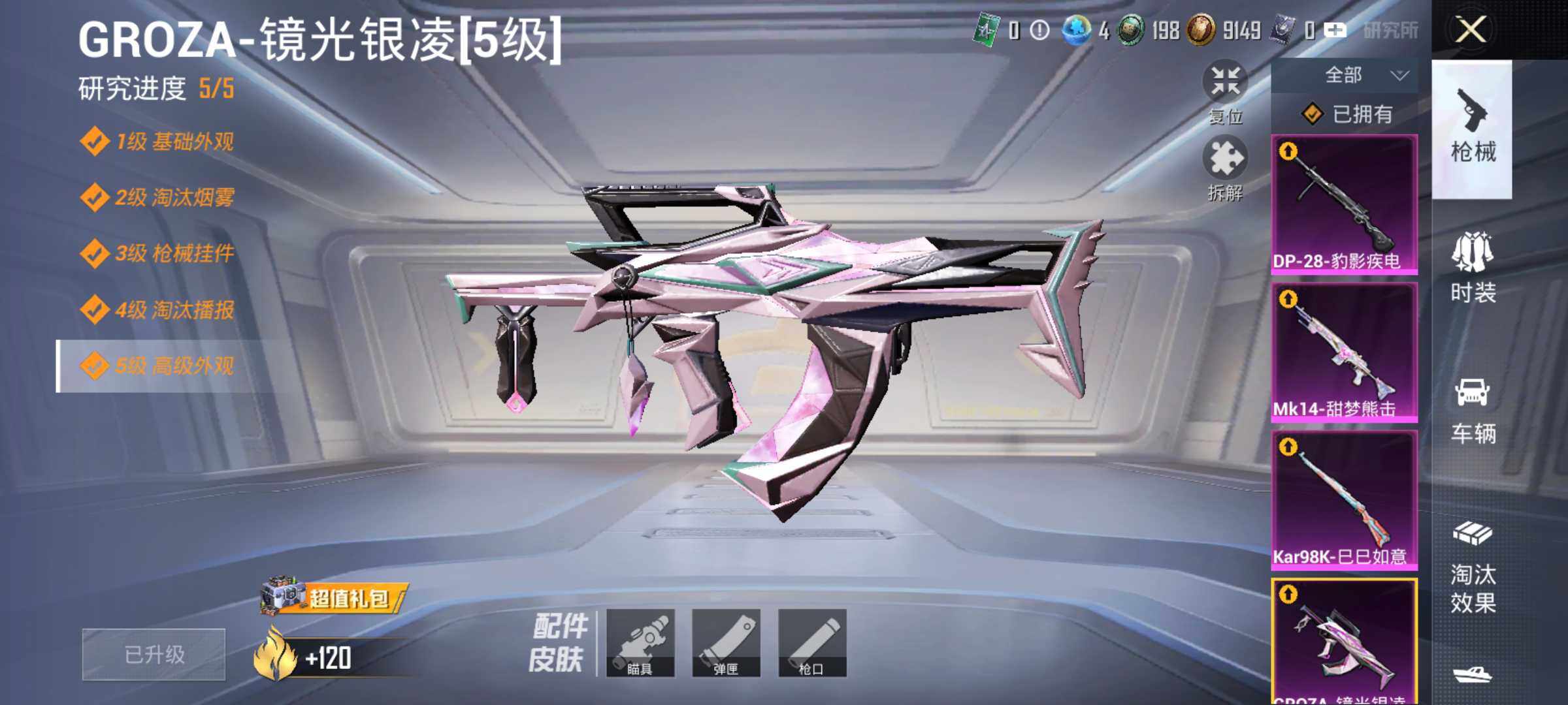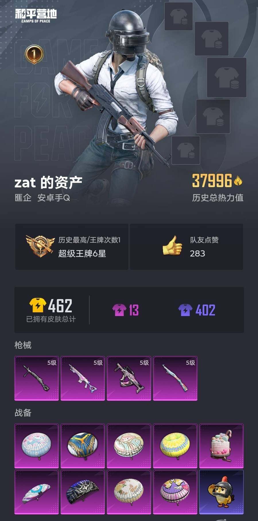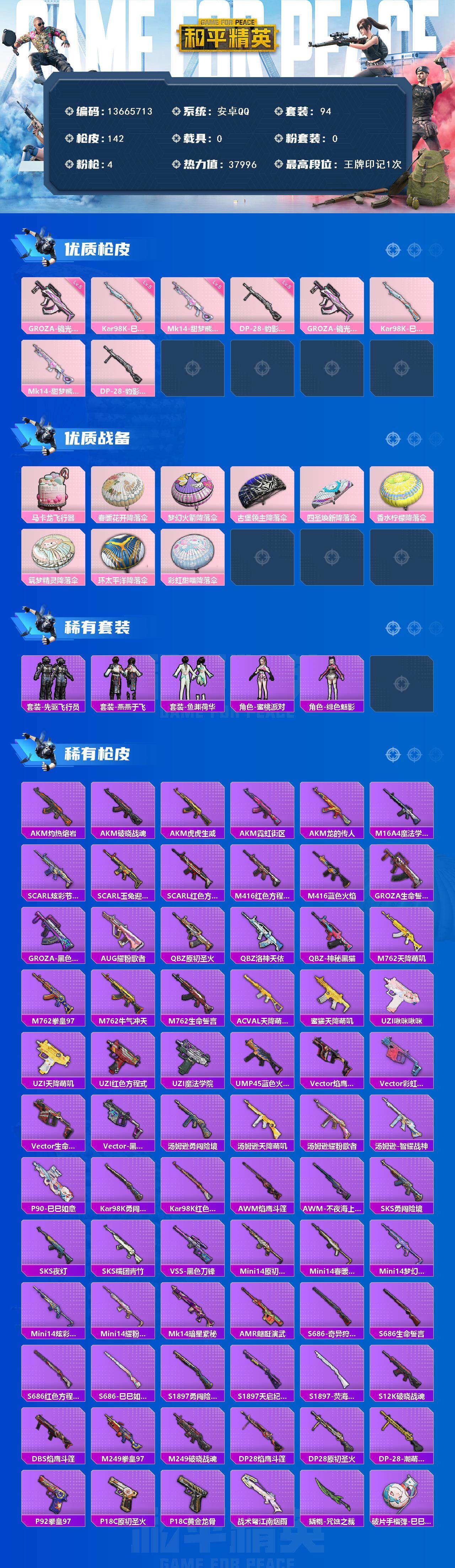 6133-4特效呛-0载具-1粉色飞行器-37996热力值-1王牌印记-94套装-142呛皮 【热门品类】:套装-龟仙人 【粉色呛皮等级】:groza-镜光银凌五级,kar98k-巳巳如意五级,mk14-甜梦熊击五级,dp-28-豹影疾电五级 【粉色呛皮】:groza-镜光银凌,kar98k-巳巳如意,mk14-甜梦熊击,dp-28-豹影疾电 【粉色飞行器】:马卡龙飞行器