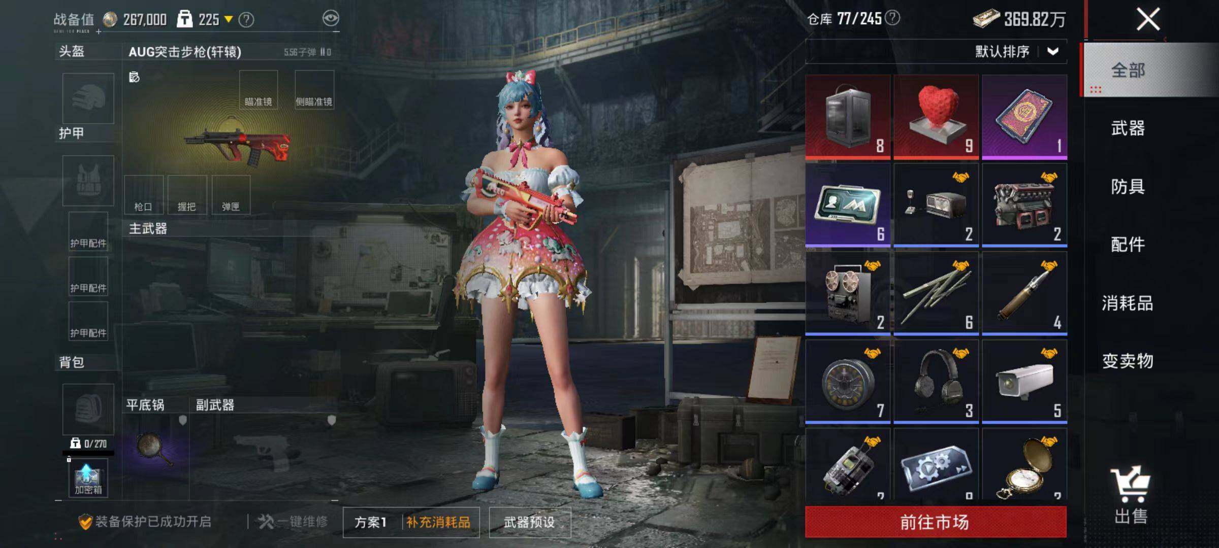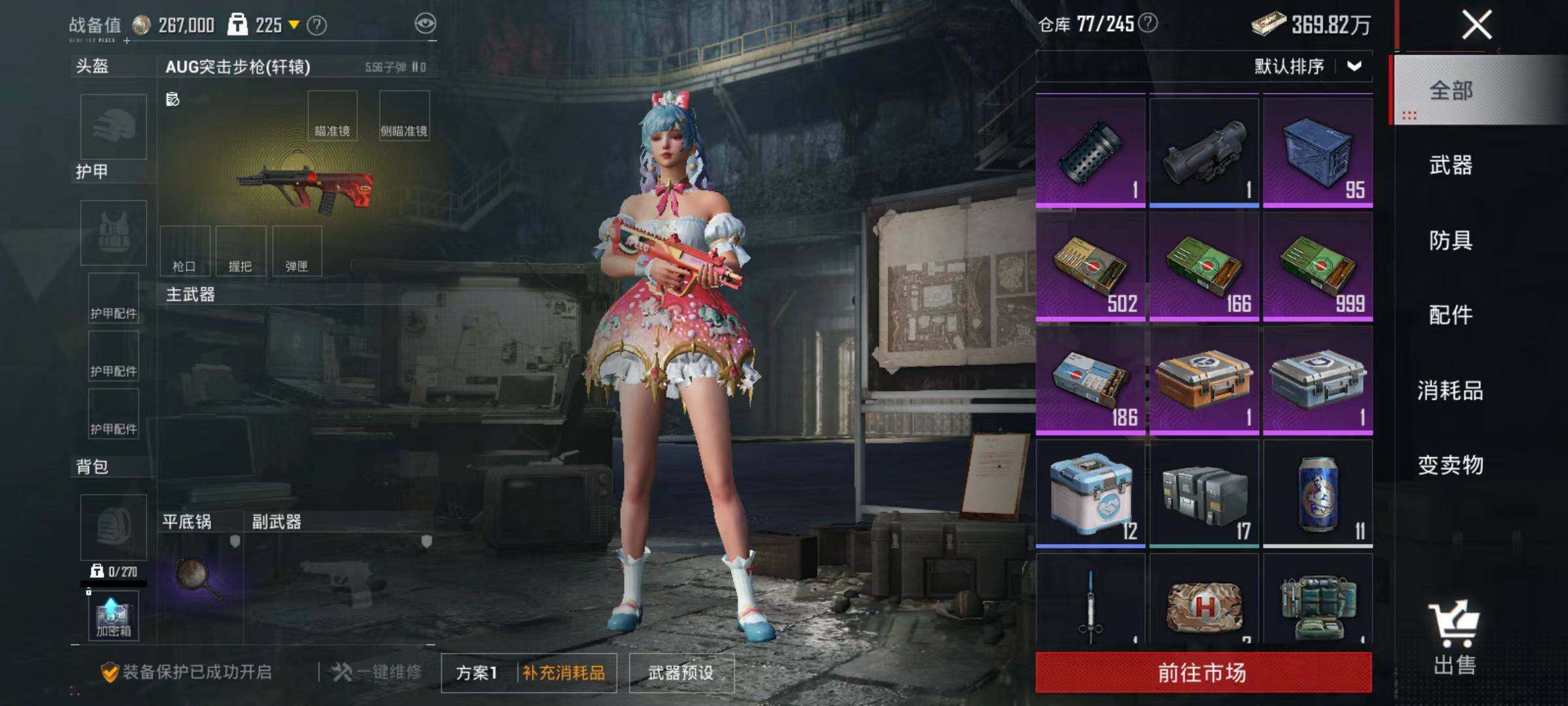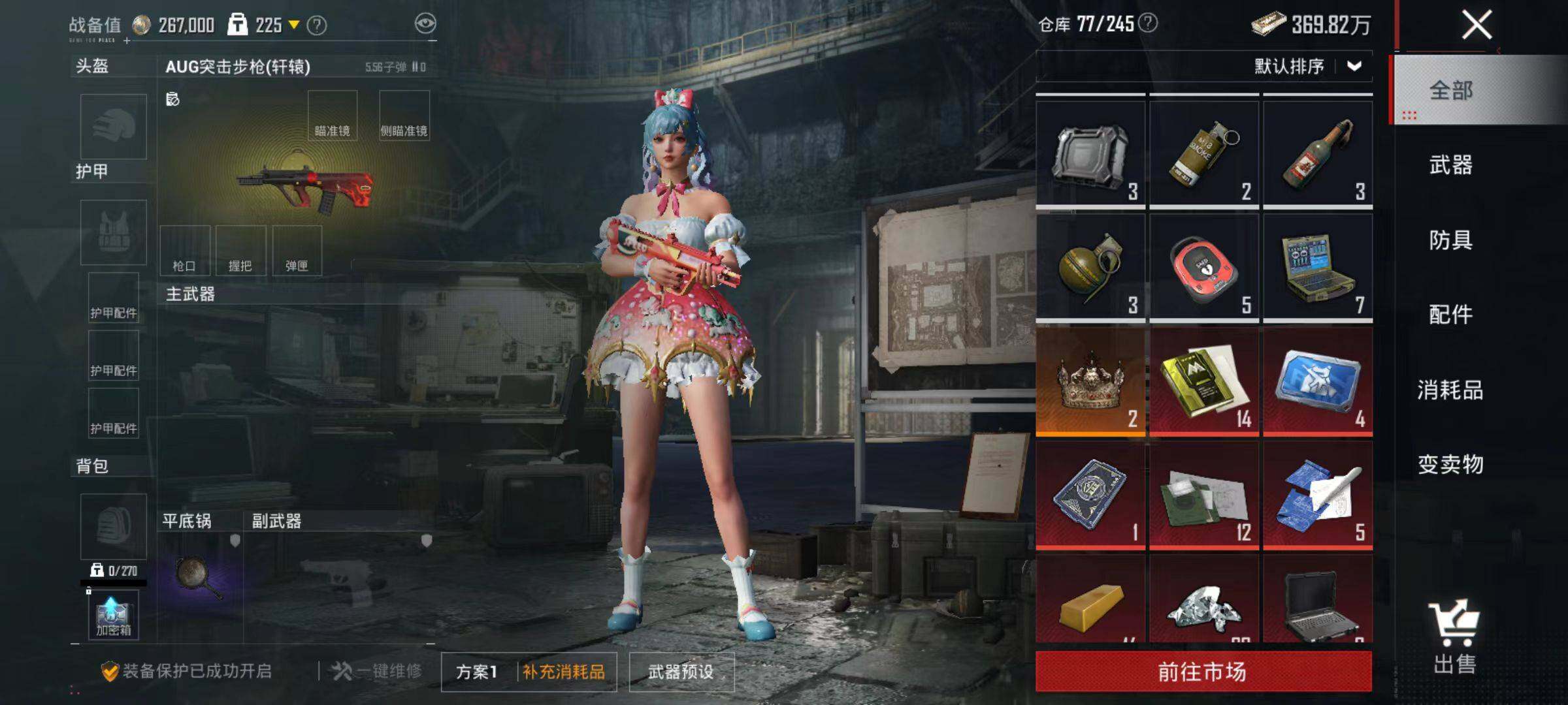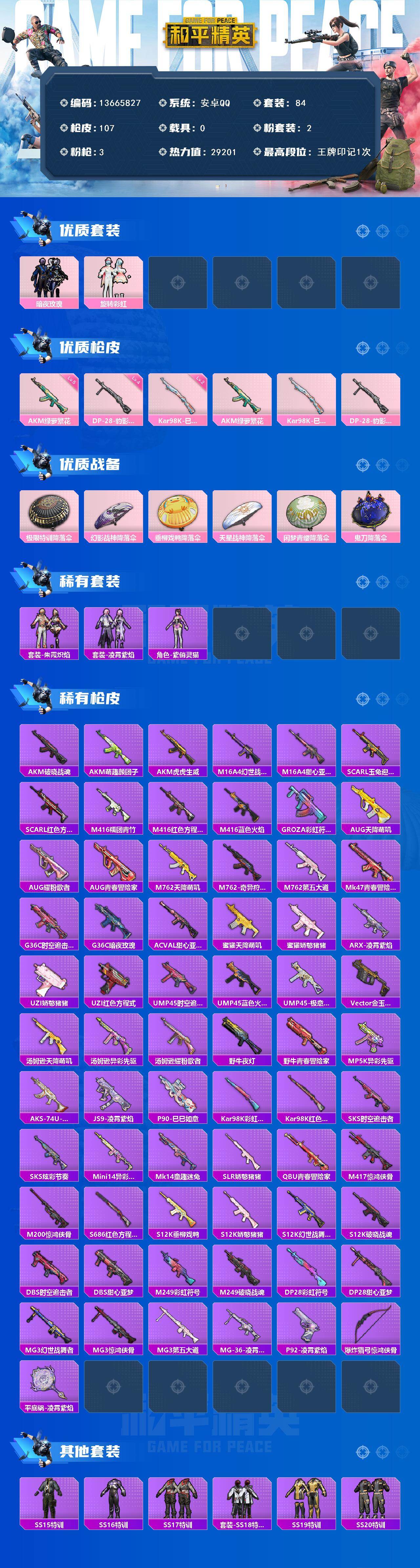6240-2粉装-3特效呛-0载具-0粉色飞行器-29201热力值-1王牌印记-84套装-107呛皮 【热门品类】:套装-浪漫天命 【粉色套装】:粉装-暗夜玫瑰,粉装-旋转彩虹 【粉色呛皮等级】:akm-绿萝繁花五级,kar98k-巳巳如意二级,dp-28-豹影疾电四级 【粉色呛皮】:akm-绿萝繁花,kar98k-巳巳如意,dp-28-豹影疾电 【粉色降落伞】:极限特训降落伞