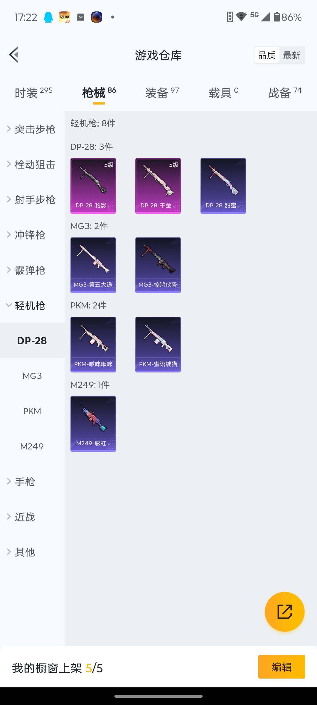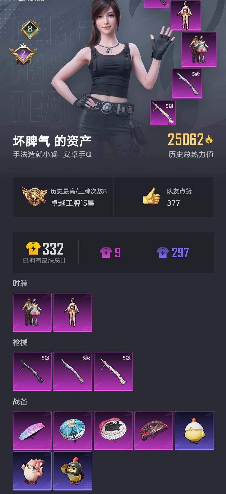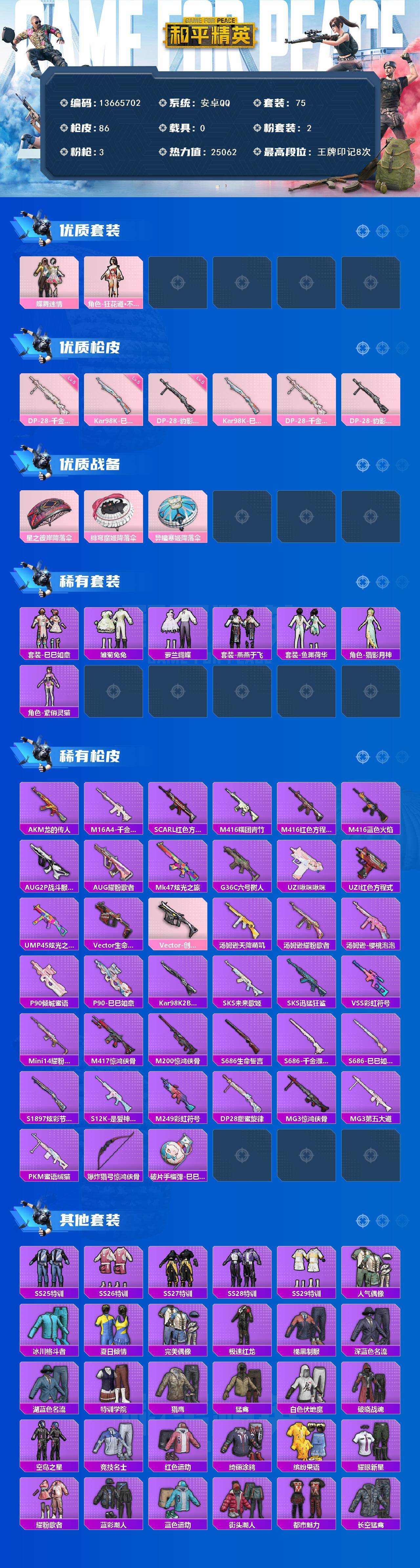 6125-2粉装-3特效呛-0载具-0粉色飞行器-25062热力值-8王牌印记-75套装-86呛皮 【热门品类】:套装-龟仙人 【粉色套装】:粉装-蝶舞迷情,角色-狂花道·不知火舞 【粉色呛皮等级】:kar98k-巳巳如意五级,dp-28-千金淑猫五级,dp-28-豹影疾电五级 【粉色呛皮】:kar98k-巳巳如意,dp-28-千金淑猫,dp-28-豹影疾电 【粉色降落伞】:星