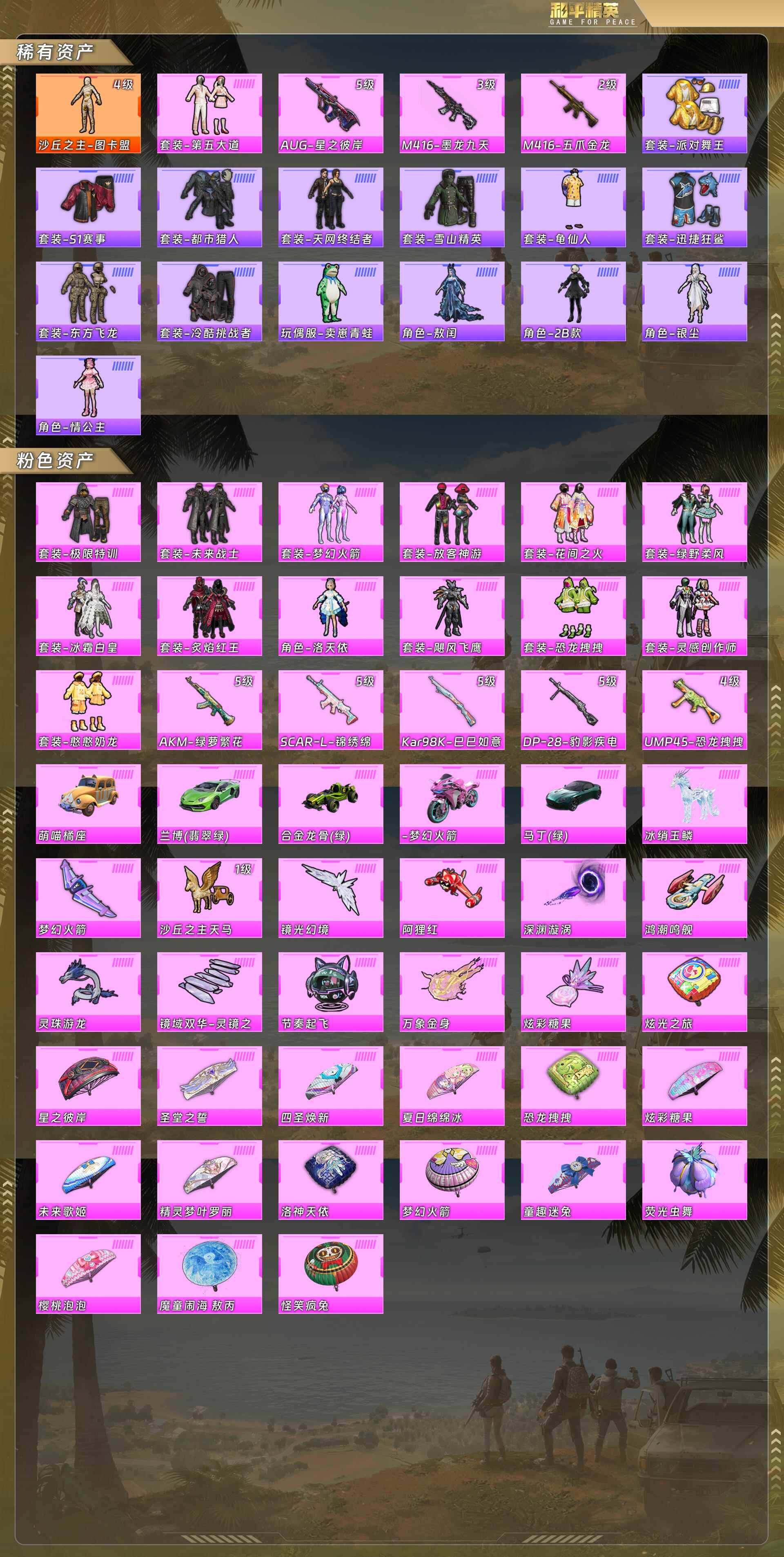 素材号-s1-都市-金鞋-火箭少女-沙丘之主图卡盟4级/地铁满天赋/第五大道/aug星之彼岸5级/m4墨龙九天3级/天网终结者/东方飞龙/冷酷挑战者/卖崽青蛙/敖闰/银尘/情公主/极限特训/未来战士/放客神游/花间之火/绿野柔风/冰霜白皇/洛天依/萌喵橘座/兰博基尼绿/合金龙骨(绿)/双人摩托梦幻火箭/阿斯顿马丁绿/冰绡玉鳞 (1红装-14粉装-8粉呛-6载具)没战神框 hp5404-11粉色飞行器-90139热力值-11王牌印记-208套装-244呛皮 【红色神装等级】:沙丘之主-图卡盟四级 【红色角色神装】:沙丘之主-图卡盟 【热门品类】:粉装-梦幻火箭,套装-s1赛事,套装-都市猎人,套装-派对舞王,套装-小丑鱼,套装-天网终结者,角色-2b战斗服款,套装-龟仙人 【粉色套装】:粉装-极限特训,粉装-未来战士,粉装-梦幻火箭,粉装-放客神游,粉装-花间之火,粉装-冰霜白皇,粉装-炙焰红王,粉装-绿野柔风,粉装-飓风飞鹰,角色-洛天依,粉装-恐龙拽拽,粉装-灵感创作师,粉装-第五大道,粉装-憨憨奶龙 【粉色呛皮等级】:akm-绿萝繁花五级,scar-l-锦绣绵绵五级,m416-五爪金龙二级,m416-墨龙九天三级,aug-星之彼岸五级,ump45-恐龙拽拽四级,kar98k-巳巳如意五级,dp-28-豹影疾电五级 【粉色载具】:兰博基尼aventad svj(翡翠绿),阿斯顿马丁dbs(绿),合金龙骨(绿),萌喵橘座,双人摩托-梦幻火箭,冰绡玉鳞 【粉色呛皮】:akm-绿萝繁花,scar-l-锦绣绵绵,m416-五爪金龙,m416-墨龙九天,aug-星之彼岸,ump45-恐龙拽拽,kar98k-巳巳如意,dp-28-豹影疾电 【粉色飞行器】:梦幻火箭飞行器,阿狸红飞行器,镜光幻境飞行翼,沙丘之主天马,镜域双华-灵镜之阶,深渊漩涡飞行器,万象金身飞行器,灵珠游龙飞行器 【粉色降落伞】:梦幻火箭降落伞,四圣焕新降落伞,荧光虫舞降落伞,夏日绵绵冰降落伞,童趣迷兔降落伞,星之彼岸降落伞,怪笑疯兔降落伞,洛神天依降落伞,恐龙拽拽降落伞,未来歌姬降落伞,炫光之旅降落伞,圣堂之誓降落伞,精灵梦叶罗丽降落伞,樱桃泡泡降落伞,魔童闹海 敖丙降落伞,炫彩糖果降落伞 【稀有套装】:套装-龟仙人,套装-巳巳如意,套装-炫彩糖果,套装-雏菊兔兔,套装-萝兰蝴蝶,套装-小熊娃娃,角色-狂花道·娜可露露,套装-糖糖葫芦,套装-青团波波,套装-棉花软糖,套装-燕燕于飞,套装-鱼渊荷华,角色-糖霜甜心,角色-蜜桃派对,套装-彩虹兔,套装-云朵鹅,套装-雪绒豹,套装-朱霞炽焰,套装-凌霄紫焰,套装-擎苍青焰,角色-敖闰 【稀有呛皮】:akm-夜灯,akm-影袭,akm-恐龙拽拽,akm-星之彼岸,akm-破晓战魂,akm-萌趣颜团子,akm-虎虎生威,akm-霓虹街区,akm-龙的传人,m16a4-幻世战舞者,m16a4-生命誓言,scar-l-炫彩节奏,scar-l-黄金龙骨,m416-糯团青竹,m416-绯红前夜,m416-蓝色火焰,groza-2b战斗服款,groza-影袭,groza-恐龙拽拽,groza-懵萌河马,aug-终结者,aug-耀粉歌者,q-彩虹符号,q-洛神天依,m762-牛气冲天,m762-瑞龙福将,m762-绯红前夜,m762-诡娃娃,m762-镭射皇者,m762-云朵鹅,mk47-洛神天依,mk47-炫光之旅,g36c-懵萌河马,ac-val-快闪甜心,蜜獾-天降萌叽,famas-镜域双华,famas-墨龙九天,arx-凌霄紫焰,uzi-啾咪啾咪,uzi-天降萌叽,uzi-影袭,uzi-炫彩节奏,uzi-红色方程式,uzi-盛世惊鸿,ump45-春暖花开,ump45-涂山之恋,ump45-炫光之旅,ump45-蓝色火焰,ump45-金玉无双,vect-焰鹰斗篷,vect-彩虹符号,vect-田园牧歌,汤姆逊-天降萌叽,汤姆逊-炫彩节奏,汤姆逊-耀粉歌者,汤姆逊-樱桃泡泡,野牛-沙丘之主,js9-凌霄紫焰,p90-快闪甜心,p90-飞驰魅影,p90-巳巳如意,kar98k-2b战斗服款,kar98k-彩虹符号,kar98k-影袭,kar98k-梦幻火箭,kar98k-洛神天依,kar98k-红色方程式,m24-影袭,m24-拂晓神骑,m24-未来战士,m24-樱桃泡泡,awm-焰鹰斗篷,awm-圣堂之誓,awm-恐龙拽拽,awm-盛世惊鸿,sks-心之恋语,sks-炫彩节奏,sks-迅猛狂鲨,sks-金玉无双,vss-彩虹符号,vss-星之彼岸,vss-未来战士,vss-镭射皇者,mini14-梦幻火箭,mini14-涂山之恋,mini14-炫彩节奏,mini14-耀粉歌者,mk14-童趣迷兔,win94-瑞龙福将,slr-四圣焕新,slr-葫芦兄弟,莫辛纳甘-懵萌河马,m417-惊鸿侠骨,mk20-h-快闪甜心,mk20-h-樱桃泡泡,m200-惊鸿侠骨,svd-云朵鹅,mk12-金蛇镇世,s686-彩虹符号,s686-红色方程式,s686-终结者,s686-巳巳如意,s1897-镭射皇者,s12k-玩趣呆呆,s12k-瑞龙福将,s12k-香水柠檬,dbs-焰鹰斗篷,dbs-圣堂之誓,dbs-彩虹符号,dbs-第五大道,spas-12-田园牧歌,spas-12-云朵鹅,m249-四圣焕新,m249-星之彼岸,m249-沙丘之主,m249-镭射皇者,dp-28-焰鹰斗篷,dp-28-彩虹符号,dp-28-甜蜜旋律,mg3-惊鸿侠骨,mg3-摩登王国,mg3-瑞龙福将,mg3-第五大道,pkm-懵萌河马,mg-36-凌霄紫焰,p92-凌霄紫焰,p18c-镜光幻境,沙墨之鹦-快闪甜心,沙墨之鹦-云朵鹅,爆炸猎弓-惊鸿侠骨,大砍刀-2p战斗服款,大砍刀-云朵鹅,平底锅-凌霄紫焰,破片手留单-巳巳如意 【其他套装】:套装-s2赛事,套装-ss8特训,套装-ss9特训,套装-ss11特训,套装-ss12特训,套装-ss13特训,套装-ss14特训,套装-ss15特训,套装-ss16特训,套装-ss17特训,套装-ss24特训,套装-ss25特训,套装-ss26特训,套装-ss27特训,套装-ss28特训,套装-ss29特训,套装-人气偶像,套装-军械专家,套装-冷焰舞者,套装-千禧之恋,套装-半糖蓝莓,套装-完美偶像,套装-幻影武者,套装-怒火燎原,套装-旭日情侣,套装-极速红龙,套装-格斗先锋,套装-森林游猎者,套装-沙漠兵团,套装-沙漠雄狮,套装-海岛探路者,套装-涂山之恋,套装-深蓝色名流,套装-湖蓝色名流,套装-滨海假日,套装-滨海厨神,套装-灰色格斗者,套装-灼焰舞者,套装-热血青春,套装-燃烧卡路里,套装-牛气满满,套装-特战装甲,套装-特种颜团子,套