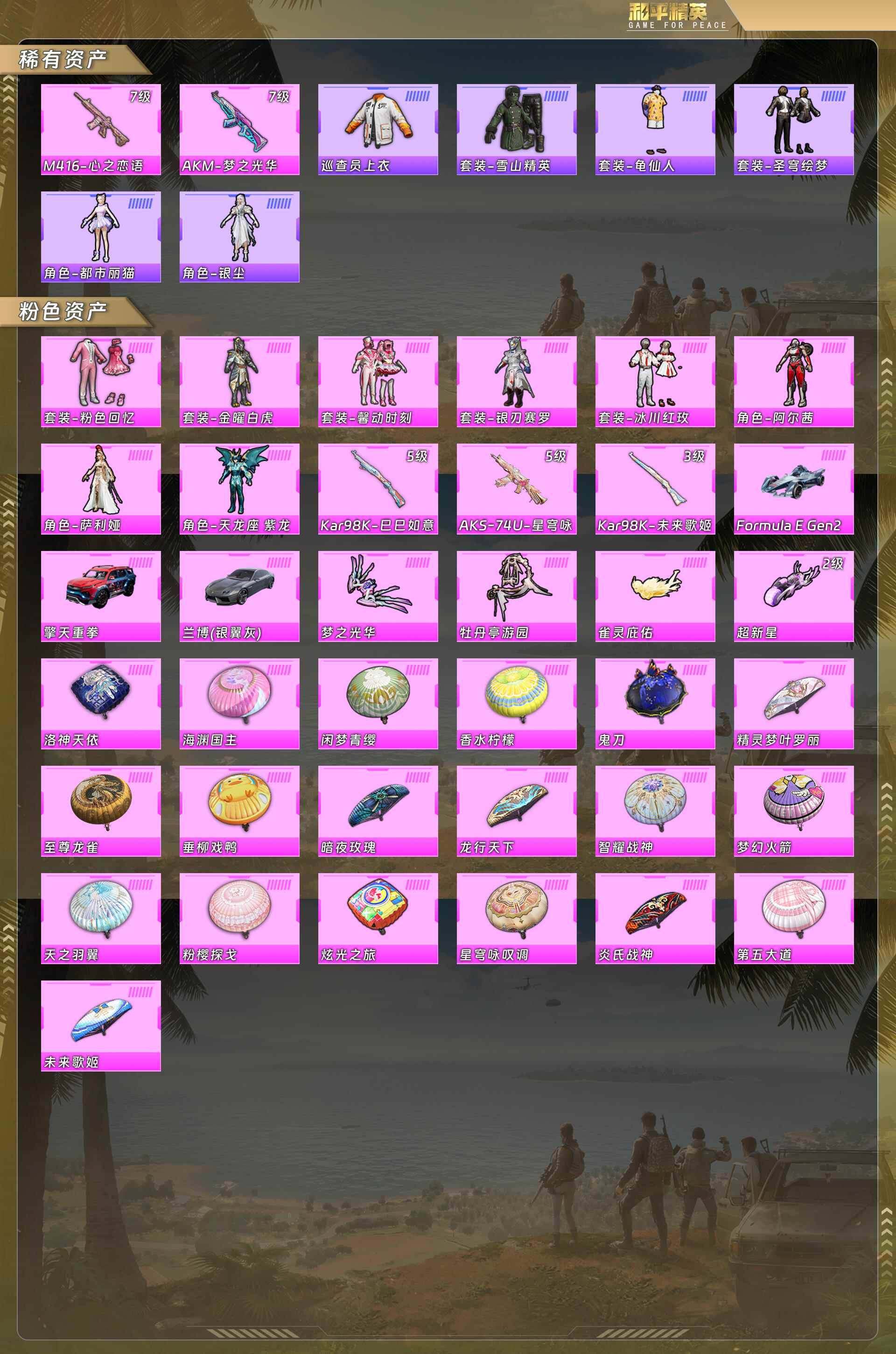 公主号-巡查衣-m4心之恋语7级/ak梦之光华7级/圣穹绘梦/都市丽猫/银尘/粉色回忆/金曜白虎/馨动时刻/银刃赛罗/冰川红玫/阿尔茜/萨利娅/天龙座紫龙/98k巳巳如意5级/aks74u星穹咏叹调5级/98k未来歌姬3级/fmulagen2兰/擎天重拳/兰博基尼灰(8粉装-5粉呛-3载具)没战神框 hp5431-4粉色飞行器-87479热力值-12王牌印记-190套装-280呛皮 【热门品类】:绝对防御上衣,套装-金羽特工,角色-忠真马岱,套装-龟仙人 【粉色套装】:粉装-粉色回忆,粉装-金曜白虎,粉装-银刃赛罗,粉装-馨动时刻,粉装-冰川红玫,角色-阿尔茜,角色-萨利娅,角色-天龙座 紫龙 【粉色呛皮等级】:akm-梦之光华七级,m416-心之恋语七级,aks-74u-星穹咏叹调五级,kar98k-未来歌姬三级,kar98k-巳巳如意五级 【粉色载具】:兰博基尼estoque(银翼灰),擎天重拳,fmula e gen2(巅峰兰) 【粉色呛皮】:akm-梦之光华,m416-心之恋语,aks-74u-星穹咏叹调,kar98k-未来歌姬,kar98k-巳巳如意 【粉色飞行器】:梦之光华飞行器,超新星飞行器,雀灵庇佑飞行器 【粉色降落伞】:至尊龙雀降落伞,梦幻火箭降落伞,香水柠檬降落伞,暗夜玫瑰降落伞,洛神天依降落伞,海渊国主降落伞,天之羽翼降落伞,垂柳戏鸭降落伞,第五大道降落伞,炎氏战神降落伞,未来歌姬降落伞,粉樱探戈降落伞,闲梦青缨降落伞,炫光之旅降落伞,龙行天下降落伞,精灵梦叶罗丽降落伞,鬼刀降落伞,智耀战神降落伞,星穹咏叹调降落伞 【稀有套装】:套装-龟仙人,套装-巳巳如意,套装-圣穹绘梦,套装-雪国风尚,套装-糖糖葫芦,套装-青团波波,角色-都市丽猫,套装-燕燕于飞,套装-鱼渊荷华,角色-蜜桃派对,角色-冰晶湖光,套装-紫幽梦,套装-蓝冰羽,角色-瑰梦爱神,套装-极速光影,套装-云朵鹅,套装-雪绒豹,套装-画境星梦,套装-琴音绮想 【稀有呛皮】:akm-夜灯,akm-彩虹符号,akm-灼热熔岩,akm-玉龙,akm-破晓战魂,akm-萌趣颜团子,akm-虎虎生威,akm-霓虹街区,akm-龙的传人,m16a4-夜灯,m16a4-幻世战舞者,m16a4-红色方程式,m16a4-蓝色火焰,scar-l-暗夜玫瑰,scar-l-炫彩节奏,scar-l-玉兔迎春,scar-l-王牌四分卫,scar-l-甜蜜旋律,scar-l-粉锦千层,scar-l-红色方程式,scar-l-黄金龙骨,m416-夜灯,m416-糯团青竹,m416-红色方程式,m416-绯红前夜,m416-蓝色火焰,groza-2b战斗服款,groza-彩虹符号,groza-懵萌河马,groza-治愈之星,groza-甜蜜草莓,groza-生命誓言,aug-冰川粉黛,aug-耀粉歌者,aug-青春冒险家,q-原初圣火,q-彩虹符号,q-未来歌姬,q-神秘黑猫,m762-天星战神,m762-天降萌叽,m762-奇异狩猎者,m762-彩虹符号,m762-拳皇97,m762-暗夜鎏金,m762-牛气冲天,m762-瑞龙福将,m762-绯红前夜,m762-云朵鹅,mk47-摩登王国,mk47-青春冒险家,g36c-不夜海上花,g36c-懵萌河马,g36c-星穹咏叹调,ac-val-天降萌叽,ac-val-快闪甜心,ac-val-闲梦青缨,蜜獾-天降萌叽,ace32-画境星梦,uzi-众神之王,uzi-啾咪啾咪,uzi-天降萌叽,uzi-炫彩节奏,uzi-红色方程式,uzi-盛世惊鸿,ump45-夜灯,ump45-怪兽之王,ump45-春暖花开,ump45-生命誓言,ump45-蓝色火焰,ump45-圣穹绘梦,vect-夜灯,vect-彩虹符号,vect-暗夜玫瑰,vect-治愈之星,vect-生命誓言,vect-龙行天下,汤姆逊-天降萌叽,汤姆逊-炫彩节奏,汤姆逊-耀粉歌者,野牛-沙丘之主,野牛-青春冒险家,mp5k-众神之王,mp5k-画境星梦,p90-倾城蜜语,p90-快闪甜心,p90-巳巳如意,kar98k-2b战斗服款,kar98k-彩虹符号,kar98k-欢乐麻酱,kar98k-红色方程式,kar98k-诡娃娃,m24-治愈之星,m24-炫彩节奏,m24-众神之王,m24-冰封烈焰,awm-不夜海上花,awm-王牌四分卫,awm-盛世惊鸿,sks-夜灯,sks-心之恋语,sks-未来歌姬,sks-炫彩节奏,sks-圣域龙灵,vss-碧影闪光,mini14-原初圣火,mini14-炫彩节奏,mini14-穿刺龙虾,mini14-耀粉歌者,mini14-金鼠迎春,mk14-治愈之星,mk14-纯梦嫁纱,win94-瑞龙福将,slr-众神之王,slr-圣穹绘梦,qbu-不夜海上花,qbu-青春冒险家,莫辛纳甘-懵萌河马,amr-妙红点点,m417-惊鸿侠骨,mk20-h-快闪甜心,m200-惊鸿侠骨,m200-酷泡奶龙,svd-云朵鹅,m1加兰德-画境星梦,s686-不夜海上花,s686-冰封烈焰,s686-生命誓言,s686-红色方程式,s686-巳巳如意,s12k-玩趣呆呆,s12k-瑞龙福将,s12k-破晓战魂,s12k-夜幕颂歌,s12k-夜灯,s12k-幻世战舞者,dbs-彩虹符号,dbs-第五大道,dbs-幻彩电音,aa12-g-萌物绒绒,aa12-g-画境星梦,spas-12-云朵鹅,m249-彩虹符号,m249-拳皇97,m249-星之彼岸,m249-破晓战魂,m249-糯团青竹,dp-28-原初圣火,dp-28-彩虹符号,mg3-幻世战舞者,mg3-惊鸿侠骨,mg3-瑞龙福将,pkm-懵萌河马,p92-拳皇97,p1911-冰封烈焰,r1895-六号树人,r1895-棋盘冕主,p18c-原初圣火,短管霰弹-星穹咏叹调,沙墨之鹦-快闪甜心,沙墨之鹦-云朵鹅,沙墨之鹦-圣穹绘梦,tmp-9-未来歌姬,十子怒-绒兔团圆,爆炸猎弓-天星战神,爆炸猎弓-惊鸿侠骨,大砍刀-云朵鹅,平底锅-画境星梦,破片手留单-绯果甜心,破片手留单-巳巳如意 【其他套装】:套装-ss4特训,套装-ss5特训,套装-ss6特训,套装-ss7特训,套装-ss8特训,套装-ss9特训,套装-ss10特训,套装-ss11特训,套装-ss12特训,套装-ss13特训,套装-ss14特训,套装-ss15特训,套装-ss16特训,套装-ss17特训,套装-ss18特训,套装-ss19特训,套装-ss20特训,套装-ss21特训,套装-ss22特训,套装-ss23特训,套装-ss24特训,套装-ss25特训,套装-ss26特训,套装-ss27特训,套装-ss28特训,套装-ss29特训,套装-丛林猎人,套装-传奇侦探,套装-光之冒险,套装-军械专家,套装-冰川格斗者,套装-冷焰舞者,套装-北国孤狼,套装-千禧之恋,套装-吉莉礼服,套装-夏日音浪,套装-完美偶像,套装-幻世战舞者,套装-怒火燎原,套装-恋恋初桃,套装-拳皇97八神庵,套装-探宝勇士,套装-旭日情侣,套