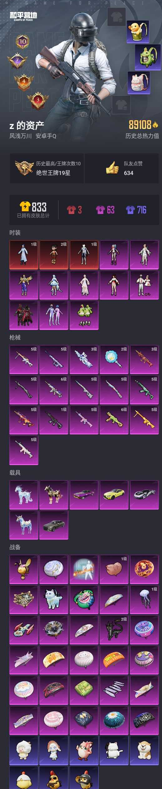 【和平精英】【lyhp21072】10粉装,16特效呛,7载具,历史最高段位:绝世王牌19星 王牌印记10次 热力值:89108,147套装,234呛械,296装备,123战备;套装:魔童闹海-哪吒,魔童闹海-敖丙,灵猫魔法师-塞维尔,套装-梦幻火箭,套装-炙焰红王,套装-恐龙拽拽,套装-冰川红玫,角色-小可学妹,角色-烟云彩露,角色-光极星,角色-美琪,角色-月影灵韵,角色-狂魅哈莉,套装-特训学院,套装-红色运动,套装-黄色运动,套装-竞技名士,套装-深蓝色名流,套装-长空猛禽,套装-竞技勇士朋克,套装-六六大吉,套装-冷焰舞者,套装-特战装甲,套装-贵族骑装,套装-青春校园,套装-灰色格斗者,套装-甜蜜告白,套装-完美偶像,套装-幻影武者,套装-蓝彩潮人,套装-魅力单车,套装-耀眼新星,套装-坚韧舞者,套装-竞技达人朋克,套装-夜莺强袭者,套装-破晓战魂,套装-热血青春,套装-沙漠兵团,套装-雪山精英,套装-传奇侦探,套装-幻世战舞者,套装-缤纷果语,套装-龙魂突击队,套装-极速红龙,套装-ss3特训,套装-ss4特训,套装-破蛋小黄鸡,套装-疯狂小兔子,套装-ss5特训,套装-圣诞大吉,套装-好奇恐龙,套装-北国孤狼,套装-ss6特训,套装-跃动心情,套装-ss7特训,套装-鹤鸣,套装-ss10特训,套装-ss8特训,套装-众神之王,套装-智慧之神,套装-软萌银虎,套装-pel摇滚竞梦者,套装-ss9特训,套装-安第斯皇冠,套装-牛气满满,套装-ss11特训,套装-战术大师,套装-ss12特训,套装-牛气冲天,套装-ss18特训,套装-耀粉歌者,套装-热情海星,套装-纯真浪花,套装-吉莉礼服,套装-鹤发童颜,套装-ss17特训,套装-豚鼠丹丹,角色-军刀雅典娜,套装-ss19特训,套装-ss20特训,套装-ss21特训,套装-玉兔迎春,套装-ss22特训,套装-绯格组合,套装-ss23特训,角色-孙悟空,套装-莱茵河畔,套装-青玉碎影,套装-ss24特训,套装-龟仙人,套装-ss25特训,套装-元气发射,套装-香桃花海,套装-龙的传人,套装-冰河战士,套装-ss26特训,套装-空岛之星,套装-童真绒兔,套装-萌趣绒叽,套装-焰鹰斗篷,套装-幽夜迷踪,套装-幻羽潜行,套装-ss27特训,套装-老实芭蕉,套装-ss28特训,角色-湖雨初晴,角色-听雨铃兰,角色-迎夏光舞,角色-极地流光,角色-粉雾星云,角色-情公主,角色-银尘,角色-8号机,角色-mark.06,套装-海盐绵绵冰,套装-蝶变,套装-粉日山川,套装-小熊娃娃,套装-ss29特训,套装-雏菊兔兔,套装-萝兰蝴蝶,角色-无面战甲,套装-异域银装,套装-星途旅人,角色-俏兔智灵,角色-光矢逐梦,角色-夜瞳黯灵,套装-ss31特训,套装-鱼渊荷华,套装-燕燕于飞,套装-ss33特训,套装-云朵鹅,套装-巳巳如意,套装-ss32特训,套装-彩虹兔,套装-顶瓜瓜,套装-雪绒豹,套装-混沌火种,套装-元气之梦,套装-ss34特训,套装-朱霞炽焰,套装-凌霄紫焰,套装-薄荷星砂,套装-ss35特训,套装-午间小调,套装-风迹短诗,套装-ss36特训;呛皮:1级m416-墨龙九天,5级m416-电玩时刻,6级m416-灵猫魔法师,m416-蓝色火焰,m416-红色方程式,m416-神秘黑猫,m416-糯团青竹,q-彩虹符号,q-纯真浪花,q-乌木金纹,akm-灼热熔岩,akm-玉龙,akm-破晓战魂,akm-霓虹街区,akm-涂鸦街区,akm-星之彼岸,akm-虎虎生威,akm-恐龙拽拽,akm-龙的传人,akm-荧星灵猫,akm-灵猫魔法师,akm-霓彩脉冲,akm-乌木金纹,aug-耀粉歌者,aug-冰川粉黛,aug-天降萌叽,aug-异域银装,aug-月影灵韵,aug-紫晶流影,aug-乌木金纹,5级scar-l-锦绣绵绵,3级scar-l-魔童闹海 哪吒,scar-l-红色方程式,scar-l-夜灯,scar-l-炫彩节奏,scar-l-彩虹符号,scar-l-玉兔迎春,scar-l-星途旅人,scar-l-海盐豹豹,5级m762-青锋波束,m762-绯红前夜,m762-牛气冲天,m762-第五大道,m762-天降萌叽,m762-雏菊兔兔,m762-云朵鹅,m762-乌木金纹,m16a4-蓝色火焰,m16a4-生命誓言,m16a4-红色方程式,m16a4-快乐主宰,m16a4-凝视深渊,m16a4-夜灯,m16a4-幻世战舞者,m16a4-冰河战士,groza-春暖花开,groza-恐龙拽拽,groza-海盐豹豹,groza-无面战甲,arx-凌霄紫焰,mk47-乌木金纹,mk47-风迹短诗,g36c-镜域双华,g36c-乌木金纹,ace32-蓝晶绮麟,蜜獾-天降萌叽,蜜獾-精灵梦叶罗丽,蜜獾-风迹短诗,蜜獾-乌木金纹,5级famas-初号机 觉醒ver.,famas-墨龙九天,famas-镜域双华,famas-乌木金纹,ac-val-乌木金纹,ac-val-天降萌叽,m24-众神之王,m24-电糖天使,m24-乌木金纹,5级kar98k-巳巳如意,kar98k-红色方程式,kar98k-彩虹符号,kar98k-炫彩节奏,kar98k-乌木金纹,awm-恐龙拽拽,awm-焰鹰斗篷,awm-纯真浪花,莫辛纳甘-乌木金纹,莫辛纳甘-蜜语绒猫,莫辛纳甘-风迹短诗,m200-乌木金纹,5级svd-月影灵韵,svd-云朵鹅,5级amr-鸢尾晶梦,amr-墨龙九天,amr-乌木金纹,win94-乌木金纹,mk12-风迹短诗,mk12-乌木金纹,mini14-金鼠迎春,mini14-梦幻火箭,mini14-炫彩节奏,mini14-耀粉歌者,mini14-筑梦精灵,mini14-香桃花海,mini14-雏菊兔兔,mini14-乌木金纹,mk20-h-星梦奇缘,mk20-h-星途旅人,mk20-h-狂鲨锋刃,mk20-h-乌木金纹,qbu-全功率超战,sks-炫彩节奏,slr-众神之王,slr-沙漠守护者,slr-四圣焕新,slr-守护天翼,slr-墨龙九天,m417-玩趣呆呆,m417-鸢尾晶梦,mk14-乌木金纹,mk14-冰河战士,mk14-薄荷星砂,vss-香桃花海,vss-乌木金纹,6级ump45-恐龙拽拽,ump45-生命誓言,3级p90-魔童闹海 敖丙,p90-玩趣呆呆,p90-巳巳如意,p90-乌木金纹,js9-凌霄紫焰,uzi-众神之王,uzi-天降萌叽,uzi-冰河战士,uzi-啾咪啾咪,uzi-月影灵韵,汤姆逊-耀粉歌者,汤姆逊-天降萌叽,汤姆逊-纯真浪花,汤姆逊-灵猫魔法师,汤姆逊-乌木金纹,vect-pel轰鸣竞梦者,vect-焰鹰斗篷,vect-燕燕于飞,vect-乌木金纹,mp5k-众神之王,mp5k-乌木金纹,野牛-雏菊兔兔,野牛-燕燕于飞,野牛-乌木金纹,aks-74u-鸡智如我,aks-74u-乌木金纹,spas-12-天使羽翼,spas-12-燕