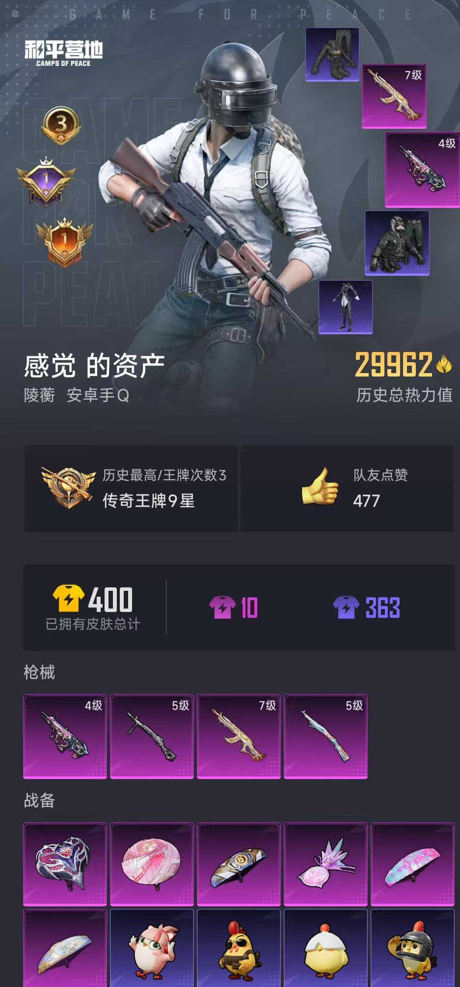 【和平精英】【lyhp21048】0粉装,4特效呛,0载具,历史最高段位:传奇王牌9星 王牌印记3次 热力值:29962,97套装,114呛械,110装备,70战备;套装:套装-特训学院,套装-猎鹰,套装-青年教官,套装-橘黑制服,套装-红色运动,套装-黄色运动,套装-蓝色运动,套装-黄色伏地魔,套装-白色伏地魔,套装-黑色伏地魔,套装-竞技名士,套装-深蓝色名流,套装-酒红色名流,套装-湖蓝色名流,套装-猛禽,套装-长空猛禽,套装-漫步者,套装-海岛探路者,套装-雨林探路者,套装-冷焰舞者,套装-灼焰舞者,套装-战地督导,套装-特殊使命,套装-燃烧卡路里,套装-鹰眼刺客,套装-完美偶像,套装-人气偶像,套装-幻影武者,套装-街头潮人,套装-蓝彩潮人,套装-魅力单车,套装-绮丽涂鸦,套装-耀眼新星,套装-竞技达人朋克,套装-超能勇士,套装-破晓战魂,套装-幻世保卫者,套装-都市魅力,套装-烈火街头,套装-血色贵族,套装-夏日倾情,套装-缤纷果语,套装-龙魂突击队,套装-元素星魂,套装-极速红龙,套装-粉红小猪,套装-破蛋小黄鸡,套装-霓虹街区,套装-白糯汤圆,套装-战术大师,套装-耀粉歌者,套装-光之冒险,套装-绯格组合,套装-王牌教练,套装-柠萌假日,套装-龟仙人,套装-ss25特训,套装-香桃花海,套装-龙的传人,套装-冰河战士,套装-ss26特训,套装-漫游都市,套装-空岛之星,套装-云魄琉璃,套装-ss27特训,套装-恋语绒绒,套装-老实芭蕉,套装-ss28特训,套装-街头风暴,套装-海盐绵绵冰,套装-蝶变,套装-ss29特训,套装-异域银装,套装-星途旅人,套装-ss30特训,套装-ss31特训,套装-智谋强哥,套装-ss33特训,套装-巳巳如意,套装-ss32特训,套装-青翼流星,套装-顶瓜瓜,套装-狂鲨锋刃,套装-大橘大利,套装-炫彩糖果,套装-元气之梦,套装-ss34特训,套装-游乐,套装-薄荷星砂,套装-ss35特训,套装-午间小调,套装-风迹短诗,套装-粉黛兰香,套装-ss36特训,套装-雪国风尚,套装-超能元气,套装-萌鸡速递;呛皮:scar-l-红色方程式,scar-l-夜灯,scar-l-彩虹符号,scar-l-星途旅人,scar-l-海盐豹豹,scar-l-冷漠罗丽,scar-l-绿洲时空,akm-破晓战魂,akm-霓虹街区,akm-涂鸦街区,akm-龙的传人,akm-霓彩脉冲,akm-绿洲时空,7级m762-鬼刀,m762-彩虹符号,m762-天降萌叽,m762-登顶巅峰,ace32-冰晶雪宝,蜜獾-天降萌叽,蜜獾-鸡智如我,蜜獾-风迹短诗,蜜獾-绿洲时空,蜜獾-乌木金纹,4级aug-罪夜之冕,aug-天降萌叽,aug-异域银装,aug-冰晶雪宝,aug-紫晶流影,m416-红色方程式,m416-糯团青竹,mk47-风迹短诗,famas-霓彩脉冲,famas-乌木金纹,groza-海盐豹豹,m16a4-冰河战士,m24-影袭,5级kar98k-巳巳如意,kar98k-金玉无双,kar98k-彩虹符号,kar98k-顶峰精英,莫辛纳甘-风迹短诗,svd-霓彩脉冲,amr-鸡智如我,amr-乌木金纹,awm-天降萌叽,awm-绿洲时空,win94-乌木金纹,m200-乌木金纹,mk14-冰河战士,mk14-薄荷星砂,mk14-紫晶流影,sks-炫彩节奏,mini14-炫彩节奏,mini14-香桃花海,mk20-h-星途旅人,mk20-h-狂鲨锋刃,mk20-h-乌木金纹,m417-玩趣呆呆,slr-金丰海韵,slr-霓彩脉冲,vss-香桃花海,mk12-风迹短诗,mk12-乌木金纹,汤姆逊-天降萌叽,aks-74u-鸡智如我,aks-74u-乌木金纹,p90-玩趣呆呆,p90-巳巳如意,p90-乌木金纹,mp5k-乌木金纹,uzi-天降萌叽,uzi-冰河战士,uzi-啾咪啾咪,uzi-月影灵韵,uzi-炫彩糖果,uzi-绿洲时空,ump45-夜灯,ump45-金玉无双,ump45-海盐豹豹,ump45-绿洲时空,vect-金玉无双,dbs-彩虹符号,dbs-风迹短诗,dbs-乌木金纹,s12k-破晓战魂,s12k-夜灯,s12k-玩趣呆呆,s12k-霓彩脉冲,s1897-糯团青竹,s686-巳巳如意,spas-12-狂鲨锋刃,spas-12-乌木金纹,pkm-啾咪啾咪,mg3-幻世战舞者,mg3-霓彩脉冲,5级dp-28-豹影疾电,dp-28-彩虹符号,mg-36-薄荷星砂,m249-彩虹符号,m249-糯团青竹,m249-冰晶雪宝,撬棍-冰晶雪宝,平底锅-空岛之星,平底锅-属我最6,破片手留单-呆爆全场,破片手留单-星途旅人,破片手留单-海盐豹豹,破片手留单-拽到爆炸,破片手留单-巳巳如意,破片手留单-爆破雪人,突击盾牌-绝对恒星,十子怒-异域银装,铝热弹-炫彩糖果,盐雾蛋-冰氧夏日;降落伞:炫彩糖果飞行器,空岛之星尾迹,异域银装飞行器,顶峰精英尾迹,狂鲨锋刃飞行器,破刃行动尾迹,鸡智如我飞行器,登顶巅峰飞行器; 详情看图1传奇印记4特效呛 4级罪夜之冕aug 满级鬼刀m762