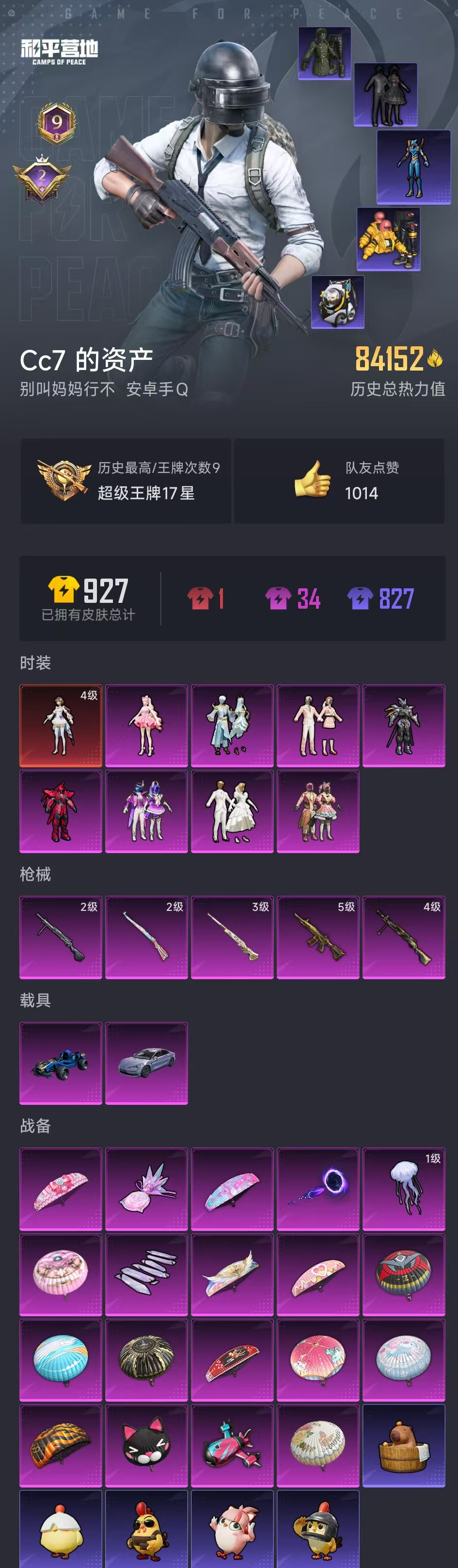 【和平精英】【lyhp21054】8粉装,5特效呛,2载具,历史最高段位:超级王牌17星 王牌印记9次 热力值:84152,188套装,248呛械,295装备,160战备;套装:镜域双华-欧若拉,套装-草莓生巧,套装-极致幻想,套装-炙焰赤龙,套装-飓风飞鹰,套装-纯珍童话,套装-第五大道,套装-金丰海韵,角色-樱桃泡泡,套装-特训学院,套装-猎鹰,套装-青年教官,套装-红色运动,套装-黄色运动,套装-蓝色运动,套装-黄色伏地魔,套装-白色伏地魔,套装-黑色伏地魔,套装-帅气教官,套装-竞技名士,套装-深蓝色名流,套装-酒红色名流,套装-湖蓝色名流,套装-黄色名流,套装-猛禽,套装-长空猛禽,套装-竞技勇士朋克,套装-海岛探路者,套装-旭日情侣,套装-冷焰舞者,套装-灼焰舞者,套装-战地菁英,套装-战地督导,套装-特殊使命,套装-灰色格斗者,套装-甜蜜告白,套装-春日漫步,套装-潮流先锋,套装-龙腾端午,套装-燃烧卡路里,套装-完美偶像,套装-幻影武者,套装-蓝彩潮人,套装-怒火燎原,套装-魅力单车,套装-耀眼新星,套装-坚韧舞者,套装-竞技达人朋克,套装-朋克治安官,套装-夜莺强袭者,套装-野性战心,套装-野性战魂,套装-破晓战魂,套装-都市魅力,套装-风行保卫者,套装-潮流炫酷,套装-沙漠兵团,套装-丛林猎人,套装-火舞潮人,套装-雪山精英,套装-酷潮明星,套装-传奇侦探,套装-幻世战舞者,套装-翡翠奔狼,套装-金耀舞者,套装-甜蜜熊情侣,套装-青涩时光,套装-缤纷果语,套装-冰川特警,套装-极速红龙,套装-格斗先锋,套装-太极红客,套装-海上生明月,套装-ss3特训,套装-破蛋小黄鸡,套装-疯狂小兔子,套装-阳光火鸡,套装-ss5特训,套装-金鼠迎春,套装-北国孤狼,套装-ss6特训,套装-拳皇97草薙京,套装-炽焰拳师,套装-格斗专家,套装-跃动心情,套装-ss7特训,套装-黑色刀锋,套装-核芯基因,套装-精神漫游,套装-霓虹街区,套装-暗夜契约,套装-ss10特训,套装-ss8特训,套装-白熊同盟,套装-萌黄之夏,套装-夏日音浪,套装-ss9特训,套装-薄荷蓝莓,套装-牛气满满,套装-童话森林,套装-ss11特训,套装-萌趣颜团子,套装-特种颜团子,套装-ss12特训,套装-牛气冲天,套装-ss18特训,套装-镭射皇者,套装-银白舞王,套装-耀粉歌者,套装-飞行日记,套装-ss13特训,套装-热情海星,套装-纯真浪花,套装-ss14特训,套装-吉莉礼服,套装-ss15特训,套装-ss16特训,套装-暴风机械师,套装-时空追击者,套装-暗夜魅影,套装-ss17特训,套装-瑞龙福将,套装-团圆交子,套装-焰山流火,套装-福星高照,套装-虎虎生威吉莉,套装-异彩先驱,套装-霓虹极客,套装-ss19特训,套装-音速流光,套装-ss22特训,套装-和煦暖阳,套装-田园牧歌,套装-轻风白浪,套装-绚烂繁星,套装-熠彩粉晶,套装-光之冒险,套装-绯格组合,套装-ss23特训,套装-神气柴柴,套装-懵萌河马,套装-灵蜜圈圈,套装-妙红点点,套装-幻彩翩翩,套装-王牌教练,套装-柠萌假日,套装-ss24特训,套装-绚紫流光,套装-龟仙人,套装-焰鹰斗篷,套装-幻羽潜行,套装-恋语绒绒,套装-ss28特训,角色-湖雨初晴,角色-mark.06,套装-街头风暴,套装-海盐绵绵冰,套装-蝶变,套装-创世·幻影,套装-粉日山川,套装-小熊娃娃,套装-ss29特训,套装-雏菊兔兔,套装-萝兰蝴蝶,角色-无面战甲,角色-蜜桃派对,角色-怀庆长公主,套装-ss30特训,套装-ss31特训,套装-ss33特训,套装-云朵鹅,套装-ss32特训,套装-彩虹兔,套装-顶瓜瓜,套装-雪绒豹,套装-大橘大利,角色-时希公主,套装-炫彩糖果,套装-元气之梦,套装-ss34特训,套装-擎苍青焰,套装-朱霞炽焰,套装-凌霄紫焰,套装-薄荷星砂,套装-ss35特训,套装-午间小调,套装-风迹短诗,套装-ss36特训;呛皮:ac-val-乌木金纹,ac-val-彩虹甜喵,ac-val-天降萌叽,m762-绯红前夜,m762-生命誓言,m762-拳皇97,m762-牛气冲天,m762-镭射皇者,m762-瑞龙福将,m762-暗夜鎏金,m762-天降萌叽,m762-雏菊兔兔,m762-云朵鹅,m762-乌木金纹,groza-生命誓言,groza-黑色刀锋,groza-彩虹符号,groza-异彩先驱,groza-田园牧歌,groza-懵萌河马,groza-海盐豹豹,groza-无面战甲,groza-乌木金纹,5级m416-五爪金龙,m416-夜灯,m416-蓝色火焰,m416-绯红前夜,m416-红色方程式,m416-糯团青竹,m416-乌木金纹,g36c-时空追击者,g36c-古战神甲,g36c-暗夜玫瑰,g36c-懵萌河马,g36c-镜域双华,g36c-乌木金纹,aug-耀粉歌者,aug-天降萌叽,aug-冰晶雪宝,aug-紫晶流影,aug-乌木金纹,蜜獾-天降萌叽,蜜獾-精灵梦叶罗丽,蜜獾-风迹短诗,蜜獾-乌木金纹,mk47-百万伏特,mk47-妙红点点,mk47-风迹短诗,scar-l-红色方程式,scar-l-夏日绵绵冰,scar-l-炫彩节奏,scar-l-玉兔迎春,scar-l-海盐豹豹,scar-l-乌木金纹,akm-生命誓言,akm-破晓战魂,akm-霓虹街区,akm-夜灯,akm-彩虹符号,akm-萌趣颜团子,akm-虎虎生威,akm-霓彩脉冲,m16a4-蓝色火焰,m16a4-红色方程式,m16a4-幻世战舞者,m16a4-冰河战士,q-彩虹符号,q-飞驰魅影,q-银碳小老虎,q-纯真浪花,q-乌木金纹,famas-镜域双华,famas-乌木金纹,arx-凌霄紫焰,2级kar98k-巳巳如意,kar98k-红色方程式,kar98k-王子的夏天,kar98k-彩虹符号,kar98k-飞驰魅影,kar98k-乌木金纹,awm-天降萌叽,awm-焰鹰斗篷,awm-纯真浪花,awm-乌木金纹,3级m24-镜域双华,m24-歌者泠鸢,m24-樱桃泡泡,m24-乌木金纹,win94-夏日绵绵冰,win94-瑞龙福将,win94-乌木金纹,m200-宇宙意志,m200-乌木金纹,amr-暗夜行者,amr-妙红点点,svd-云朵鹅,莫辛纳甘-乌木金纹,莫辛纳甘-懵萌河马,莫辛纳甘-风迹短诗,mini14-金鼠迎春,mini14-炫彩节奏,mini14-耀粉歌者,mini14-异彩先驱,mini14-辉耀战甲,mini14-雏菊兔兔,mini14-乌木金纹,mk14-暗星紫秘,mk14-冰河战士,mk14-薄荷星砂,mk12-风迹短