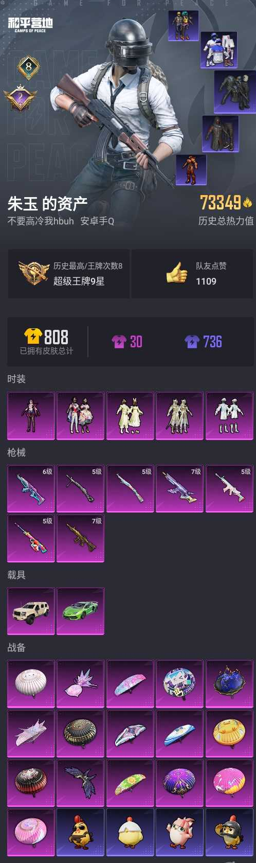 【和平精英】【lyhp21067】5粉装,7特效呛,2载具,历史最高段位:超级王牌9星 王牌印记8次 热力值:73349,162套装,230呛械,256装备,133战备;套装:套装-射星猎手,套装-海盐物语,套装-闲梦青缨,套装-星穹咏叹调,角色-罪夜之冕,套装-竞技名士,套装-深蓝色名流,套装-湖蓝色名流,套装-猛禽,套装-长空猛禽,套装-漫步者,套装-蓝色守护者,套装-旭日情侣,套装-冷焰舞者,套装-灼焰舞者,套装-都市猎人,套装-浪漫天命,套装-贵族骑装,套装-战地督导,套装-滨海假日,套装-鹰眼刺客,套装-冰冻风暴,套装-人气偶像,套装-幻影武者,套装-摇滚战魂,套装-街头潮人,套装-暗金炫舞,套装-蓝彩潮人,套装-神秘领域,套装-魅力单车,套装-绮丽涂鸦,套装-破晓战魂,套装-都市魅力,套装-荣耀,套装-沙漠兵团,套装-极地朋克,套装-幻世战舞者,套装-奇异狩猎者,套装-金耀舞者,套装-蓝调潮人,套装-弄潮海豚,套装-深海小丑鱼,套装-甜蜜熊情侣,套装-青涩时光,套装-极速红龙,套装-麻辣教官,套装-粉红小猪,套装-破蛋小黄鸡,套装-鹤鸣,套装-霓虹街区,套装-夏日音浪,套装-探宝勇士,套装-牛气满满,套装-萌趣颜团子,套装-特种颜团子,套装-战术大师,套装-牛气冲天,套装-ss18特训,套装-耀粉歌者,套装-天籁歌者,套装-快乐星愿,套装-星梦畅游,套装-暗夜傀儡,套装-ss17特训,套装-醒狮腾龙,套装-瑞龙福将,套装-团圆交子,套装-炫光向阳,套装-福星高照,套装-虎虎生威吉莉,角色-军刀雅典娜,套装-缤纷焰火,套装-异彩先驱,套装-霓虹极客,套装-空投萌叽,套装-ss19特训,套装-极速竞梦,套装-飞驰魅影,套装-音速流光,套装-ss20特训,套装-甜心亚梦,套装-虚音幻奏,套装-ss21特训,套装-萌趣咩咩,套装-娇憨猪猪,套装-荷畔雨呱,套装-玉兔迎春,套装-ss22特训,套装-田园牧歌,套装-轻风白浪,套装-照水倚天,套装-光之冒险,套装-绯格组合,套装-ss23特训,套装-龙舌兰冰茶,套装-神气柴柴,套装-懵萌河马,套装-妙红点点,套装-幻彩翩翩,套装-王牌教练,套装-ss24特训,套装-龟仙人,套装-涂山之恋,套装-ss25特训,套装-金戈铁马,套装-惊鸿侠骨,套装-锦衣飞扬,套装-香桃花海,套装-龙的传人,套装-ss26特训,套装-快闪甜心,套装-春光漫游,套装-空岛之星,套装-无暇誓言,套装-贝斯之夜,套装-焰鹰斗篷,套装-幽夜迷踪,套装-幻羽潜行,套装-ss27特训,套装-恋语绒绒,套装-ss28特训,角色-情公主,套装-街头风暴,套装-海盐绵绵冰,套装-创世·追猎,套装-ss29特训,套装-异域银装,套装-ss30特训,套装-小鸟芋圆,套装-ss31特训,套装-智谋强哥,角色-海琴烟,套装-紫幽梦,套装-粉恋花,套装-ss33特训,套装-云朵鹅,套装-巳巳如意,套装-ss32特训,套装-彩虹兔,套装-青翼流星,套装-蓝冰羽,套装-顶瓜瓜,套装-雪绒豹,套装-狂鲨锋刃,套装-大橘大利,套装-炫彩糖果,套装-星影赞美诗,套装-ss34特训,套装-朱霞炽焰,套装-凌霄紫焰,套装-薄荷星砂,套装-ss35特训,套装-午间小调,套装-风迹短诗,套装-琴音绮想,套装-粉黛兰香,套装-画境星梦,套装-书海巡游,套装-ss36特训,套装-雪国风尚,套装-超能元气,套装-萌鸡速递;呛皮:7级m762-电糖天使,m762-奇异狩猎者,m762-深海曼妙,m762-瑞龙福将,m762-彩虹符号,m762-天降萌叽,m762-云朵鹅,m762-登顶巅峰,mk47-洛神天依,mk47-乌木金纹,mk47-妙红点点,mk47-风迹短诗,groza-影袭,groza-异彩先驱,groza-恐龙拽拽,groza-田园牧歌,groza-懵萌河马,蜜獾-娇憨猪猪,蜜獾-天降萌叽,蜜獾-风迹短诗,蜜獾-乌木金纹,6级akm-梦之光华,akm-影袭,akm-奇异狩猎者,akm-破晓战魂,akm-霓虹街区,akm-彩虹符号,akm-萌趣颜团子,akm-虎虎生威,akm-环太平洋,akm-龙的传人,akm-霓彩脉冲,g36c-懵萌河马,g36c-乌木金纹,arx-凌霄紫焰,aug-天降萌叽,aug-异域银装,aug-冰晶雪宝,aug-紫晶流影,q-洛神天依,q-飞驰魅影,7级m416-五爪金龙,m416-蓝色火焰,m416-暗夜行者,m416-糯团青竹,5级scar-l-锦绣绵绵,scar-l-红色方程式,scar-l-炫彩节奏,scar-l-玉兔迎春,scar-l-星途旅人,scar-l-绿洲时空,famas-桃粉嫣然,famas-墨龙九天,famas-霓彩脉冲,famas-乌木金纹,m16a4-甜心亚梦,m16a4-幻世战舞者,m16a4-莲影清波,ace32-画境星梦,ace32-冰晶雪宝,ac-val-甜心亚梦,ac-val-乌木金纹,ac-val-天降萌叽,ac-val-快闪甜心,awm-恐龙拽拽,awm-焰鹰斗篷,m200-惊鸿侠骨,m200-罪夜之冕,m200-乌木金纹,svd-云朵鹅,m24-影袭,m24-奇异狩猎者,m24-乌木金纹,5级kar98k-巳巳如意,kar98k-影袭,kar98k-彩虹符号,kar98k-炫彩节奏,kar98k-飞驰魅影,kar98k-顶峰精英,kar98k-乌木金纹,win94-瑞龙福将,win94-乌木金纹,5级amr-炫光之旅,amr-妙红点点,amr-鸡智如我,amr-乌木金纹,莫辛纳甘-乌木金纹,莫辛纳甘-懵萌河马,莫辛纳甘-风迹短诗,m1加兰德-画境星梦,sks-金玉无双,sks-天之羽翼,mini14-金玉无双,mini14-异彩先驱,mini14-筑梦精灵,mini14-旋转彩虹,mini14-香桃花海,slr-月影鸳鸯,slr-娇憨猪猪,slr-彩虹符号,slr-霓彩脉冲,vss-星之彼岸,vss-田园牧歌,vss-香桃花海,mk12-风迹短诗,mk12-乌木金纹,mk14-乌木金纹,mk14-紫幽梦,mk20-h-快闪甜心,mk20-h-狂鲨锋刃,mk20-h-乌木金纹,m417-惊鸿侠骨,m417-猪猪侠,ump45-夜灯,ump45-生命誓言,ump45-涂山之恋,ump45-炫光之旅,ump45-海盐豹豹,汤姆逊-奇异狩猎者,汤姆逊-耀粉歌者,汤姆逊-炫彩节奏,汤姆逊-异彩先驱,汤姆逊-环太平洋,汤姆逊-天降萌叽,汤姆逊-智耀战神,p90-飞驰魅影,p90-快闪甜心,p90-玩趣呆呆,p90-乌木金纹,vect-生命誓言,vect-暗夜玫瑰,vect-田园牧歌,vect-焰鹰斗篷,vect-创世·救赎,uzi-影袭,uzi-炫彩节奏,uzi-娇憨猪猪,uzi-天降萌叽,uzi-冰河战士,uzi-啾咪啾咪,uz