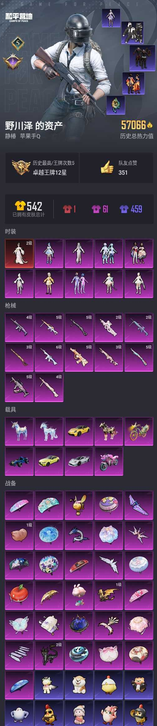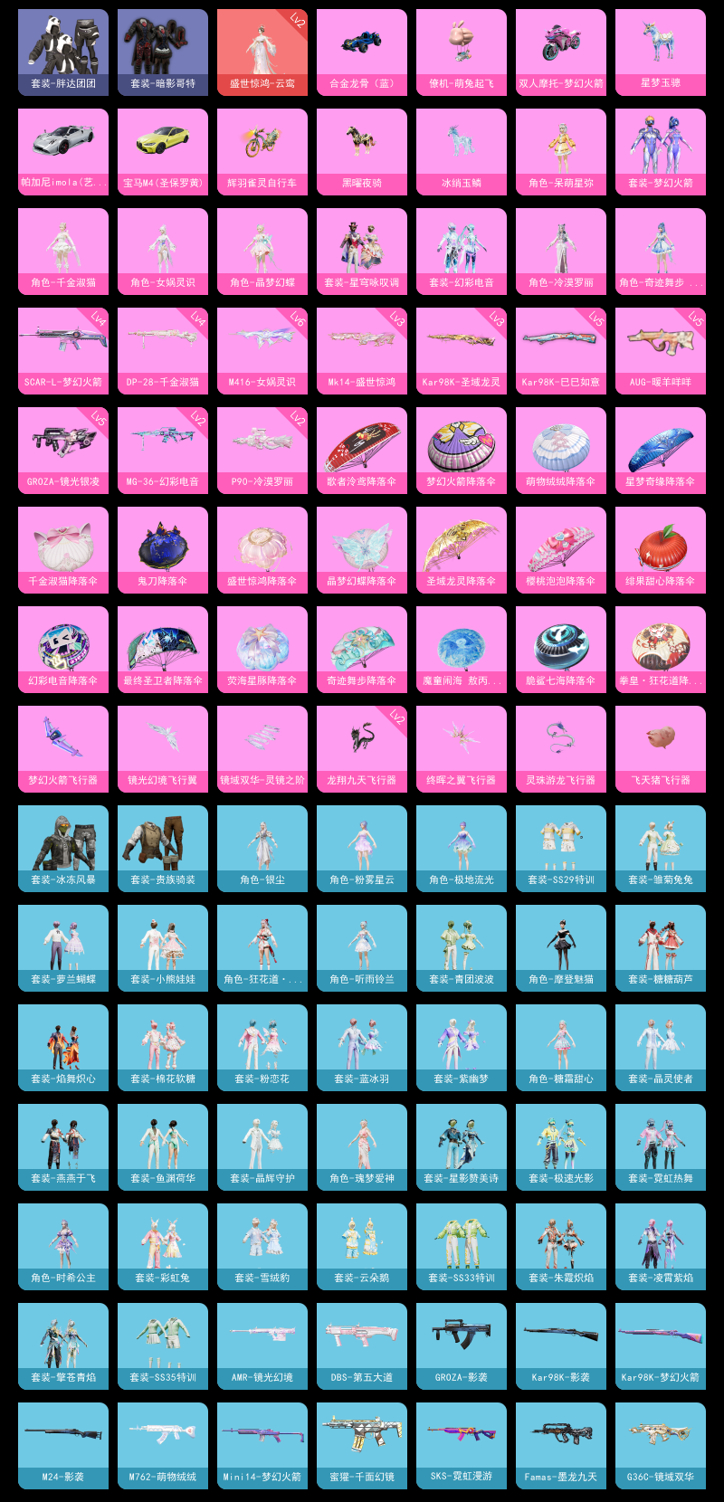 【和平精英】【lyhp21065】9粉装,12特效呛,9载具,历史最高段位:卓越王牌12星 王牌印记5次 热力值:57141,78套装,136呛械,222装备,83战备;套装:盛世惊鸿-云鸾,套装-梦幻火箭,角色-呆萌星弥,角色-千金淑猫,角色-女娲灵识,角色-晶梦幻蝶,套装-幻彩电音,角色-冷漠罗丽,套装-星穹咏叹调,角色-奇迹舞步 美琪,套装-黄色运动,套装-竞技名士,套装-长空猛禽,套装-海岛探路者,套装-灼焰舞者,套装-贵族骑装,套装-冰冻风暴,套装-暗影哥特,套装-缤纷果语,套装-灿烂千阳,套装-元素星魂,套装-胖达团团,套装-疯狂小兔子,套装-战术大师,套装-王牌教练,套装-香桃花海,套装-恋语绒绒,角色-听雨铃兰,角色-极地流光,角色-粉雾星云,角色-银尘,套装-街头风暴,套装-蝶变,套装-小熊娃娃,套装-ss29特训,套装-雏菊兔兔,角色-狂花道·娜可露露,套装-萝兰蝴蝶,套装-异域银装,角色-摩登魅猫,套装-星途旅人,角色-糖霜甜心,角色-怀庆长公主,套装-焰舞炽心,套装-ss30特训,套装-青团波波,套装-棉花软糖,套装-天籁学园,套装-糖糖葫芦,套装-ss31特训,套装-鱼渊荷华,套装-燕燕于飞,角色-风玲,套装-晶灵使者,角色-瑰梦爱神,套装-紫幽梦,套装-粉恋花,套装-晶辉守护,套装-ss33特训,套装-云朵鹅,套装-巳巳如意,套装-ss32特训,套装-彩虹兔,套装-蓝冰羽,套装-顶瓜瓜,套装-雪绒豹,套装-大橘大利,套装-极速光影,角色-时希公主,套装-霓虹热舞,套装-星影赞美诗,套装-元气之梦,套装-ss34特训,套装-擎苍青焰,套装-朱霞炽焰,套装-凌霄紫焰,套装-薄荷星砂,套装-ss35特训;呛皮:5级aug-暖羊咩咩,aug-异域银装,aug-紫晶流影,4级scar-l-梦幻火箭,scar-l-夜灯,scar-l-炫彩节奏,scar-l-玉兔迎春,scar-l-星途旅人,scar-l-冷漠罗丽,5级groza-镜光银凌,groza-影袭,groza-荧海星豚,akm-涂鸦街区,akm-荧星灵猫,akm-极光猎影,akm-砺玉逐花,akm-霓彩脉冲,m16a4-千金淑猫,m16a4-最终圣卫者,蜜獾-千面幻镜,蜜獾-糖糖葫芦,蜜獾-御兔特攻,蜜獾-绯穹魔姬,蜜獾-冰澜龙吟,蜜獾-乌木金纹,m762-彩虹符号,m762-天降萌叽,m762-萌物绒绒,m762-雏菊兔兔,m762-云朵鹅,g36c-镜域双华,g36c-星穹咏叹调,6级m416-女娲灵识,m416-蓝色火焰,arx-凌霄紫焰,famas-墨龙九天,famas-乌木金纹,amr-镜光幻境,3级kar98k-圣域龙灵,5级kar98k-巳巳如意,kar98k-影袭,kar98k-梦幻火箭,kar98k-顶峰精英,svd-云朵鹅,m24-影袭,m24-幻彩电音,m24-时光之吻,win94-拳皇·狂花道,win94-晶梦幻蝶,win94-乌木金纹,m200-次元竞界,m200-乌木金纹,sks-霓虹漫游,sks-圣域龙灵,mini14-梦幻火箭,mini14-香桃花海,mini14-雏菊兔兔,mini14-鸡智如我,mk20-h-星梦奇缘,mk20-h-星途旅人,mk20-h-樱桃泡泡,mk20-h-糖糖葫芦,mk20-h-狂鲨锋刃,mk20-h-乌木金纹,3级mk14-盛世惊鸿,mk14-紫幽梦,mk14-薄荷星砂,vss-香桃花海,2级p90-冷漠罗丽,p90-天籁学园,p90-巳巳如意,vect-燕燕于飞,aks-74u-鬼刀,aks-74u-乌木金纹,uzi-天降萌叽,js9-凌霄紫焰,野牛-雏菊兔兔,野牛-燕燕于飞,ump45-生命誓言,ump45-海盐豹豹,ump45-糖糖葫芦,mp5k-未来领航者,汤姆逊-天降萌叽,汤姆逊-樱桃泡泡,s1897-绒绒粉兔,s1897-紫幽梦,s1897-糯团青竹,dbs-第五大道,dbs-幻彩电音,dbs-月影灵韵,s12k-霓彩脉冲,spas-12-燕燕于飞,spas-12-云朵鹅,spas-12-乌木金纹,s686-千金淑猫,pkm-啾咪啾咪,pkm-紫幽梦,4级dp-28-千金淑猫,5级dp-28-豹影疾电,dp-28-彩虹符号,mg3-镜域双华,2级mg-36-幻彩电音,5级mg-36-沧焰双生,mg-36-凌霄紫焰,p92-紫幽梦,p92-凌霄紫焰,p18c-糖糖葫芦,电击呛-喜羊羊与灰太狼,蝎式手呛-千金淑猫,蝎式手呛-燕燕于飞,短管霰弹-竹节火铳,短管霰弹-圣域龙灵,r45-拳皇·狂花道,r45-幻彩电音,r1895-雏菊兔兔,沙墨之鹦-云朵鹅,大砍刀-黑金刀,大砍刀-盛世惊鸿,大砍刀-云朵鹅,大砍刀-冰澜龙吟,平底锅-绝色倾城,平底锅-雏菊兔兔,平底锅-糖糖葫芦,平底锅-紫幽梦,平底锅-属我最6,平底锅-凌霄紫焰,撬棍-脆鲨七海,燃烧瓶-甜梦桃焰,爆炸猎弓-喜羊羊与灰太狼,破片手留单-星途旅人,破片手留单-海盐豹豹,破片手留单-巳巳如意,盐雾蛋-冰氧夏日,盐雾蛋-冰澜龙吟,十子怒-燕燕于飞,十子怒-异域银装;载具:保时捷911 敞篷版极速黄,星梦玉骢,黑曜夜骑,冰绡玉鳞,辉羽雀灵自行车,帕加尼imola艺术银,宝马m4圣保罗黄,双人摩托-梦幻火箭,合金龙骨(蓝);降落伞:梦幻火箭飞行器,镜光幻境飞行翼,镜域双华-灵镜之阶,酣梦熊熊飞行器,凤舞九天飞行器,终晖之翼飞行器,提桶跑路飞行器,灵珠游龙飞行器,龙翔九天飞行器,圣域金龙飞行器,飞天猪飞行器,异域银装飞行器,顶峰精英尾迹;滑翔尾迹:僚机-萌兔起飞; 详情看图1红9粉12特效呛9载1僚机 2级云裳 梦幻火箭 晶梦幻蝶 奇迹舞步 女娲灵识 呆萌星矢 多呛型 6级m4女娲 3级mk12盛世 多车型 合金龙骨 宝马m4 911保时捷 帕加尼 黑耀马 星空马 雪麒麟