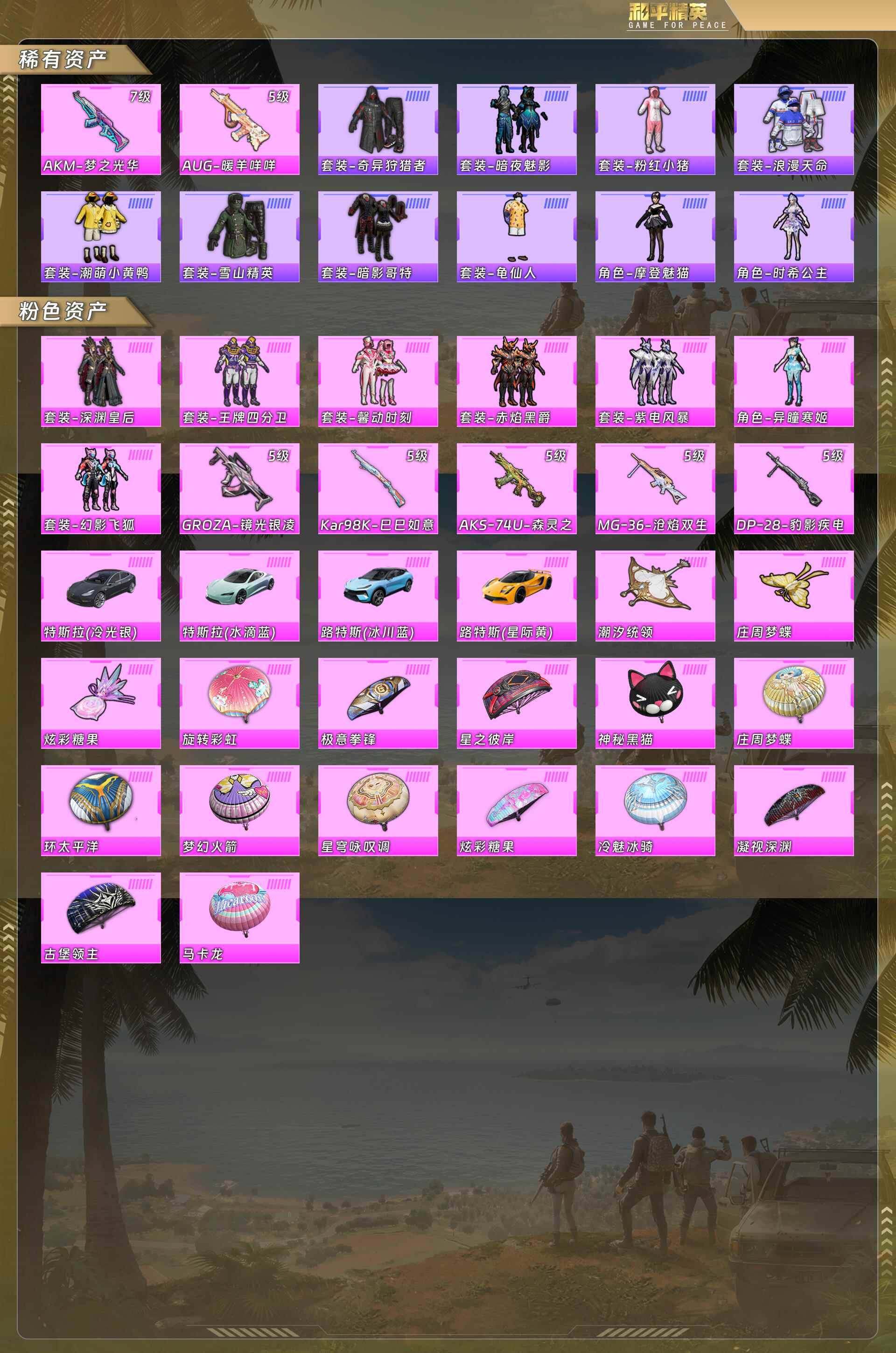 (7粉装-7粉呛-4载具)ak梦之光华7级/aug暖羊咩咩5级/奇异狩猎者/暗夜魅影/粉红小猪/浪漫天命/潮萌小黄鸭/暗影哥特/摩登魅猫/时希公主/深渊皇后/王牌四分卫/馨动时刻/赤焰黑爵/紫电风暴/异瞳寒姬/幻影飞狐/特斯拉银/特斯拉蓝/路特斯蓝/路特斯黄 没战神框 hp5441-3粉色飞行器-100916热力值-12王牌印记-243套装-299呛皮 【热门品类】:套装-浪漫天命,套装-奇异狩猎者,套装-龟仙人,套装-潮萌小黄鸭,套装-暗影哥特,套装-粉红小猪 【粉色套装】:粉装-深渊皇后,粉装-王牌四分卫,粉装-馨动时刻,粉装-赤焰黑爵,粉装-紫电风暴,粉装-幻影飞狐,角色-异瞳寒姬 【粉色呛皮等级】:akm-梦之光华七级,groza-镜光银凌五级,aug-暖羊咩咩五级,aks-74u-森灵之息五级,kar98k-巳巳如意五级,dp-28-豹影疾电五级,mg-36-沧焰双生五级 【粉色载具】:特斯拉model 3(冷光银),特斯拉roadster(水滴蓝),路特斯evija(星际黄),路特斯eletre(冰川蓝) 【粉色呛皮】:akm-梦之光华,groza-镜光银凌,aug-暖羊咩咩,aks-74u-森灵之息,kar98k-巳巳如意,dp-28-豹影疾电,mg-36-沧焰双生 【粉色飞行器】:潮汐统领飞行器,庄周梦蝶飞行器 【粉色降落伞】:凝视深渊降落伞,梦幻火箭降落伞,神秘黑猫降落伞,古堡领主降落伞,马卡龙降落伞,星之彼岸降落伞,庄周梦蝶降落伞,冷魅冰骑降落伞,环太平洋降落伞,旋转彩虹降落伞,星穹咏叹调降落伞,极意拳锋降落伞,炫彩糖果降落伞 【稀有套装】:套装-龟仙人,套装-巳巳如意,套装-超能元气,套装-雪国风尚,套装-炫彩糖果,套装-雏菊兔兔,套装-萝兰蝴蝶,套装-糖糖葫芦,套装-青团波波,套装-棉花软糖,角色-摩登魅猫,套装-燕燕于飞,套装-鱼渊荷华,套装-粉恋花,套装-紫幽梦,套装-蓝冰羽,套装-星影赞美诗,套装-星渊小夜曲,角色-时希公主,套装-朱霞炽焰,套装-凌霄紫焰,套装-擎苍青焰,角色-绯色魅影,套装-书海巡游,套装-画境星梦,套装-琴音绮想,角色-月烬之祷 【稀有呛皮】:aug-冰晶雪宝,akm-pel轰鸣竞梦者,akm-夜灯,akm-彩虹符号,akm-星之彼岸,akm-灼热熔岩,akm-百万伏特,akm-破晓战魂,akm-萌趣颜团子,akm-虎虎生威,akm-霓虹街区,akm-龙的传人,m16a4-幻世战舞者,m16a4-甜心亚梦,m16a4-红色方程式,m16a4-蓝色火焰,scar-l-夏日绵绵冰,scar-l-夜灯,scar-l-暗夜玫瑰,scar-l-炫彩节奏,scar-l-玉兔迎春,scar-l-红色方程式,scar-l-雷霆特警,m416-夜灯,m416-糯团青竹,m416-红色方程式,m416-蓝色火焰,groza-彩虹符号,groza-恐龙拽拽,groza-治愈之星,groza-生命誓言,groza-雷霆特警,groza-黑色刀锋,aug-凝视深渊,aug-天降萌叽,aug-耀粉歌者,aug-青春冒险家,q-原初圣火,q-彩虹符号,q-洛神天依,q-神秘黑猫,q-飞驰魅影,m762-天降萌叽,m762-牛气冲天,m762-瑞龙福将,m762-诡娃娃,m762-镭射皇者,m762-登顶巅峰,mk47-青春冒险家,g36c-不夜海上花,g36c-冷魅冰骑,g36c-时空追击者,g36c-暗夜玫瑰,g36c-荒野猎神,g36c-星穹咏叹调,ac-val-天降萌叽,ac-val-甜心亚梦,ace32-画境星梦,arx-凌霄紫焰,uzi-众神之王,uzi-幻影战神,uzi-炫彩节奏,uzi-红色方程式,ump45-圣诞大吉,ump45-夜灯,ump45-时空追击者,ump45-生命誓言,ump45-蓝色火焰,vect-pel轰鸣竞梦者,vect-彩虹符号,vect-治愈之星,vect-生命誓言,vect-黑色刀锋,汤姆逊-炫彩节奏,汤姆逊-耀粉歌者,野牛-夜灯,野牛-青春冒险家,mp5k-众神之王,mp5k-画境星梦,js9-凌霄紫焰,p90-飞驰魅影,p90-巳巳如意,kar98k-彩虹符号,kar98k-欢乐麻酱,kar98k-灵符少年,kar98k-红色方程式,kar98k-终极赛罗,kar98k-飞驰魅影,m24-治愈之星,m24-炫彩节奏,m24-众神之王,m24-冰封烈焰,awm-不夜海上花,awm-海螺星光,sks-天之羽翼,sks-心之恋语,sks-时空追击者,sks-炫彩节奏,sks-玉龙,vss-星之彼岸,vss-镭射皇者,vss-雷霆特警,vss-黑色刀锋,mini14-原初圣火,mini14-涂山之恋,mini14-生命誓言,mini14-耀粉歌者,mini14-金鼠迎春,mk14-治愈之星,win94-瑞龙福将,slr-众神之王,qbu-不夜海上花,qbu-青春冒险家,m417-幻影飞狐,m1加兰德-画境星梦,s686-不夜海上花,s686-冰封烈焰,s686-彩虹符号,s686-橘柚倾心,s686-生命誓言,s686-红色方程式,s686-葫芦兄弟,s686-魔法学院,s686-巳巳如意,s686-千金淑猫,s1897-炫彩节奏,s1897-百万伏特,s1897-神秘黑猫,s1897-镭射皇者,s1897-飞驰魅影,s12k-瑞龙福将,s12k-破晓战魂,s12k-龙宫之主,s12k-夜灯,s12k-幻世战舞者,dbs-彩虹符号,dbs-时空追击者,dbs-甜心亚梦,aa12-g-画境星梦,m249-古堡领主,m249-工程核心,m249-彩虹符号,m249-星之彼岸,m249-破晓战魂,m249-糯团青竹,m249-镭射皇者,dp-28-原初圣火,dp-28-古战神甲,dp-28-清新柠檬,dp-28-甜心亚梦,mg3-幻世战舞者,mg3-瑞龙福将,mg-36-凌霄紫焰,p92-雷霆特警,p92-凌霄紫焰,p1911-冰封烈焰,p18c-原初圣火,p18c-百万伏特,r45-幻彩电音,短管霰弹-星穹咏叹调,蝎式手呛-千金淑猫,平底锅-凌霄紫焰,平底锅-无垠阁,平底锅-画境星梦,破片手留单-巳巳如意 【其他套装】:套装-ss5特训,套装-ss6特训,套装-ss7特训,套装-ss8特训,套装-ss9特训,套装-ss10特训,套装-ss11特训,套装-ss12特训,套装-ss13特训,套装-ss14特训,套装-ss15特训,套装-ss16特训,套装-ss17特训,套装-ss18特训,套装-ss19特训,套装-ss20特训,套装-ss21特训,套装-ss22特训,套装-ss23特训,套装-ss24特训,套装-ss25特训,套装-ss26特训,套装-ss27特训,套装-ss28特训,套装-ss29特训,套装-丛林猎人,套装-人气偶像,套装-传奇侦探,套装-冰川格斗者,套装-冷焰舞者,套装-北国孤狼,套装-千禧之恋,套装-半糖蓝莓,套装-吉莉礼服,套装-夏日音浪,套装-好奇恐龙,套装-完美偶像,套装-幻世战舞者,套装-幻影武者,套装-怒火燎原,套装-战地督