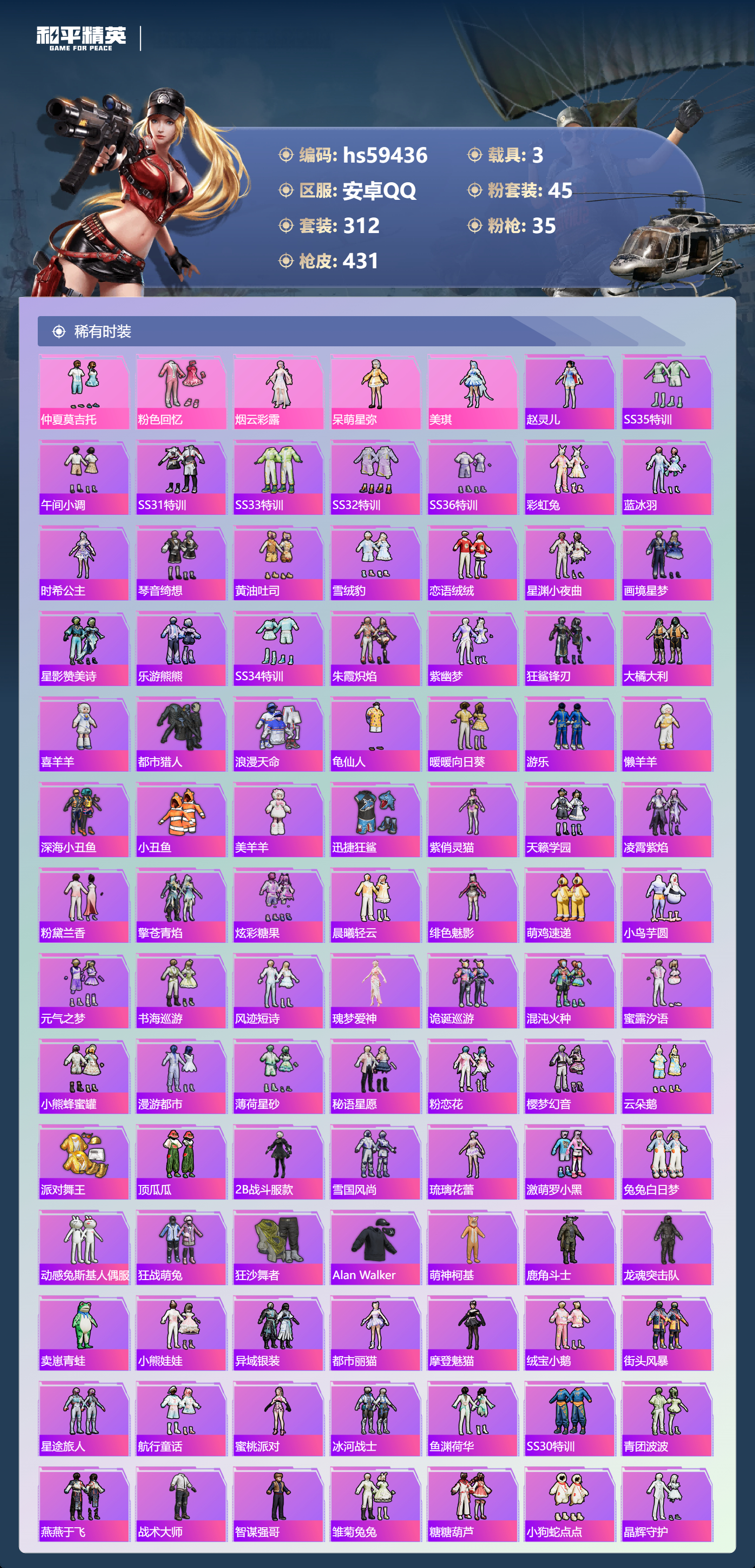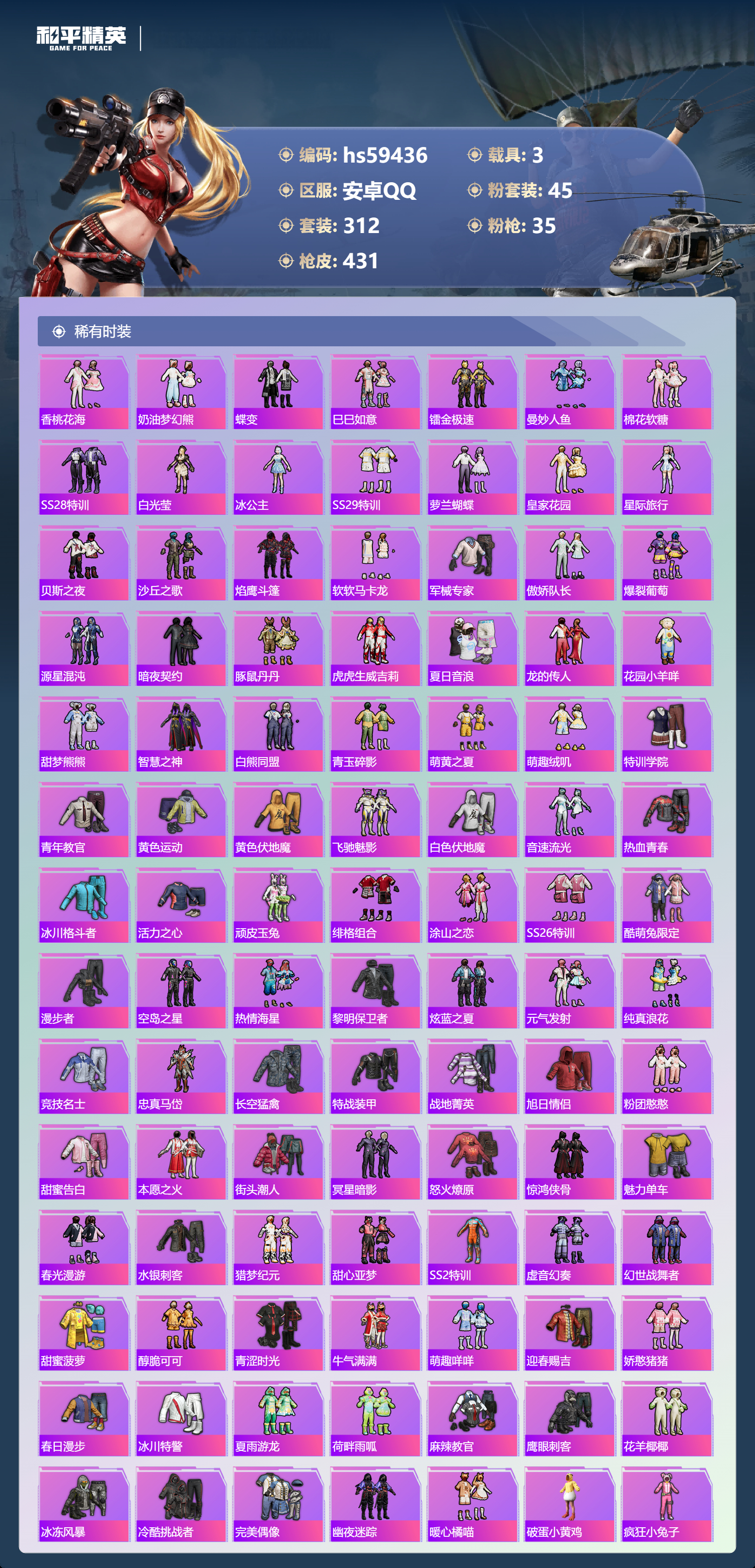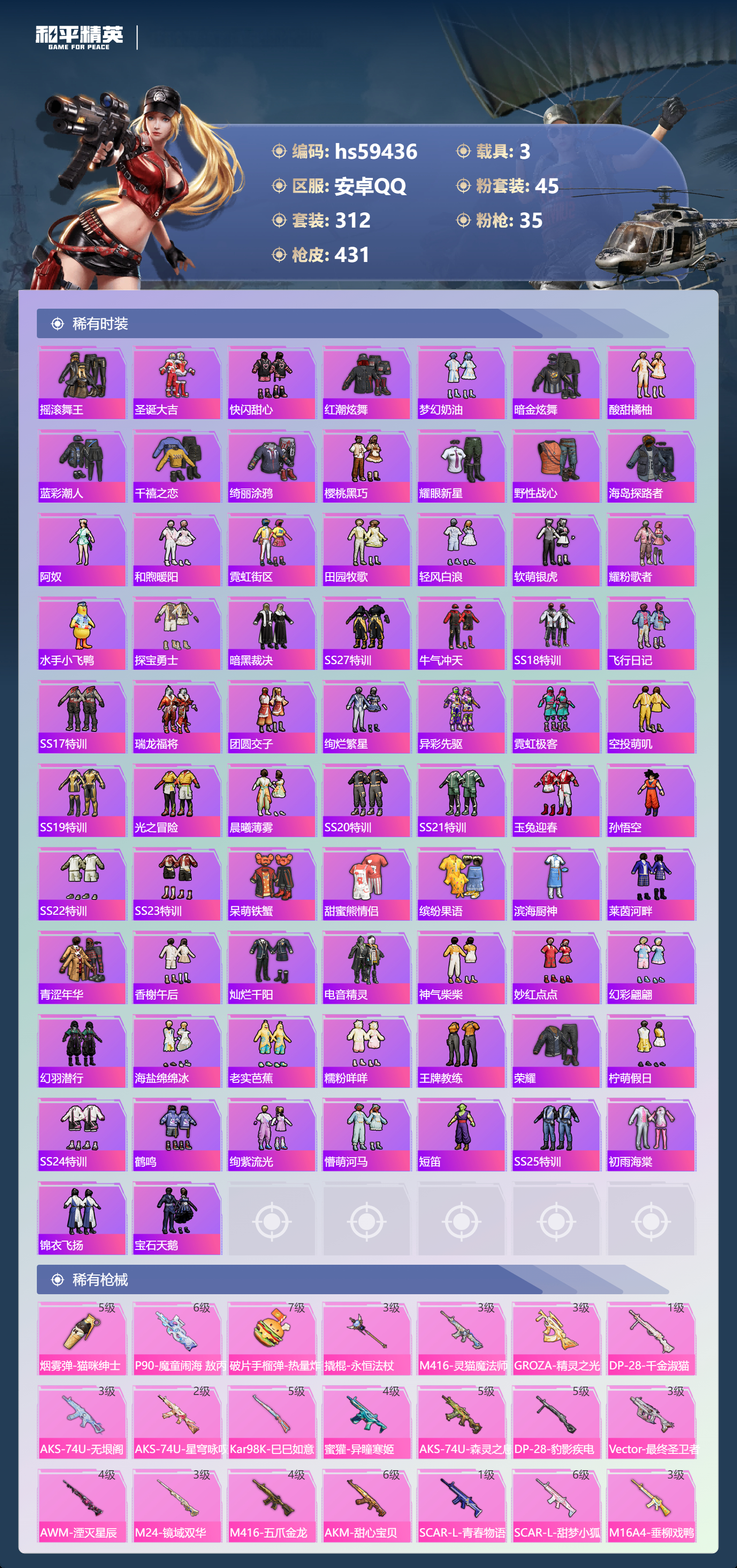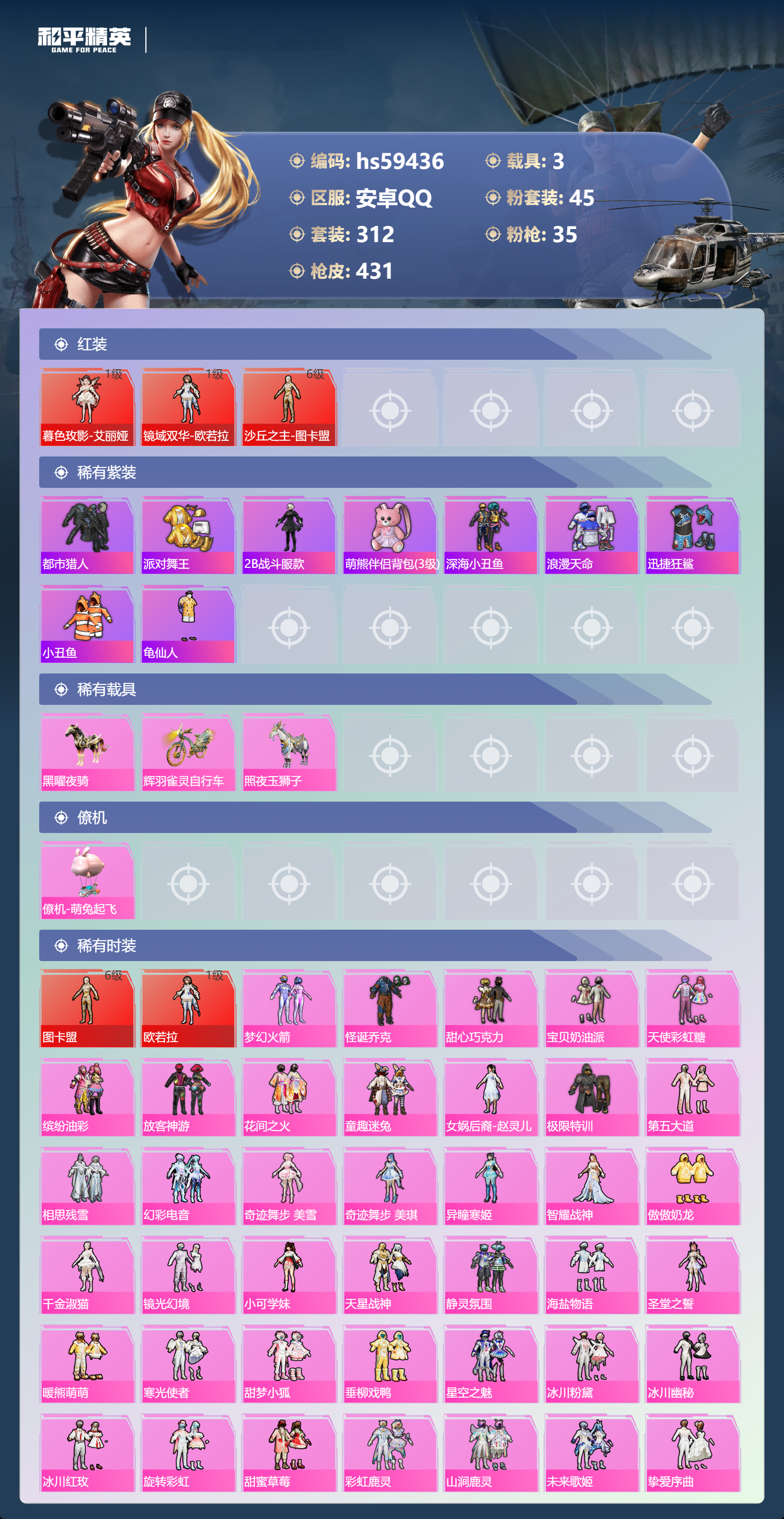 3载具-312套装-431呛皮-hs59436 安卓手q-17王牌印记-有战神框-3红装-45粉装-35特效呛-3载具-热力值-312套装-431呛皮-6卓越印记-3传奇印记【3红装】镜域双华-欧若拉/1级沙丘之主-图卡盟/6级暮色玫影-艾丽娅/1级【45粉装】套装-仲夏莫吉托套装-甜蜜草莓套装-相思残雪角色-千金淑猫套装-放客神游套装-童趣迷兔套装-海盐物语套装-第五大道角色-奇迹舞步 美琪