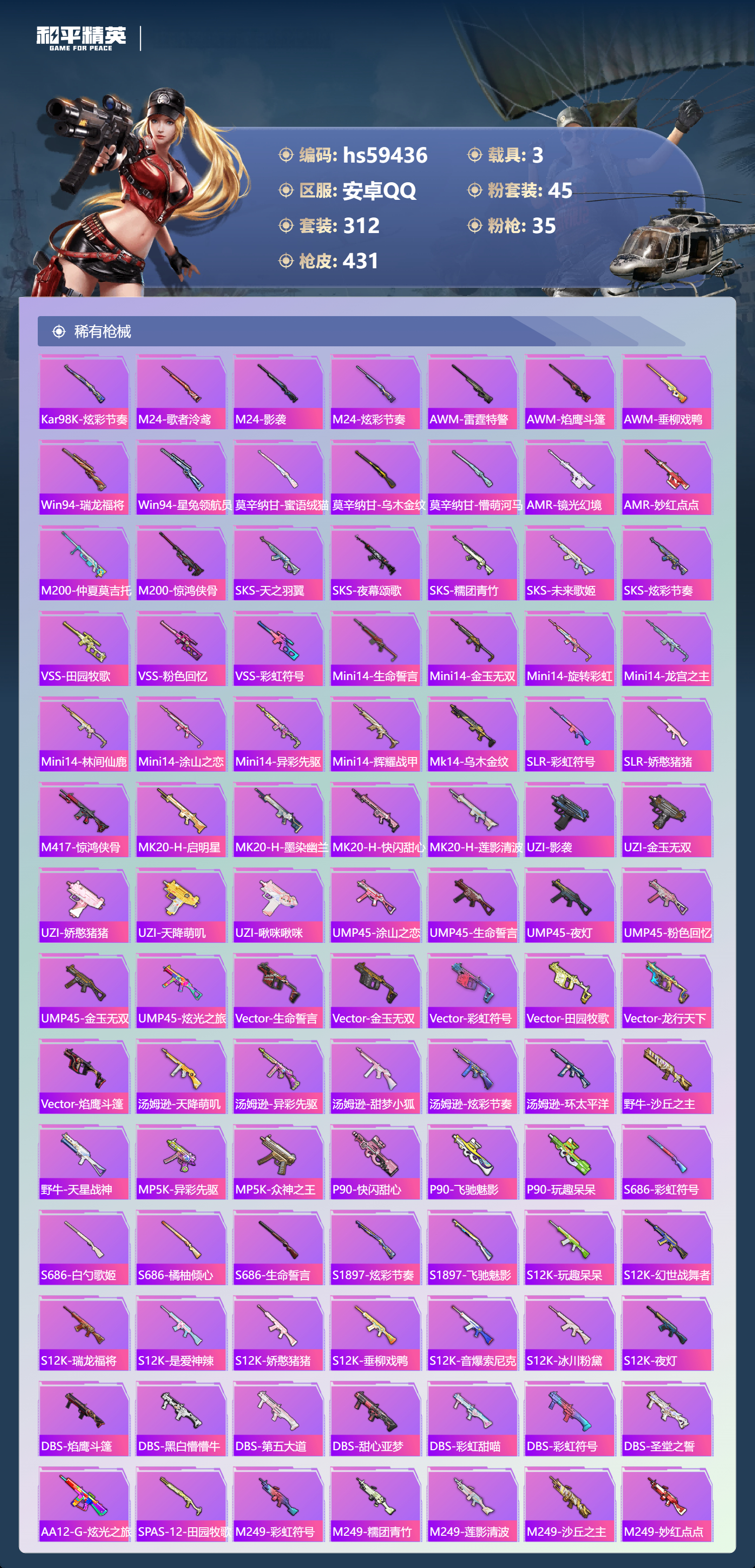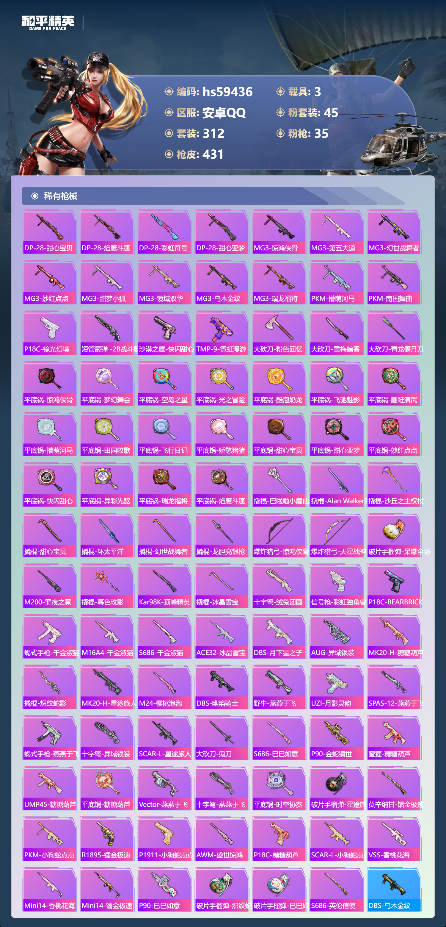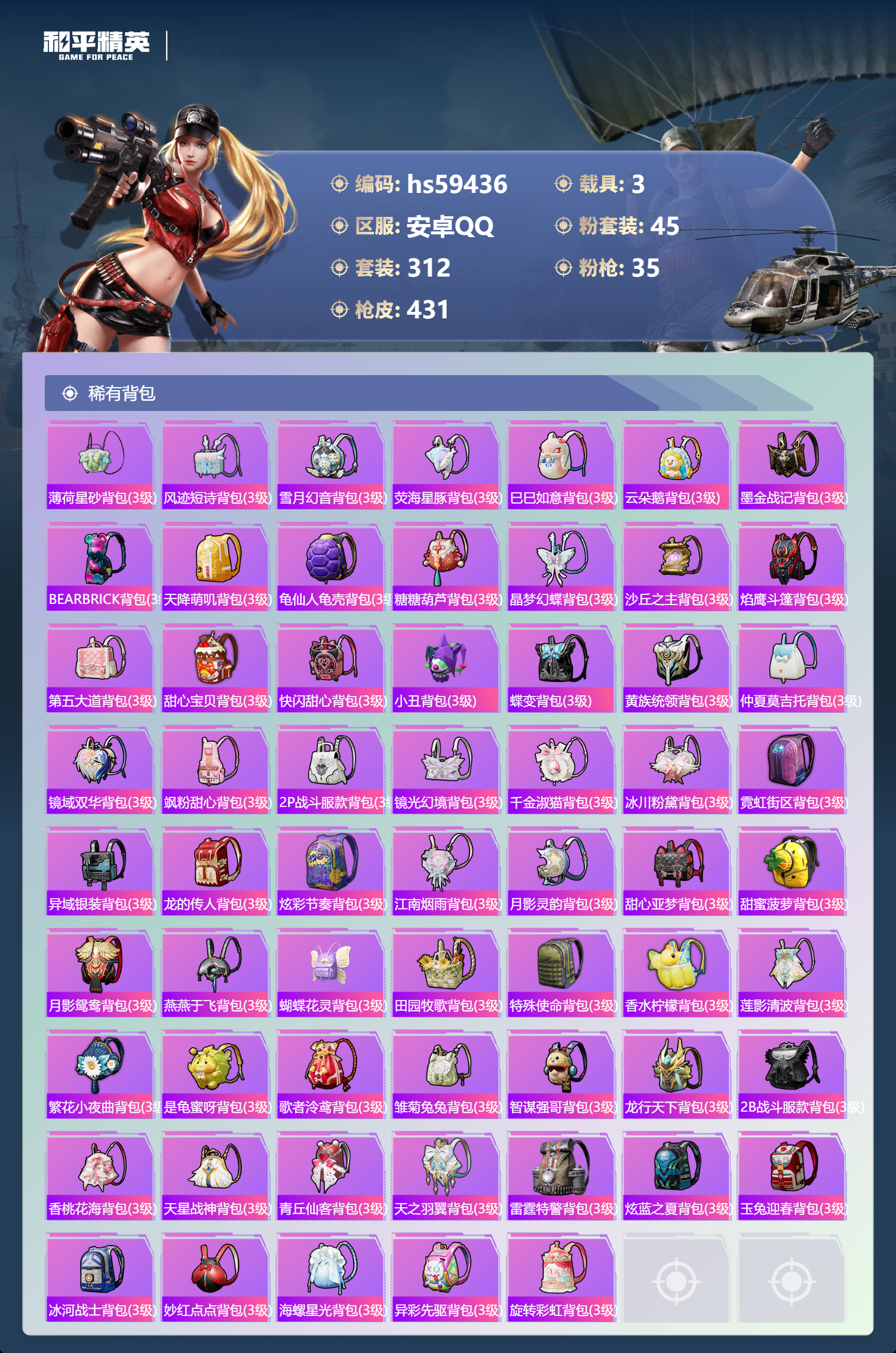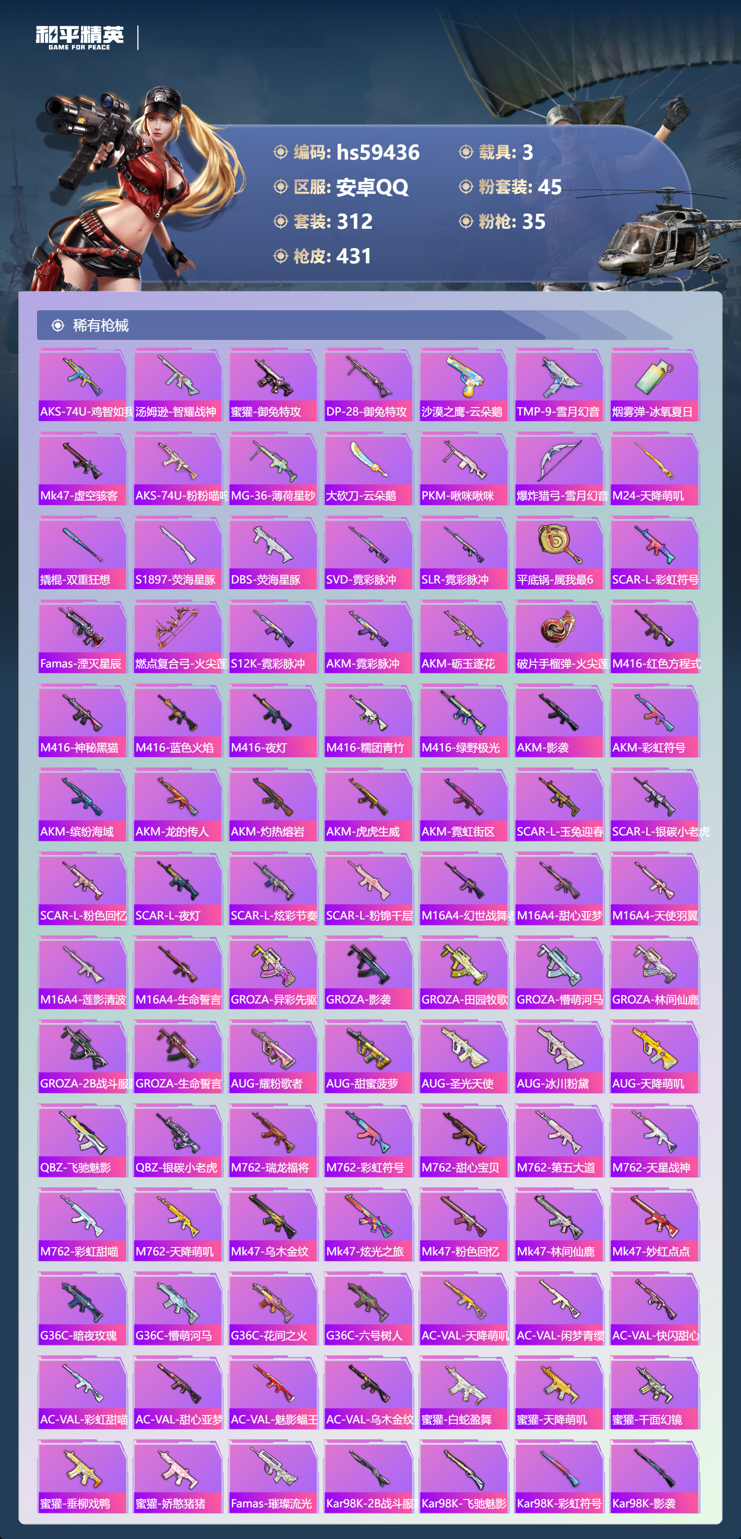 3载具-312套装-431呛皮-hs59436 安卓手q-17王牌印记-有战神框-3红装-45粉装-35特效呛-3载具-热力值-312套装-431呛皮-6卓越印记-3传奇印记【3红装】镜域双华-欧若拉/1级沙丘之主-图卡盟/6级暮色玫影-艾丽娅/1级【45粉装】套装-仲夏莫吉托套装-甜蜜草莓套装-相思残雪角色-千金淑猫套装-放客神游套装-童趣迷兔套装-海盐物语套装-第五大道角色-奇迹舞步 美琪