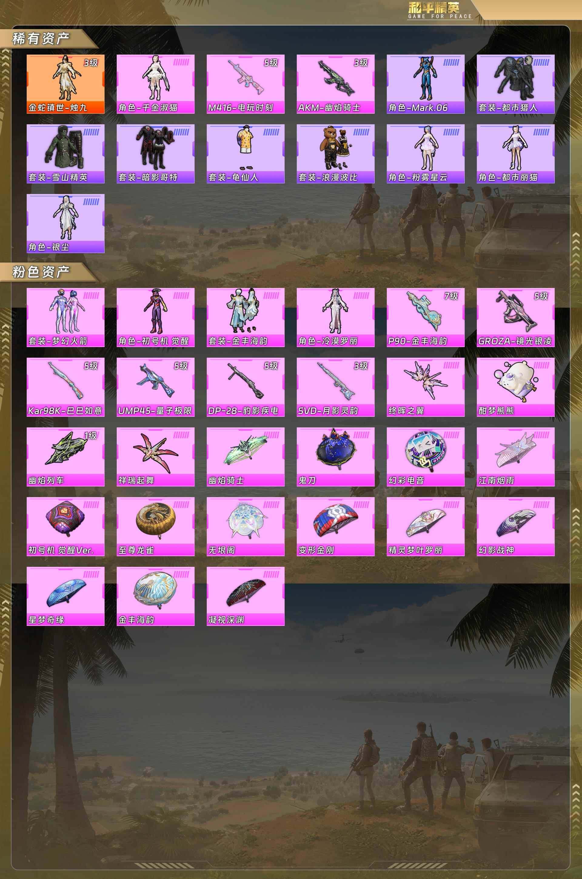 素材号-紫螳螂-火箭少女-蓝螳螂-都市-红眼罩-地铁满天赋-金蛇镇世烛九3级/千金淑猫/m4电玩时刻5级/ak幽焰骑士3级/粉雾星云/都市丽猫/银尘/金丰海韵/冷漠罗丽 (1神装-5粉装-8粉呛)没战神框hp5462-0载具-4粉色飞行器-70392热力值-8王牌印记-161套装-219呛皮 【红色神装等级】:金蛇镇世-烛九三级 【红色角色神装】:金蛇镇世-烛九 【热门品类】:粉装-梦幻火箭,套装-都市猎人,套装-小丑鱼,套装-龟仙人,套装-暗影哥特,套装-浪漫波比,角色-mark.06 【粉色套装】:粉装-梦幻火箭,角色-初号机 觉醒ver.,粉装-金丰海韵,角色-千金淑猫,角色-冷漠罗丽 【粉色呛皮等级】:akm-幽焰骑士三级,m416-电玩时刻五级,groza-镜光银凌五级,ump45-量子极限五级,p90-金丰海韵七级,kar98k-巳巳如意五级,svd-月影灵韵三级,dp-28-豹影疾电五级 【粉色呛皮】:akm-幽焰骑士,m416-电玩时刻,groza-镜光银凌,ump45-量子极限,p90-金丰海韵,kar98k-巳巳如意,svd-月影灵韵,dp-28-豹影疾电 【粉色飞行器】:酣梦熊熊飞行器,幽焰列车飞行器,终晖之翼飞行器 【粉色降落伞】:幻影战神降落伞,凝视深渊降落伞,至尊龙雀降落伞,变形金刚降落伞,江南烟雨降落伞,精灵梦叶罗丽降落伞,星梦奇缘降落伞,初号机 觉醒ver.降落伞,金丰海韵降落伞,幽焰骑士降落伞,鬼刀降落伞,幻彩电音降落伞,无垠阁降落伞 【稀有套装】:套装-龟仙人,套装-巳巳如意,套装-雏菊兔兔,套装-萝兰蝴蝶,套装-小熊娃娃,角色-狂花道·雅典娜,套装-糖糖葫芦,套装-青团波波,套装-棉花软糖,角色-都市丽猫,套装-燕燕于飞,套装-鱼渊荷华,套装-极速光影,套装-云朵鹅,套装-雪绒豹,角色-夜瞳黯灵,套装-朱霞炽焰,套装-凌霄紫焰,套装-擎苍青焰,角色-紫俏灵猫,套装-画境星梦,套装-琴音绮想 【稀有呛皮】:akm-彩虹符号,akm-影袭,akm-灼热熔岩,akm-玉龙,akm-生命誓言,akm-破晓战魂,akm-霓虹街区,akm-龙的传人,m16a4-生命誓言,m16a4-红色方程式,m16a4-蓝色火焰,scar-l-生命誓言,scar-l-碧影闪光,scar-l-红色方程式,scar-l-净心行者,m416-糯团青竹,m416-红色方程式,m416-蓝色火焰,groza-影袭,groza-生命誓言,aug-甜蜜菠萝,aug-耀粉歌者,aug-月影灵韵,q-洛神天依,q-飞驰魅影,m762-牛气冲天,m762-绯红前夜,m762-云朵鹅,mk47-洛神天依,蜜獾-天降萌叽,蜜獾-绯穹魔姬,famas-镜域双华,ace32-画境星梦,arx-凌霄紫焰,uzi-众神之王,uzi-啾咪啾咪,uzi-天降萌叽,uzi-影袭,uzi-红色方程式,ump45-夜灯,ump45-生命誓言,ump45-蓝色火焰,ump45-绒宝小鹅,vect-焰鹰斗篷,vect-pel轰鸣竞梦者,vect-生命誓言,vect-创世·救赎,汤姆逊-耀粉歌者,mp5k-众神之王,mp5k-画境星梦,js9-凌霄紫焰,p90-飞驰魅影,p90-巳巳如意,kar98k-彩虹符号,kar98k-影袭,kar98k-梦幻火箭,kar98k-王子的夏天,kar98k-红色方程式,kar98k-飞驰魅影,m24-影袭,m24-众神之王,m24-冰封烈焰,awm-焰鹰斗篷,sks-夜灯,sks-炫彩节奏,sks-玉龙,vss-星之彼岸,mini14-春暖花开,mini14-梦幻火箭,mini14-炫彩节奏,mini14-穿刺龙虾,mini14-耀粉歌者,mini14-金鼠迎春,mini14-绯穹魔姬,slr-pec最牛战神,slr-众神之王,m417-惊鸿侠骨,m200-惊鸿侠骨,svd-云朵鹅,m1加兰德-画境星梦,s686-冰封烈焰,s686-彩虹符号,s686-生命誓言,s686-红色方程式,s686-巳巳如意,s1897-飞驰魅影,s12k-破晓战魂,s12k-幻影战神,dbs-焰鹰斗篷,dbs-幻彩电音,aa12-g-画境星梦,spas-12-云朵鹅,m249-工程核心,m249-彩虹符号,m249-破晓战魂,m249-糯团青竹,dp-28-焰鹰斗篷,mg3-惊鸿侠骨,mg-36-凌霄紫焰,p92-雷霆特警,p92-凌霄紫焰,p1911-冰封烈焰,r45-幻彩电音,蝎式手呛-千金淑猫,沙墨之鹦-云朵鹅,tmp-9-江南烟雨,爆炸猎弓-惊鸿侠骨,大砍刀-云朵鹅,平底锅-凌霄紫焰,平底锅-画境星梦,破片手留单-巳巳如意 【其他套装】:套装-ss2特训,套装-ss5特训,套装-ss6特训,套装-ss7特训,套装-ss8特训,套装-ss9特训,套装-ss11特训,套装-ss12特训,套装-ss13特训,套装-ss18特训,套装-ss19特训,套装-ss25特训,套装-ss26特训,套装-ss27特训,套装-ss28特训,套装-ss29特训,套装-冷焰舞者,套装-北国孤狼,套装-千禧之恋,套装-半糖蓝莓,套装-吉莉礼服,套装-夏日音浪,套装-完美偶像,套装-幻影武者,套装-怒火燎原,套装-摇滚狂鲨,套装-旭日情侣,套装-暗影哥特,套装-极速红龙,套装-柠萌假日,套装-橘黑制服,套装-沙漠兵团,套装-深蓝色名流,套装-湖蓝色名流,套装-滨海厨神,套装-灼焰舞者,套装-炫蓝之夏,套装-牛气满满,套装-特种空勤,套装-特训学院,套装-猎鹰,套装-猛禽,套装-甜蜜告白,套装-疯狂小兔子,套装-白色伏地魔,套装-破晓战魂,套装-破蛋小黄鸡,套装-空岛之星,套装-竞技勇士朋克,套装-竞技名士,套装-竞技达人朋克,套装-红色运动,套装-绮丽涂鸦,套装-缤纷果语,套装-耀粉歌者,套装-蓝彩潮人,套装-蓝色守护者,套装-蓝色运动,套装-街头潮人,套装-跃动心情,套装-酒红色名流,套装-金鼠迎春,套装-长空猛禽,套装-霓虹街区,套装-青年教官,套装-骑行爱好者,套装-魅力单车,套装-黄色伏地魔,套装-黄色名流,套装-黄色运动,套装-黎明保卫者,套装-黑色伏地魔,套装-龟仙人,套装-刚毅裁决者,套装-鹰眼刺客,套装-冰冻风暴,套装-漫步者,套装-战地菁英,套装-幻影公爵,套装-夜莺强袭者,套装-凛冬战士,套装-雪山精英,套装-雪山征服者,套装-熔岩使者,套装-摩艾涂鸦,套装-浪漫波比,套装-圣诞大吉,套装-智慧之神,套装-星梦畅游,套装-飞驰魅影,套装-音速流光,套装-雪兔飞飞,套装-惊鸿侠骨,套装-锦衣飞扬,套装-深海梦境,套装-焰鹰斗篷,套装-幽夜迷踪,套装-幻羽潜行,角色-湖雨初晴,角