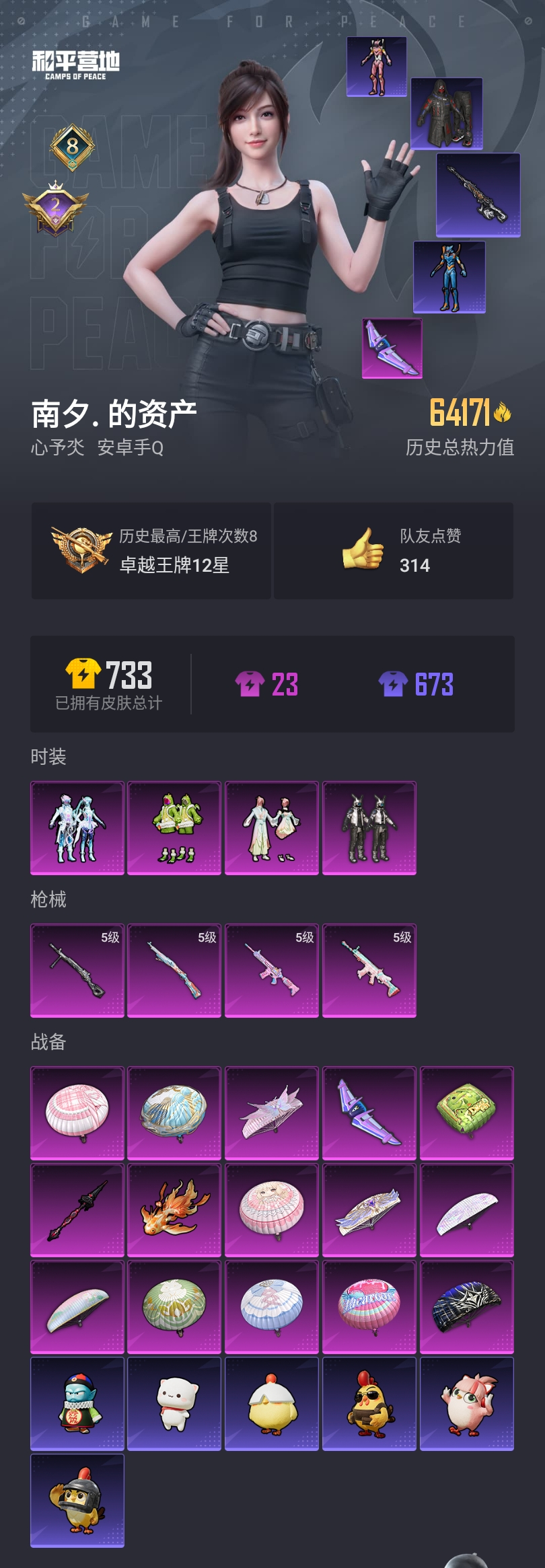 【和平精英】【lyhp21157】4粉装,4特效呛,0载具,历史最高段位:卓越王牌12星 王牌印记8次 热力值:64171,133套装,194呛械,258装备,128战备;套装:套装-数码大师,套装-恐龙拽拽,套装-莲影清波,套装-幻彩电音,套装-红色运动,套装-黄色运动,套装-黑色伏地魔,套装-骑行爱好者,套装-竞技名士,套装-深蓝色名流,套装-酒红色名流,套装-长空猛禽,套装-蓝色守护者,套装-海岛探路者,套装-旭日情侣,套装-冷焰舞者,套装-灼焰舞者,套装-特战装甲,套装-甜蜜告白,套装-春日漫步,套装-滨海假日,套装-完美偶像,套装-怒火燎原,套装-魅力单车,套装-破晓战魂,套装-极地朋克,套装-摩艾涂鸦,套装-幻世战舞者,套装-奇趣章鱼,套装-奇异狩猎者,套装-滨海厨神,套装-龙魂突击队,套装-冰川特警,套装-元素星魂,套装-幻影公爵,套装-格斗先锋,套装-麻辣教官,套装-破蛋小黄鸡,套装-舞夜骑士,套装-机械征服者,套装-红酒骑士,套装-霓虹街区,套装-智慧之神,套装-萌黄之夏,套装-神秘舞者,套装-丝绸行者,套装-白糯汤圆,套装-青龙圣者,套装-朱雀圣者,套装-白虎圣者,套装-逆风勇士,套装-战术大师,套装-ss18特训,套装-耀粉歌者,套装-飞行日记,套装-ss13特训,套装-曼妙人鱼,套装-热情海星,套装-纯真浪花,套装-吉莉礼服,套装-暴风机械师,套装-瑞龙福将,套装-团圆交子,套装-虎虎生威吉莉,套装-ss19特训,套装-ss21特训,套装-玉兔迎春,套装-ss22特训,套装-ss23特训,套装-王牌教练,套装-柠萌假日,套装-日照花林,套装-花园小羊咩,套装-龟仙人,套装-ss25特训,套装-金戈铁马,套装-惊鸿侠骨,套装-锦衣飞扬,套装-云霞荷露,套装-晨曦薄雾,套装-龙的传人,套装-冰河战士,套装-ss26特训,套装-快闪甜心,套装-春光漫游,套装-空岛之星,套装-无暇誓言,套装-明鸳圣池,角色-星际旅行,套装-贝斯之夜,套装-焰鹰斗篷,套装-幽夜迷踪,套装-幻羽潜行,套装-ss27特训,套装-恋语绒绒,套装-老实芭蕉,套装-ss28特训,角色-蝶吟花词,角色-湖雨初晴,套装-alan walker电音教主,套装-铁血战翼,套装-奶油梦幻熊,角色-冰公主,角色-8号机,角色-mark.06,套装-海盐绵绵冰,套装-蝶变,套装-ss29特训,套装-雏菊兔兔,套装-萝兰蝴蝶,套装-异域银装,套装-星途旅人,套装-ss30特训,套装-绒宝小鹅,套装-ss31特训,套装-鱼渊荷华,套装-燕燕于飞,套装-智谋强哥,套装-ss33特训,套装-云朵鹅,套装-巳巳如意,套装-ss32特训,套装-彩虹兔,套装-顶瓜瓜,套装-雪绒豹,套装-大橘大利,套装-霓虹热舞,套装-蜜露汐语,套装-元气之梦,套装-ss34特训,套装-游乐,套装-薄荷星砂,套装-ss35特训;呛皮:蜜獾-天降萌叽,蜜獾-精灵梦叶罗丽,蜜獾-乌木金纹,akm-百万伏特,akm-破晓战魂,akm-涂鸦街区,akm-龙的传人,akm-江南烟雨,akm-乌木金纹,5级scar-l-锦绣绵绵,scar-l-红色方程式,scar-l-炫彩节奏,scar-l-玉兔迎春,scar-l-星途旅人,scar-l-海盐豹豹,ac-val-乌木金纹,ac-val-闲梦青缨,ac-val-快闪甜心,ac-val-兔兔小魔女,m762-牛气冲天,m762-瑞龙福将,m762-天降萌叽,m762-萌物绒绒,m762-雏菊兔兔,m762-云朵鹅,mk47-乌木金纹,mk47-炫光之旅,groza-马卡龙,groza-异彩先驱,groza-绯红回忆,groza-奶油梦幻熊,groza-海盐豹豹,m16a4-蓝色火焰,m16a4-快乐主宰,m16a4-幻世战舞者,m16a4-莲影清波,m16a4-冰河战士,m16a4-天使羽翼,famas-突变脉冲,famas-乌木金纹,5级m416-电玩时刻,m416-蓝色火焰,m416-红色方程式,m416-神秘黑猫,m416-糯团青竹,g36c-乌木金纹,aug-耀粉歌者,aug-闲梦青缨,aug-异域银装,q-原初圣火,q-纯真浪花,5级kar98k-巳巳如意,kar98k-古堡领主,kar98k-彩虹符号,kar98k-炫彩节奏,kar98k-六号树人,kar98k-乌木金纹,awm-天降萌叽,awm-圣堂之誓,awm-焰鹰斗篷,awm-纯真浪花,awm-乌木金纹,amr-墨龙九天,amr-乌木金纹,m24-治愈之星,m24-乌木金纹,m200-惊鸿侠骨,m200-乌木金纹,win94-机械英豪,win94-瑞龙福将,svd-云朵鹅,莫辛纳甘-乌木金纹,mk20-h-快闪甜心,mk20-h-乌木金纹,slr-四圣焕新,slr-璀璨流光,sks-时空追击者,sks-糯团青竹,mini14-梦幻火箭,mini14-原初圣火,mini14-马卡龙,mini14-耀粉歌者,mini14-雏菊兔兔,vss-彩虹符号,mk14-乌木金纹,mk14-冰河战士,m417-惊鸿侠骨,m417-幻影飞狐,野牛-机械英豪,野牛-奶油梦幻熊,野牛-雏菊兔兔,野牛-燕燕于飞,野牛-乌木金纹,ump45-蓝色火焰,ump45-繁龙极客,ump45-海盐豹豹,ump45-绒宝小鹅,vect-生命誓言,vect-音爆索尼克,vect-焰鹰斗篷,vect-燕燕于飞,p90-倾城蜜语,p90-快闪甜心,p90-玩趣呆呆,p90-巳巳如意,p90-乌木金纹,汤姆逊-耀粉歌者,汤姆逊-炫彩节奏,汤姆逊-天降萌叽,汤姆逊-纯真浪花,汤姆逊-乌木金纹,uzi-幻影战神,uzi-古堡领主,uzi-众神之王,uzi-冰河战士,uzi-啾咪啾咪,aks-74u-鸡智如我,aks-74u-乌木金纹,mp5k-众神之王,mp5k-乌木金纹,aa12-g-萌物绒绒,aa12-g-纯真浪花,s1897-百万伏特,s1897-精灵梦叶罗丽,s1897-糯团青竹,s1897-荧海星豚,spas-12-天使羽翼,spas-12-燕燕于飞,spas-12-云朵鹅,spas-12-乌木金纹,s12k-瑞龙福将,s12k-幻世战舞者,dbs-时空追击者,dbs-圣堂之誓,dbs-焰鹰斗篷,dbs-绊爱,dbs-乌木金纹,s686-红色方程式,s686-生命誓言,s686-巳巳如意,mg3-瑞龙福将,mg3-乌木金纹,mg3-惊鸿侠骨,mg3-霓彩脉冲,m249-破晓战魂,m249-古堡领主,m249-彩虹符号,m249-糯团青竹,m249-莲影清波,5级dp-28-豹影疾电,dp-28-原初圣火,dp-28-焰鹰斗篷,dp-28-alan walker潮音版,pkm-蜜语绒猫,pkm-啾咪啾咪,pkm-小狗蛇点点,r45-幻彩电音,r1895-雏菊兔兔,p92-尼罗河传说,蝎式手呛-闲梦青缨,蝎式手呛-奶油梦幻熊,蝎式手呛-燕燕于飞,p18c-黄金龙骨,p18c-原初圣火,p18c-镜光幻境,tmp-9-霓虹漫游,tmp-9-