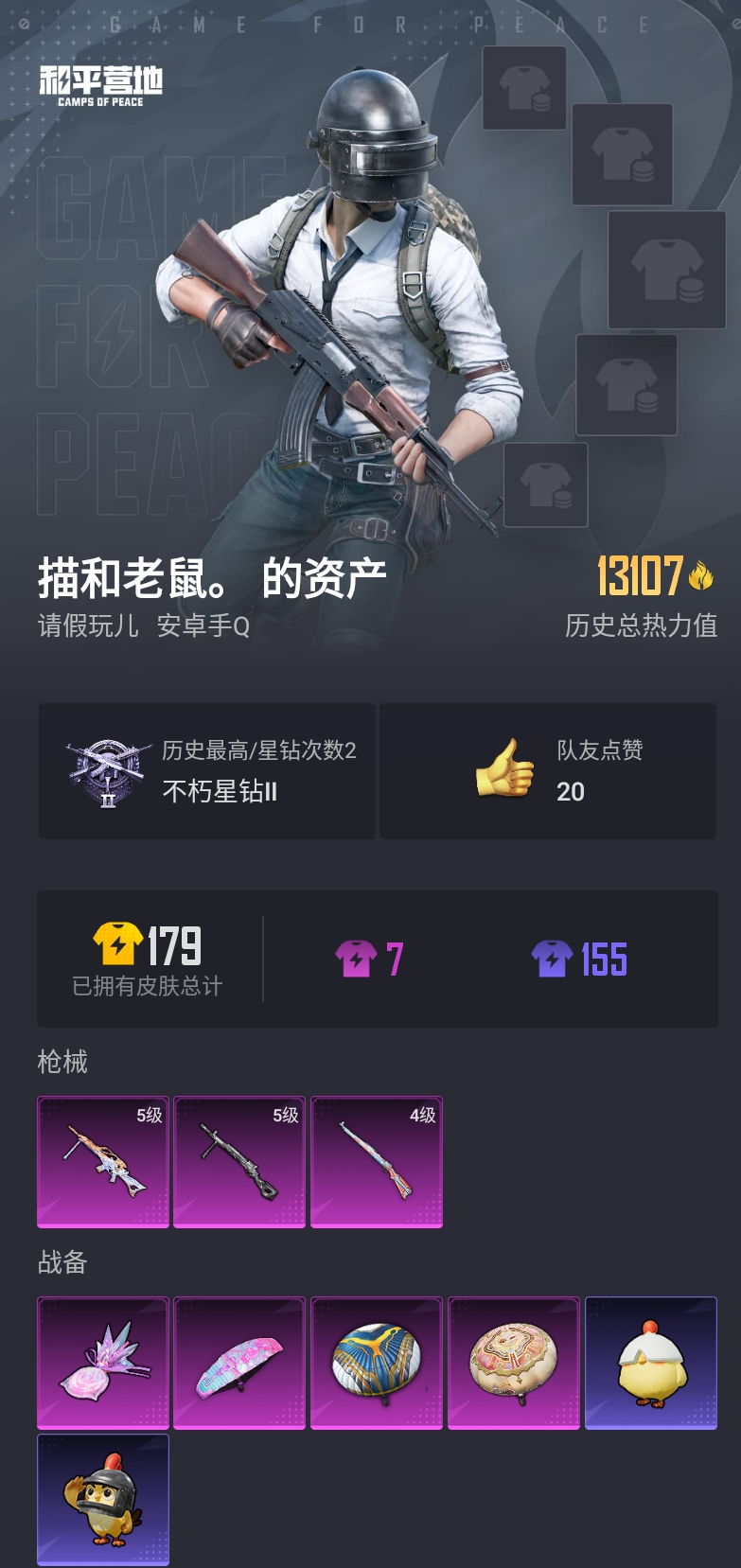 【和平精英】【lyhp21219】0粉装,3特效呛,0载具,历史最高段位:不朽星钻ⅱ 王牌印记-2次 热力值:13107,19套装,66呛械,55装备,29战备;套装:套装-海岛探路者,套装-幻影武者,套装-破蛋小黄鸡,套装-白糯汤圆,角色-英勇保护者,套装-异域银装,套装-紫幽梦,套装-青翼流星,套装-蓝冰羽,套装-顶瓜瓜,套装-大橘大利,套装-炫彩糖果,套装-元气之梦,套装-ss34特训,套装-薄荷星砂,套装-ss35特训,套装-粉黛兰香,套装-ss36特训,套装-萌鸡速递;呛皮:蜜獾-绯穹魔姬,蜜獾-乌木金纹,akm-涂鸦街区,akm-霓彩脉冲,akm-绿洲时空,mk47-洛神天依,ace32-冰晶雪宝,scar-l-红色方程式,scar-l-夜灯,scar-l-彩虹符号,scar-l-玉兔迎春,aug-异域银装,aug-紫晶流影,famas-霓彩脉冲,famas-乌木金纹,m762-天降萌叽,m416-蓝色火焰,m416-红色方程式,m16a4-蓝色火焰,m16a4-红色方程式,4级kar98k-巳巳如意,kar98k-红色方程式,win94-乌木金纹,amr-鸡智如我,awm-天降萌叽,svd-霓彩脉冲,mk20-h-狂鲨锋刃,mini14-耀粉歌者,mini14-绯穹魔姬,mini14-鸡智如我,mk14-紫幽梦,mk14-薄荷星砂,mk14-紫晶流影,slr-霓彩脉冲,mk12-乌木金纹,uzi-红色方程式,uzi-炫彩糖果,ump45-夜灯,ump45-蓝色火焰,ump45-海盐豹豹,ump45-绿洲时空,aks-74u-鸡智如我,aks-74u-乌木金纹,s12k-夜灯,s12k-霓彩脉冲,spas-12-狂鲨锋刃,s1897-紫幽梦,s1897-糯团青竹,mg3-幻世战舞者,mg3-霓彩脉冲,5级mg-36-沧焰双生,mg-36-薄荷星砂,pkm-紫幽梦,5级dp-28-豹影疾电,m249-彩虹符号,m249-糯团青竹,短管霰弹-星穹咏叹调,p92-紫幽梦,平底锅-光之冒险,平底锅-紫幽梦,盐雾蛋-冰氧夏日,十子怒-异瞳寒姬,十子怒-异域银装,破片手留单-海盐豹豹,破片手留单-拽到爆炸,铝热弹-炫彩糖果;降落伞:炫彩糖果飞行器,异域银装飞行器,鸡智如我飞行器; 详情看图3特效呛
