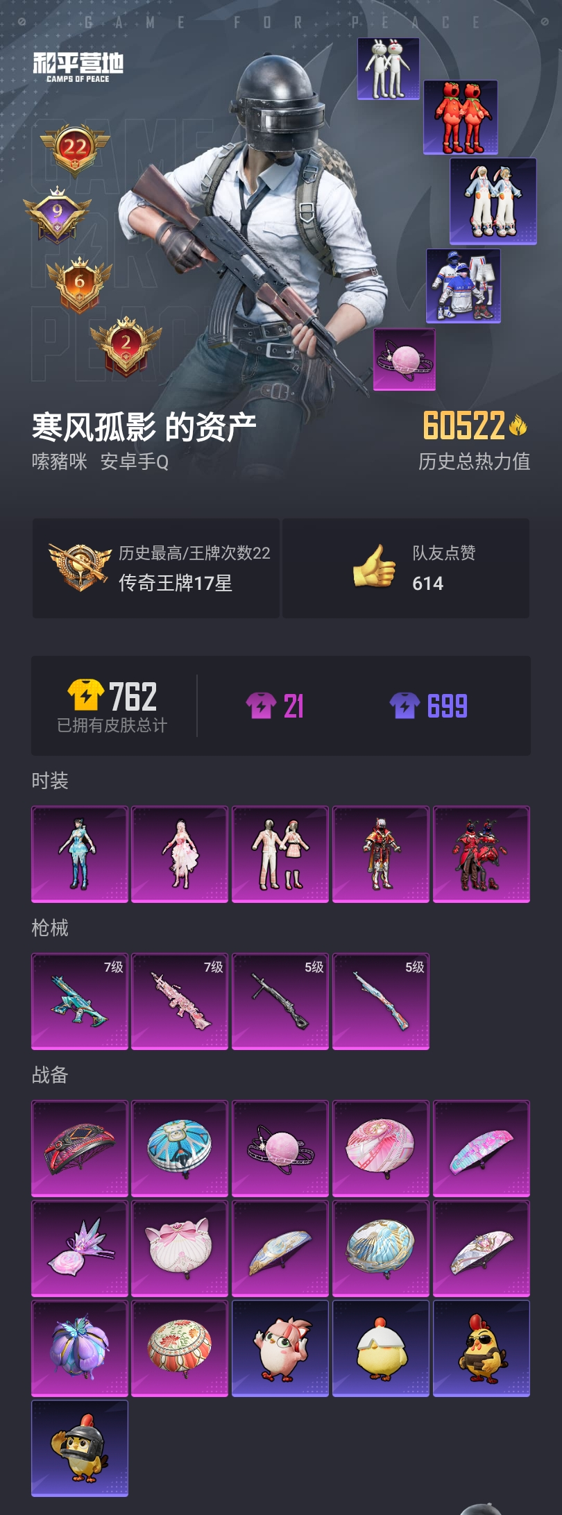 【和平精英】【lyhp19258】22印记 2绝世 5粉装4特效呛 番茄 兔兔白日梦 天命 第五大道 5粉装,4特效呛,0载具,历史最高段位:传奇王牌17星 王牌印记22次 热力值:60522,172套装,189呛械,229装备,155战备;套装:套装-星点战士,套装-桀骜红莲,套装-第五大道,角色-异瞳寒姬,角色-绝对恒星,套装-特训学院,套装-猎鹰,套装-青年教官,套装-橘黑制服,套装-红色运动,套装-黄色运动,套装-蓝色运动,套装-黄色伏地魔,套装-白色伏地魔,套装-黑色伏地魔,套装-竞技名士,套装-深蓝色名流,套装-酒红色名流,套装-湖蓝色名流,套装-黄色名流,套装-猛禽,套装-野性山猫,套装-长空猛禽,套装-竞技勇士朋克,套装-海岛探路者,套装-旭日情侣,套装-六六大吉,套装-冷焰舞者,套装-灼焰舞者,套装-浪漫天命,套装-特战装甲,套装-战地菁英,套装-贵族骑装,套装-战地督导,套装-特殊使命,套装-滨海假日,套装-完美偶像,套装-人气偶像,套装-幻影武者,套装-街头潮人,套装-蓝彩潮人,套装-魅力单车,套装-绮丽涂鸦,套装-竞技达人朋克,套装-破晓战魂,套装-幻世保卫者,套装-森林游猎者,套装-都市魅力,套装-沙漠兵团,套装-丛林猎人,套装-传奇侦探,套装-幻世战舞者,套装-暗影哥特,套装-甜蜜熊情侣,套装-青涩时光,套装-缤纷果语,套装-龙魂突击队,套装-元素星魂,套装-极速红龙,套装-格斗先锋,套装-冷血极客,套装-海上生明月,套装-破蛋小黄鸡,套装-北国孤狼,套装-ss6特训,套装-云纹魔法士,套装-跃动心情,套装-ss7特训,套装-黑色刀锋,套装-核芯基因,套装-精神漫游,套装-霓虹街区,套装-ss10特训,套装-潮萌小黄鸭,套装-ss8特训,套装-萌黄之夏,套装-超能拳王,套装-动感兔斯基人偶服,套装-夏日音浪,套装-ss9特训,套装-探宝勇士,套装-牛气满满,套装-白糯汤圆,套装-ss11特训,套装-诡面顽熊,套装-青春冒险家,套装-潮流游乐家,套装-静谧青瓷,套装-萌趣颜团子,套装-特种颜团子,套装-战术大师,套装-ss12特训,套装-牛气冲天,套装-ss18特训,套装-镭射皇者,套装-银白舞王,套装-耀粉歌者,套装-飞行日记,套装-ss13特训,套装-ss14特训,套装-吉莉礼服,套装-快乐星愿,套装-星梦畅游,套装-ss15特训,套装-ss16特训,套装-暴风机械师,套装-时空追击者,套装-ss17特训,套装-瑞龙福将,套装-团圆交子,套装-福星高照,套装-虎虎生威吉莉,套装-空投萌叽,套装-ss19特训,套装-兔兔白日梦,套装-炫蓝之夏,套装-ss20特训,套装-ss21特训,套装-红熊茄茄,套装-光之冒险,套装-绯格组合,套装-莱茵河畔,套装-王牌教练,套装-柠萌假日,套装-ss25特训,套装-香桃花海,套装-龙的传人,套装-冰河战士,套装-ss26特训,套装-漫游都市,套装-空岛之星,套装-云魄琉璃,套装-ss27特训,套装-恋语绒绒,套装-老实芭蕉,套装-ss28特训,套装-街头风暴,套装-海盐绵绵冰,套装-蝶变,套装-ss29特训,角色-绯色魅影,角色-紫俏灵猫,套装-异域银装,套装-星途旅人,套装-ss30特训,套装-ss31特训,套装-智谋强哥,套装-ss33特训,套装-巳巳如意,套装-ss32特训,套装-顶瓜瓜,套装-狂鲨锋刃,套装-大橘大利,套装-极速光影,套装-炫彩糖果,套装-元气之梦,套装-ss34特训,套装-擎苍青焰,套装-朱霞炽焰,套装-凌霄紫焰,套装-薄荷星砂,套装-ss35特训,套装-午间小调,套装-秘语星愿,套装-风迹短诗,套装-粉黛兰香,角色-超感刻度,角色-甜心蒙太奇,套装-ss36特训,套装-雪国风尚,套装-超能元气,套装-萌鸡速递;呛皮:scar-l-红色方程式,scar-l-黄金龙骨,scar-l-夜灯,scar-l-炫彩节奏,scar-l-星途旅人,scar-l-海盐豹豹,7级蜜獾-异瞳寒姬,蜜獾-天降萌叽,蜜獾-风迹短诗,蜜獾-乌木金纹,mk47-百万伏特,mk47-青春冒险家,mk47-乌木金纹,mk47-风迹短诗,groza-黑色刀锋,groza-彩虹符号,groza-海盐豹豹,groza-乌木金纹,q-乌木金纹,akm-灼热熔岩,akm-破晓战魂,akm-霓虹街区,akm-夜灯,akm-涂鸦街区,akm-阿狸红,akm-星之彼岸,akm-彩虹符号,akm-萌趣颜团子,akm-虎虎生威,akm-龙的传人,akm-霓彩脉冲,m16a4-蓝色火焰,m16a4-红色方程式,m16a4-快乐主宰,m16a4-幻世战舞者,aug-耀粉歌者,aug-青春冒险家,aug-异域银装,aug-绝对恒星,aug-冰晶雪宝,aug-紫晶流影,famas-霓彩脉冲,famas-乌木金纹,ac-val-乌木金纹,ac-val-闲梦青缨,m762-牛气冲天,m762-镭射皇者,m762-瑞龙福将,m762-第五大道,m762-天降萌叽,g36c-时空追击者,g36c-乌木金纹,arx-凌霄紫焰,m416-蓝色火焰,m416-红色方程式,m416-糯团青竹,5级kar98k-巳巳如意,kar98k-红色方程式,kar98k-深海曼妙,kar98k-彩虹符号,kar98k-蓝莓炮弹,kar98k-顶峰精英,kar98k-乌木金纹,m200-乌木金纹,m24-炫彩节奏,m24-天降萌叽,m24-乌木金纹,win94-瑞龙福将,win94-乌木金纹,莫辛纳甘-乌木金纹,莫辛纳甘-风迹短诗,awm-乌木金纹,amr-乌木金纹,sks-夜灯,sks-浪客战士,sks-炫彩节奏,sks-时空追击者,vss-黑色刀锋,vss-镭射皇者,vss-星之彼岸,vss-香桃花海,vss-乌木金纹,mk12-风迹短诗,mk12-乌木金纹,qbu-青春冒险家,mini14-金鼠迎春,mini14-炫彩节奏,mini14-耀粉歌者,mini14-香桃花海,slr-霓彩脉冲,mk14-乌木金纹,mk14-冰河战士,mk14-薄荷星砂,mk14-紫晶流影,mk20-h-星途旅人,mk20-h-狂鲨锋刃,mk20-h-乌木金纹,m417-玩趣呆呆,汤姆逊-耀粉歌者,汤姆逊-炫彩节奏,汤姆逊-天降萌叽,汤姆逊-乌木金纹,vect-黑色刀锋,vect-夜灯,vect-彩虹符号,vect-暗夜玫瑰,vect-乌木金纹,ump45-夜灯,ump45-蓝色火焰,ump45-生命誓言,ump45-春暖花开,ump45-时空追击者,ump45-海盐豹豹,uzi-红色方程式,uzi-炫彩节奏,uzi-天降萌叽,uzi-啾咪啾咪,uzi-炫彩糖果,mp5k-乌木金纹,p90-巳巳如意,p90-乌木金纹,野牛-夜灯,野牛