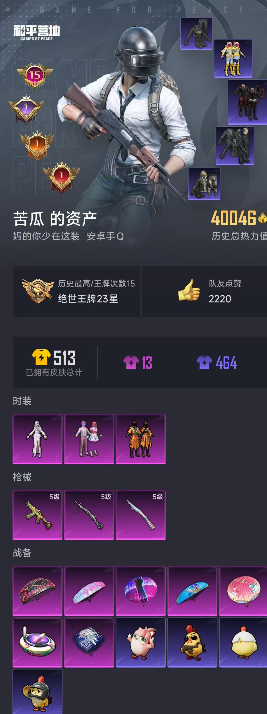 【和平精英】【lyhp21297】3粉装,3特效呛,0载具,历史最高段位:绝世王牌23星 王牌印记15次 热力值:40046,130套装,130呛械,140装备,91战备;套装:套装-天使彩虹糖,套装-鸾凤武仙,角色-冷漠罗丽,套装-特训学院,套装-猎鹰,套装-青年教官,套装-橘黑制服,套装-红色运动,套装-黄色运动,套装-蓝色运动,套装-黄色伏地魔,套装-白色伏地魔,套装-黑色伏地魔,套装-冰川格斗者,套装-竞技名士,套装-深蓝色名流,套装-酒红色名流,套装-湖蓝色名流,套装-黄色名流,套装-猛禽,套装-长空猛禽,套装-漫步者,套装-海岛探路者,套装-旭日情侣,套装-冷焰舞者,套装-灼焰舞者,套装-都市猎人,套装-特战装甲,套装-战地督导,套装-春日漫步,套装-滨海假日,套装-沙漠毒蛇,套装-鹰眼刺客,套装-冰冻风暴,套装-完美偶像,套装-人气偶像,套装-幻影武者,套装-特战英豪,套装-街头潮人,套装-蓝彩潮人,套装-魅力单车,套装-绮丽涂鸦,套装-耀眼新星,套装-竞技达人朋克,套装-破晓战魂,套装-都市魅力,套装-暗影哥特,套装-夏日倾情,套装-缤纷果语,套装-滨海厨神,套装-龙魂突击队,套装-灿烂千阳,套装-元素星魂,套装-极速红龙,套装-冷血极客,套装-麻辣教官,套装-粉红小猪,套装-破蛋小黄鸡,套装-疯狂小兔子,套装-军械专家,套装-精神漫游,套装-鹤鸣,套装-霓虹街区,套装-智慧之神,套装-白熊同盟,套装-夏日音浪,套装-牛气满满,套装-白糯汤圆,套装-战术大师,套装-牛气冲天,套装-ss18特训,套装-耀粉歌者,套装-飞行日记,套装-热情海星,套装-纯真浪花,套装-星梦畅游,套装-ss16特训,套装-ss17特训,套装-瑞龙福将,套装-团圆交子,套装-炫光向阳,套装-福星高照,套装-虎虎生威吉莉,套装-异彩先驱,套装-霓虹极客,套装-空投萌叽,套装-ss19特训,套装-飞驰魅影,套装-音速流光,套装-炫蓝之夏,套装-ss21特训,套装-萌趣咩咩,套装-娇憨猪猪,套装-俏皮奶喵,套装-玉兔迎春,套装-ss22特训,套装-光之冒险,套装-ss23特训,套装-香榭午后,套装-王牌教练,套装-柠萌假日,套装-龟仙人,套装-云魄琉璃,套装-ss27特训,套装-恋语绒绒,套装-ss28特训,角色-拉斐尔,套装-街头风暴,套装-海盐绵绵冰,套装-异域银装,套装-绒宝小鹅,套装-ss31特训,套装-ss33特训,套装-云朵鹅,套装-巳巳如意,套装-ss32特训,套装-彩虹兔,套装-青翼流星,套装-顶瓜瓜,套装-雪绒豹,套装-蜜露汐语,套装-蓝海鲸歌,套装-ss34特训,套装-ss35特训,套装-琴音绮想,套装-画境星梦,套装-书海巡游,角色-月烬之祷,套装-ss37特训,套装-ss36特训;呛皮:蜜獾-娇憨猪猪,蜜獾-垂柳戏鸭,蜜獾-绯穹魔姬,蜜獾-乌木金纹,q-彩虹符号,q-飞驰魅影,q-银碳小老虎,q-纯真浪花,groza-影袭,groza-异彩先驱,akm-影袭,akm-破晓战魂,akm-虎虎生威,akm-恐龙拽拽,m762-瑞龙福将,m762-彩虹甜喵,m762-天降萌叽,m762-云朵鹅,ac-val-天降萌叽,m16a4-蓝色火焰,m16a4-冰河战士,ace32-画境星梦,ace32-冰晶雪宝,m416-夜灯,m416-蓝色火焰,m416-红色方程式,m416-糯团青竹,m416-绿野极光,aug-耀粉歌者,aug-天降萌叽,aug-异域银装,aug-紫晶流影,famas-霓彩脉冲,famas-乌木金纹,scar-l-红色方程式,scar-l-黄金龙骨,scar-l-玉兔迎春,scar-l-星途旅人,scar-l-海盐豹豹,g36c-乌木金纹,mk47-乌木金纹,awm-恐龙拽拽,awm-天降萌叽,awm-纯真浪花,莫辛纳甘-乌木金纹,莫辛纳甘-银碳小老虎,5级kar98k-巳巳如意,kar98k-影袭,kar98k-炫彩节奏,kar98k-飞驰魅影,kar98k-乌木金纹,amr-鸡智如我,win94-瑞龙福将,win94-乌木金纹,m24-影袭,m24-乌木金纹,m200-乌木金纹,svd-云朵鹅,mk20-h-狂鲨锋刃,m1加兰德-画境星梦,vss-星之彼岸,vss-香桃花海,mk14-冰河战士,mk14-薄荷星砂,mini14-异彩先驱,mini14-旋转彩虹,m417-玩趣呆呆,slr-娇憨猪猪,mk12-乌木金纹,sks-炫彩节奏,mp5k-蓝莓炮弹,mp5k-异彩先驱,mp5k-画境星梦,mp5k-乌木金纹,uzi-红色方程式,uzi-影袭,uzi-炫彩节奏,uzi-娇憨猪猪,uzi-天降萌叽,uzi-冰河战士,p90-飞驰魅影,p90-玩趣呆呆,p90-巳巳如意,汤姆逊-异彩先驱,汤姆逊-纯真浪花,汤姆逊-樱桃泡泡,ump45-蓝色火焰,ump45-绿洲时空,5级aks-74u-森灵之息,aks-74u-鸡智如我,aks-74u-乌木金纹,野牛-乌木金纹,vect-音爆索尼克,vect-创世·救赎,s686-红色方程式,spas-12-狂鲨锋刃,spas-12-云朵鹅,spas-12-乌木金纹,s1897-飞驰魅影,dbs-圣堂之誓,dbs-乌木金纹,aa12-g-纯真浪花,aa12-g-画境星梦,s12k-瑞龙福将,s12k-娇憨猪猪,s12k-玩趣呆呆,m249-百万伏特,m249-星之彼岸,m249-糯团青竹,m249-无面战甲,5级dp-28-豹影疾电,dp-28-彩虹符号,pkm-啾咪啾咪,mg-36-薄荷星砂,mg3-瑞龙福将,mg3-乌木金纹,沙墨之鹦-云朵鹅,平底锅-激战未来,平底锅-瑞龙福将,平底锅-异彩先驱,平底锅-飞驰魅影,平底锅-娇憨猪猪,平底锅-纯真浪花,平底锅-画境星梦,大砍刀-云朵鹅,破片手留单-拽到爆炸,十子怒-异瞳寒姬,十子怒-异域银装,盐雾蛋-冰氧夏日,燃烧瓶-福马献瑞;降落伞:太空嘟嘟飞行器,火焰蝠人飞行服,异域银装飞行器,顶峰精英尾迹; 详情看图4w热力值高印记 3粉装3特效呛 冷漠罗丽 都市猎人 暗影哥特 满级aks-74u