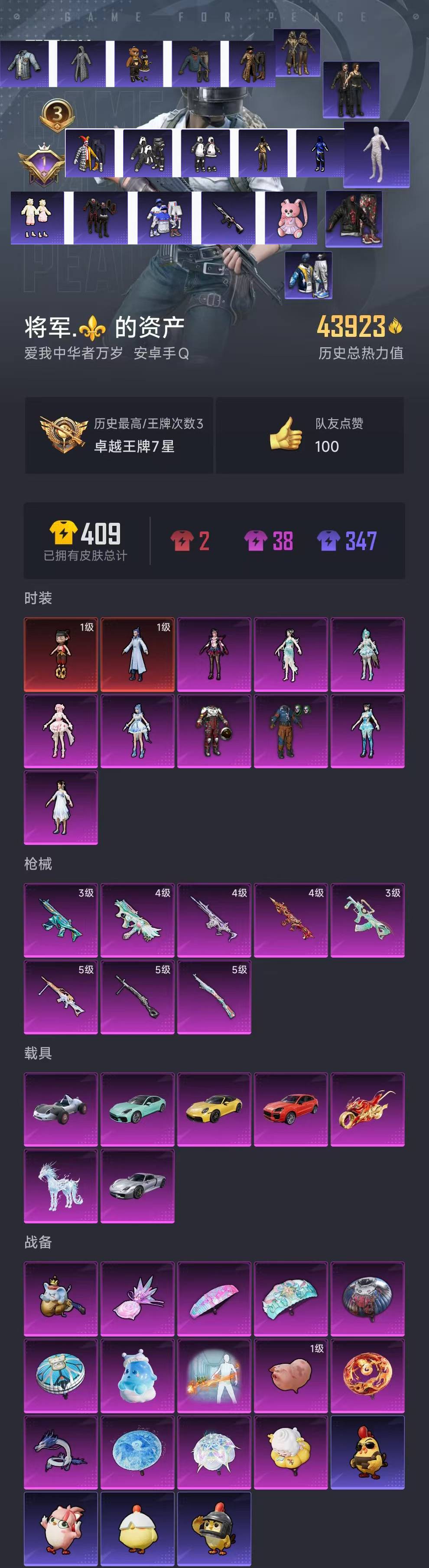 【和平精英】【lyhp21295】9粉装,8特效呛,7载具,历史最高段位:卓越王牌7星 王牌印记3次 热力值:43923,86套装,104呛械,138装备,60战备;套装:魔童闹海-哪吒,魔童闹海-敖丙,套装-星际漫游者,套装-怪诞乔克,女娲后裔-赵灵儿,角色-异瞳寒姬,角色-灵玺,角色-奇迹舞步 美雪,角色-奇迹舞步 美琪,角色-奇迹舞步 雅雅,角色-罪夜之冕,套装-黄色运动,套装-黑色伏地魔,套装-竞技名士,套装-边境牛仔,套装-长空猛禽,套装-海岛探路者,套装-雨林探路者,套装-沙漠探路者,套装-旭日情侣,套装-赤蝎幽灵,套装-西部牛仔,套装-浪漫天命,套装-特战装甲,套装-春日漫步,套装-街头潮人,套装-魅力单车,套装-破晓战魂,套装-幻世保卫者,套装-森林游猎者,套装-暗影哥特,套装-迅捷狂鲨,套装-青涩时光,套装-缤纷果语,套装-太空漫步,套装-星耀竞速,套装-胖达团团,套装-胖达圆圆,套装-极速红龙,套装-沙漠守护者,套装-沙暴袭击者,套装-冥河战士,套装-天网终结者,套装-破蛋小黄鸡,套装-花面小丑,套装-浪漫波比,套装-tianba战队服,套装-战术大师,套装-tt战队服,角色-李,套装-玉兔迎春,套装-糯粉咩咩,套装-王牌教练,套装-漫游都市,套装-云魄琉璃,套装-恋语绒绒,套装-老实芭蕉,角色-绯色魅影,角色-紫俏灵猫,角色-无面战甲,套装-异域银装,套装-智谋强哥,套装-ss33特训,套装-巳巳如意,套装-ss32特训,套装-大橘大利,套装-炫彩糖果,玩偶服-懒羊羊,玩偶服-喜羊羊,玩偶服-美羊羊,套装-元气之梦,套装-ss34特训,套装-擎苍青焰,套装-朱霞炽焰,套装-凌霄紫焰,套装-薄荷星砂,套装-ss35特训,套装-午间小调,套装-秘语星愿,套装-风迹短诗,套装-粉黛兰香,角色-月烬之祷,套装-ss37特训,套装-ss36特训,套装-雪国风尚,套装-萌鸡速递;呛皮:akm-沙漠守护者,akm-涂鸦街区,akm-霓彩脉冲,akm-绿洲时空,m416-蓝色火焰,m416-星际漫游,3级groza-无垠阁,groza-无面战甲,m762-彩虹符号,g36c-星际漫游,4级scar-l-魔童闹海 哪吒,scar-l-红色方程式,scar-l-夜灯,scar-l-彩虹符号,4级arx-无垠阁,arx-凌霄紫焰,3级蜜獾-异瞳寒姬,蜜獾-风迹短诗,蜜獾-冰澜龙吟,蜜獾-乌木金纹,aug-终结者,aug-耀粉歌者,aug-异域银装,aug-冰晶雪宝,aug-紫晶流影,m16a4-星际漫游,m16a4-冥河战士,mk47-风迹短诗,famas-霓彩脉冲,famas-乌木金纹,amr-鸡智如我,amr-喜羊羊与灰太狼,5级kar98k-巳巳如意,awm-天降萌叽,awm-奇迹舞步,awm-绿洲时空,m200-无垠阁,m200-乌木金纹,svd-霓彩脉冲,m24-天降萌叽,莫辛纳甘-风迹短诗,win94-乌木金纹,mini14-星际漫游,slr-沙漠守护者,slr-霓彩脉冲,mk12-风迹短诗,mk12-乌木金纹,mk20-h-狂鲨锋刃,mk20-h-萌派甜兴,mk14-薄荷星砂,mk14-紫晶流影,ump45-夜灯,ump45-星际漫游,ump45-海盐豹豹,4级js9-奇迹舞步,js9-凌霄紫焰,aks-74u-鸡智如我,aks-74u-乌木金纹,uzi-炫彩节奏,uzi-炫彩糖果,s12k-夜灯,s12k-极意拳锋,s12k-霓彩脉冲,spas-12-狂鲨锋刃,dbs-彩虹符号,dbs-风迹短诗,s686-红色方程式,s686-终结者,s1897-糯团青竹,mg3-霓彩脉冲,m249-彩虹符号,m249-无面战甲,5级dp-28-豹影疾电,dp-28-沙漠守护者,dp-28-彩虹符号,5级mg-36-沧焰双生,mg-36-凌霄紫焰,pkm-啾咪啾咪,p92-凌霄紫焰,p1911-无面战甲,信号呛-异瞳寒姬,信号呛-奇迹舞步,短管霰弹-星穹咏叹调,电击呛-喜羊羊与灰太狼,撬棍-冥河战士,撬棍-火尖呛,平底锅-终结者,平底锅-属我最6,平底锅-无垠阁,平底锅-凌霄紫焰,大砍刀-冰澜龙吟,十子怒-异瞳寒姬,十子怒-异域银装,燃烧瓶-福马献瑞,破片手留单-海盐豹豹,破片手留单-拽到爆炸,破片手留单-巳巳如意,破片手留单-火尖莲影,破片手留单-爆破雪人,盐雾蛋-冰氧夏日,盐雾蛋-冰澜龙吟,铝热弹-炫彩糖果,燃点复合弓-火尖莲影,爆炸猎弓-喜羊羊与灰太狼;载具:保时捷918 sper液态银,冰绡玉鳞,踏焰逐风摩托车,保时捷cayenne激情红,保时捷911 敞篷版极速黄,灵鼠银迹,保时捷panamera梦幻青;僚机:集结舱-玉虚云舱;降落伞:炫彩糖果飞行器,极意拳锋飞行器,灵珠游龙飞行器,飞天猪飞行器,粉色滑翔尾迹,异域银装飞行器,狂鲨锋刃飞行器,鸡智如我飞行器,登顶巅峰飞行器,马上有福飞行器;滑翔尾迹:僚机-冰龙团团; 详情看图精品素材号 2红装9粉装8特效呛7载具 1级哪吒 敖丙【怪诞乔克 赵灵儿 木乃伊 沙漠守护者 天网终结者 赤蝎 糯粉咩咩 胖达团团圆圆 战队服 星际m4 粉熊】4级魔童死噶 3级无垠阁狗砸 新款保时捷 玉麒麟