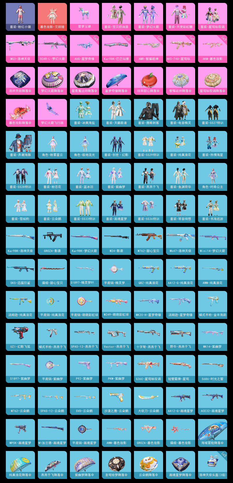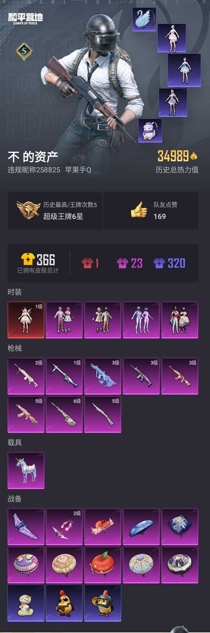【和平精英】【lyhp21349】4粉装,8特效呛,1载具,历史最高段位:超级王牌6星 王牌印记5次 热力值:34989,65套装,102呛械,134装备,51战备;套装:暮色玫影-艾丽娅,套装-宝贝奶油派,套装-天使彩虹糖,套装-梦幻火箭,套装-星穹咏叹调,套装-青年教官,套装-黑色伏地魔,套装-竞技名士,套装-湖蓝色名流,套装-长空猛禽,套装-海岛探路者,套装-旭日情侣,套装-特殊使命,套装-鹰眼刺客,套装-魅力单车,套装-幻世战舞者,套装-弄潮海豚,套装-缤纷果语,套装-滨海厨神,套装-龙魂突击队,套装-元素星魂,套装-粉红小猪,套装-破蛋小黄鸡,套装-战术大师,套装-热情海星,套装-纯真浪花,套装-冰爽海盐,套装-天籁歌者,套装-电音精灵,套装-王牌教练,套装-青玉碎影,套装-龟仙人,套装-香桃花海,套装-冰河战士,套装-ss27特训,套装-老实芭蕉,套装-ss28特训,角色-极地流光,角色-粉雾星云,套装-街头风暴,套装-海盐绵绵冰,套装-蝶变,套装-创世·幻影,套装-ss29特训,套装-异域银装,套装-星途旅人,套装-ss30特训,套装-ss31特训,套装-鱼渊荷华,套装-燕燕于飞,套装-紫幽梦,套装-粉恋花,套装-ss33特训,套装-云朵鹅,套装-ss32特训,套装-青翼流星,套装-蓝冰羽,套装-顶瓜瓜,套装-雪绒豹,角色-时希公主,套装-ss34特训,套装-琴音绮想,套装-画境星梦,套装-书海巡游,套装-ss36特训;呛皮:q-纯真浪花,3级akm-暮色玫影,akm-破晓战魂,akm-荧星灵猫,3级aug-星梦奇缘,aug-天降萌叽,aug-异域银装,3级scar-l-梦幻火箭,scar-l-夜灯,scar-l-星途旅人,scar-l-海盐豹豹,m762-甜心宝贝,m762-天降萌叽,m762-云朵鹅,famas-乌木金纹,蜜獾-天降萌叽,蜜獾-乌木金纹,m16a4-幻世战舞者,m16a4-冰河战士,groza-影袭,groza-暮色玫影,ace32-画境星梦,ace32-冰晶雪宝,mk47-洛神天依,g36c-星穹咏叹调,m416-红色方程式,6级amr-智耀战神,awm-天降萌叽,awm-纯真浪花,awm-暮色玫影,5级kar98k-巳巳如意,kar98k-梦幻火箭,kar98k-洛神天依,m200-乌木金纹,m24-影袭,svd-云朵鹅,莫辛纳甘-乌木金纹,mini14-梦幻火箭,mini14-香桃花海,vss-香桃花海,mk14-冰河战士,mk14-紫幽梦,mk20-h-星梦奇缘,mk20-h-乌木金纹,mk12-乌木金纹,m417-玩趣呆呆,sks-迅猛狂鲨,m1加兰德-画境星梦,5级aks-74u-星穹咏叹调,aks-74u-乌木金纹,p90-玩趣呆呆,汤姆逊-星梦奇缘,汤姆逊-纯真浪花,uzi-炫彩节奏,uzi-天降萌叽,uzi-冰河战士,uzi-幻影飞狐,mp5k-画境星梦,mp5k-乌木金纹,ump45-夜灯,ump45-生命誓言,ump45-海盐豹豹,野牛-燕燕于飞,vect-燕燕于飞,spas-12-燕燕于飞,spas-12-云朵鹅,spas-12-乌木金纹,s12k-玩趣呆呆,s12k-霓彩脉冲,s1897-精灵梦叶罗丽,s1897-紫幽梦,aa12-g-纯真浪花,aa12-g-画境星梦,dbs-乌木金纹,s686-时光之誓,1级mg3-洛神天依,mg3-霓彩脉冲,m249-萌萌彩虹球,mg-36-薄荷星砂,2级m338-回旋牧梦使,dp-28-彩虹符号,pkm-紫幽梦,蝎式手呛-金丰海韵,蝎式手呛-燕燕于飞,p92-紫幽梦,沙墨之鹦-云朵鹅,短管霰弹-星穹咏叹调,平底锅-精灵梦叶罗丽,平底锅-萌萌彩虹球,平底锅-纯真浪花,平底锅-许七安,平底锅-紫幽梦,平底锅-属我最6,平底锅-画境星梦,撬棍-甜心宝贝,撬棍-暮色玫影,撬棍-冰晶雪宝,大砍刀-云朵鹅,破片手留单-星途旅人,破片手留单-海盐豹豹,十子怒-燕燕于飞,十子怒-异域银装;载具:星梦玉骢;降落伞:梦幻火箭飞行器,暮色之舞飞行器,异域银装飞行器,顶峰精英尾迹,破刃行动尾迹; 详情看图3w4热力值精品女号 1红装4粉装8特效呛1载具【1级艾丽娅/3级星梦aug】梦幻火箭 奶油派 彩虹糖 暮色ak 星空马