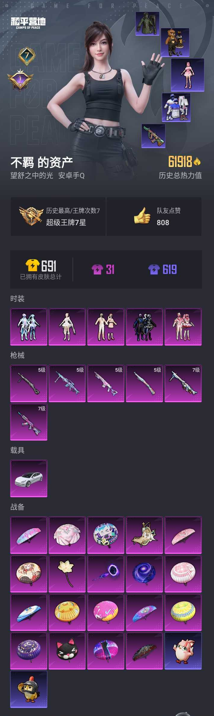 【和平精英】【lyhp21356】5粉装,6特效呛,1载具,历史最高段位:超级王牌7星 王牌印记7次 热力值:61918,139套装,182呛械,232装备,120战备;套装:套装-馨动时刻,套装-暗夜玫瑰,套装-第五大道,角色-千金淑猫,套装-幻彩电音,套装-黑色伏地魔,套装-冰川格斗者,套装-竞技名士,套装-猛禽,套装-长空猛禽,套装-竞技勇士朋克,套装-黎明保卫者,套装-蓝色守护者,套装-海岛探路者,套装-六六大吉,套装-冷焰舞者,套装-浪漫天命,套装-特战装甲,套装-灰色格斗者,套装-甜蜜告白,套装-春日漫步,套装-完美偶像,套装-怒火燎原,套装-狂战萌兔,套装-雪山征服者,套装-坚韧舞者,套装-都市漫游者,套装-酷熊伴侣,套装-风行保卫者,套装-热血青春,套装-丛林猎人,套装-雪山精英,套装-幻世战舞者,套装-呆萌铁蟹,套装-青涩时光,套装-缤纷果语,套装-滨海厨神,套装-龙魂突击队,套装-极速红龙,套装-格斗先锋,套装-海上生明月,套装-恶魔宝贝,套装-破蛋小黄鸡,套装-疯狂小兔子,套装-迷域探索者,套装-ss5特训,套装-圣诞大吉,套装-冰原使者,套装-凛冬战士,套装-红酒骑士,套装-浪漫波比,套装-北国孤狼,套装-ss6特训,套装-跃动心情,套装-ss7特训,套装-黑色刀锋,套装-核芯基因,套装-精神漫游,套装-霓虹街区,套装-ss10特训,套装-潮萌小黄鸭,套装-ss8特训,套装-神秘黑猫,套装-大橘为重,套装-软萌银虎,套装-萌黄之夏,套装-人鱼之吻,套装-ss9特训,套装-风华少年志,套装-白月香洋装,套装-不夜海上花,套装-乘风破浪,套装-牛气满满,套装-白糯汤圆,套装-ss11特训,套装-萌趣颜团子,套装-特种颜团子,套装-战术大师,套装-ss12特训,套装-牛气冲天,套装-耀粉歌者,套装-ss13特训,套装-闪银刀客,套装-ss14特训,套装-吉莉礼服,套装-ss15特训,套装-ss16特训,套装-暗夜魅影,套装-ss17特训,套装-福星高照,套装-空投萌叽,套装-ss20特训,套装-ss22特训,套装-光之冒险,套装-绯格组合,套装-ss23特训,套装-王牌教练,套装-柠萌假日,套装-ss24特训,套装-涂山之恋,套装-ss25特训,套装-绝对偶像,套装-香桃花海,套装-龙的传人,套装-冰河战士,套装-云魄琉璃,套装-恋语绒绒,套装-老实芭蕉,角色-情公主,角色-冰公主,套装-街头风暴,套装-海盐绵绵冰,套装-湖畔霞光,套装-ss29特训,角色-无面战甲,套装-异域银装,角色-都市丽猫,套装-星途旅人,角色-糖霜甜心,套装-ss30特训,套装-青团波波,套装-棉花软糖,套装-糖糖葫芦,套装-ss31特训,套装-紫幽梦,套装-粉恋花,套装-ss33特训,套装-巳巳如意,套装-ss32特训,套装-青翼流星,套装-蓝冰羽,套装-顶瓜瓜,套装-大橘大利,套装-霓虹热舞,套装-ss34特训,套装-薄荷星砂,套装-ss35特训,套装-ss36特训,套装-萌鸡速递;呛皮:蜜獾-天降萌叽,蜜獾-精灵梦叶罗丽,蜜獾-糖糖葫芦,蜜獾-绯穹魔姬,蜜獾-鸡智如我,蜜獾-乌木金纹,ac-val-乌木金纹,ac-val-宇宙意志,m416-夜灯,m416-神秘黑猫,m416-葫芦兄弟,m416-糯团青竹,m416-乌木金纹,q-神秘黑猫,q-彩虹符号,q-乌木金纹,scar-l-炫彩节奏,scar-l-星途旅人,scar-l-海盐豹豹,scar-l-冷漠罗丽,g36c-不夜海上花,g36c-乌木金纹,groza-生命誓言,groza-春暖花开,groza-黑色刀锋,groza-彩虹符号,groza-海盐豹豹,groza-无面战甲,groza-乌木金纹,m16a4-蓝色火焰,m16a4-幻世战舞者,m16a4-冰河战士,aug-凝视深渊,aug-耀粉歌者,aug-怪笑疯兔,aug-异域银装,aug-乌木金纹,7级akm-炫紫旋律,akm-灼热熔岩,akm-四圣焕新,akm-彩虹符号,akm-萌趣颜团子,akm-环太平洋,akm-霓彩脉冲,m762-乘风破浪,m762-牛气冲天,m762-天降萌叽,m762-乌木金纹,ace32-冰晶雪宝,famas-霓彩脉冲,famas-乌木金纹,m24-冰封烈焰,m24-幻彩电音,m200-宇宙意志,m200-乌木金纹,win94-夏日绵绵冰,win94-乌木金纹,5级kar98k-巳巳如意,kar98k-彩虹符号,kar98k-顶峰精英,kar98k-乌木金纹,awm-不夜海上花,awm-天降萌叽,5级mk14-甜梦熊击,mk14-乌木金纹,mk14-冰河战士,mk14-紫幽梦,mk14-紫晶流影,mk20-h-星途旅人,mk20-h-糖糖葫芦,mk20-h-狂鲨锋刃,mk20-h-乌木金纹,vss-华贵君王,vss-黑色刀锋,vss-星之彼岸,vss-香桃花海,vss-乌木金纹,sks-夜灯,sks-折纸暴龙,sks-勇闯险境,sks-心之恋语,sks-炫彩节奏,slr-四圣焕新,slr-金丰海韵,slr-霓彩脉冲,qbu-不夜海上花,mini14-炫彩节奏,mini14-星夜魔法师,mini14-涂山之恋,mini14-香桃花海,m417-玩趣呆呆,mk12-乌木金纹,uzi-红色方程式,uzi-金风玉露,uzi-炫彩节奏,uzi-墨染幽兰,uzi-冰河战士,uzi-炫彩糖果,野牛-夜灯,野牛-乌木金纹,mp5k-飒粉甜心,vect-黑色刀锋,vect-pel轰鸣竞梦者,vect-彩虹符号,vect-乌木金纹,汤姆逊-勇闯险境,汤姆逊-耀粉歌者,汤姆逊-天降萌叽,汤姆逊-乌木金纹,p90-巳巳如意,p90-乌木金纹,ump45-生命誓言,ump45-狮舞迎春,ump45-仲夏莫吉托,ump45-海盐豹豹,ump45-糖糖葫芦,aks-74u-鸡智如我,s686-生命誓言,s686-冰封烈焰,s686-不夜海上花,s686-彩虹符号,s686-巳巳如意,s12k-幻世战舞者,s12k-玩趣呆呆,s12k-乌木金纹,dbs-彩虹符号,dbs-幻彩电音,dbs-幽焰骑士,dbs-乌木金纹,s1897-百万伏特,s1897-勇闯险境,s1897-神秘黑猫,s1897-精灵梦叶罗丽,s1897-紫幽梦,s1897-糯团青竹,s1897-乌木金纹,spas-12-狂鲨锋刃,spas-12-乌木金纹,5级dp-28-豹影疾电,dp-28-彩虹符号,dp-28-乌木金纹,5级mg-36-幻彩电音,mg-36-薄荷星砂,pkm-蜜语绒猫,pkm-啾咪啾咪,pkm-紫幽梦,7级mg3-洛神天依,mg3-幻世战舞者,mg3-乌木金纹,mg3-霓彩脉冲,m249-古堡领主,m249-无面战甲,m249-乌木金纹,r45-拳皇·狂花道,r45-幻彩电音,蝎式手呛-闲梦青缨,p92-紫幽梦,p1911-冰封烈焰,p1911-无面战甲,p18c-糖糖葫芦,平底锅-冰封烈焰,平底锅-黑色刀锋,平