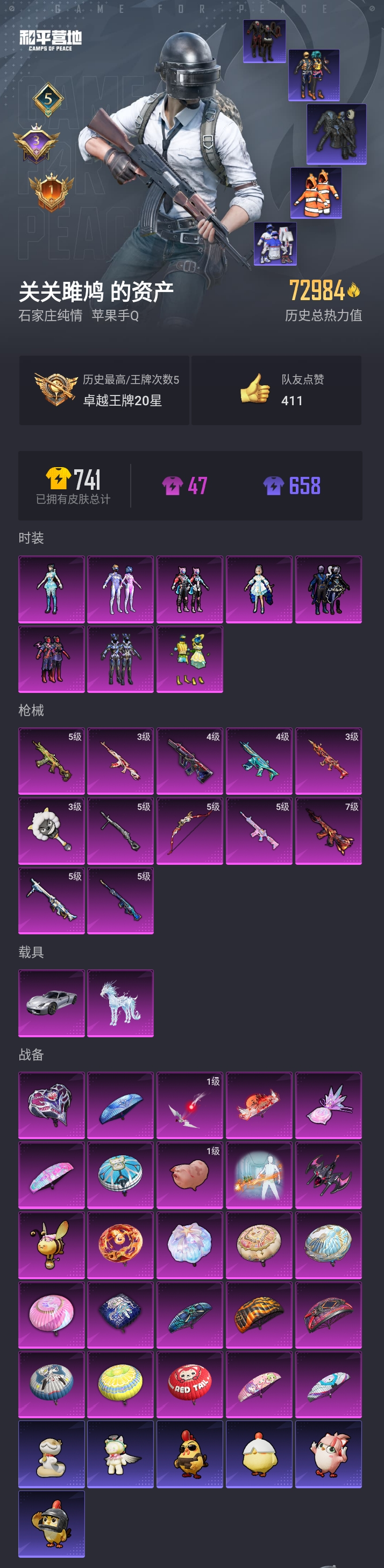 【和平精英】【lyhp21361】8粉装,12特效呛,2载具,历史最高段位:卓越王牌20星 王牌印记5次 热力值:72984,142套装,211呛械,264装备,102战备;套装:套装-梦幻火箭,套装-苍蓝魅影,套装-香水柠檬,角色-洛天依,套装-星之彼岸,套装-暗夜玫瑰,角色-异瞳寒姬,套装-幻影飞狐,套装-蓝色运动,套装-白色伏地魔,套装-骑行爱好者,套装-竞技名士,套装-长空猛禽,套装-漫步者,套装-蓝色守护者,套装-都市猎人,套装-浪漫天命,套装-特战装甲,套装-贵族骑装,套装-灰色格斗者,套装-甜蜜告白,套装-迎春赐吉,套装-潮流先锋,套装-龙腾端午,套装-滨海假日,套装-鹰眼刺客,套装-冰冻风暴,套装-千禧之恋,套装-神秘领域,套装-怒火燎原,套装-耀眼新星,套装-竞技达人朋克,套装-破晓战魂,套装-风行保卫者,套装-幻世战舞者,套装-奇异狩猎者,套装-暗影哥特,套装-弄潮海豚,套装-迅捷狂鲨,套装-深海小丑鱼,套装-甜蜜熊情侣,套装-青涩时光,套装-冰川特警,套装-海上生明月,套装-小丑鱼,套装-破蛋小黄鸡,套装-军械专家,套装-北国孤狼,套装-鹤鸣,套装-智慧之神,套装-萌黄之夏,套装-薄荷蓝莓,套装-牛气满满,套装-韶华初心,套装-ss11特训,套装-玄武圣者,套装-朱雀圣者,套装-诡谋托雷基亚,套装-骁骑迪迦,套装-原初圣火,套装-逆风勇士,套装-萌趣颜团子,套装-特种颜团子,套装-战术大师,套装-ss12特训,套装-牛气冲天,套装-ss18特训,套装-镭射皇者,套装-银白舞王,套装-耀粉歌者,套装-治愈之星,套装-科技之星,套装-飞行日记,套装-ss13特训,套装-梦起落英,套装-冰爽海盐,套装-ss14特训,套装-天籁歌者,套装-电音精灵,套装-吉莉礼服,套装-快乐星愿,套装-星梦畅游,套装-蝎王蛇后,套装-鹤发童颜,套装-ss15特训,套装-暗夜魅影,套装-暗夜傀儡,套装-ss17特训,套装-瑞龙福将,套装-团圆交子,套装-冰爽风暴,套装-福星高照,套装-虎虎生威吉莉,套装-霓虹极客,套装-ss20特训,套装-甜心亚梦,套装-虚音幻奏,套装-ss21特训,套装-ss22特训,套装-绯格组合,套装-ss23特训,套装-莱茵河畔,套装-王牌教练,套装-柠萌假日,套装-ss25特训,套装-惊鸿侠骨,套装-锦衣飞扬,套装-ss26特训,套装-老实芭蕉,套装-蝶变,套装-ss29特训,角色-绯色魅影,套装-ss30特训,套装-ss31特训,套装-ss33特训,套装-云朵鹅,套装-ss32特训,套装-青翼流星,套装-雪绒豹,套装-狂鲨锋刃,套装-大橘大利,套装-圣穹绘梦,套装-炫彩糖果,套装-蓝海鲸歌,套装-元气之梦,套装-ss34特训,套装-擎苍青焰,套装-朱霞炽焰,套装-凌霄紫焰,角色-敖闰,套装-薄荷星砂,套装-ss35特训,套装-午间小调,套装-秘语星愿,套装-风迹短诗,套装-琴音绮想,套装-画境星梦,套装-书海巡游,角色-月烬之祷,套装-ss37特训,套装-ss36特训,套装-萌鸡速递;呛皮:3级scar-l-魔童闹海 哪吒,scar-l-红色方程式,scar-l-炫彩节奏,scar-l-龙宫之主,scar-l-暗夜玫瑰,scar-l-彩虹符号,scar-l-玉兔迎春,m16a4-夜灯,m16a4-甜心亚梦,m16a4-幻世战舞者,groza-治愈之星,groza-海盐豹豹,groza-暮色玫影,7级m416-风花雪月,5级m416-电玩时刻,m416-红色方程式,m416-仓鼠灰灰,m416-动感兔斯基,m416-滑板小狐,m416-魔童闹海 敖闰,3级akm-暮色玫影,akm-生命誓言,akm-缤纷海域,akm-霓虹街区,akm-夜灯,akm-四圣焕新,akm-涂鸦街区,akm-星之彼岸,akm-萌趣颜团子,akm-虎虎生威,akm-霓彩脉冲,mk47-百万伏特,mk47-洛神天依,mk47-乌木金纹,mk47-炫光之旅,mk47-风迹短诗,m762-绯红前夜,m762-牛气冲天,m762-镭射皇者,m762-瑞龙福将,m762-云朵鹅,g36c-暗夜玫瑰,g36c-乌木金纹,4级蜜獾-异瞳寒姬,蜜獾-天降萌叽,蜜獾-风迹短诗,蜜獾-乌木金纹,famas-霓彩脉冲,famas-乌木金纹,ace32-画境星梦,ace32-冰晶雪宝,ac-val-甜心亚梦,q-原初圣火,q-赛罗,q-彩虹符号,q-洛神天依,4级aug-星之彼岸,aug-怪笑疯兔,aug-异域银装,aug-冰晶雪宝,arx-凌霄紫焰,m24-影袭,m24-治愈之星,m24-香水柠檬,m24-炫彩节奏,m24-仲夏莫吉托,m24-天降萌叽,amr-喜羊羊与灰太狼,m200-绿野极光,m200-惊鸿侠骨,m200-乌木金纹,awm-不夜海上花,awm-天降萌叽,awm-暮色玫影,awm-乌木金纹,win94-瑞龙福将,win94-乌木金纹,kar98k-红色方程式,kar98k-影袭,kar98k-梦幻火箭,kar98k-终极赛罗,kar98k-彩虹符号,kar98k-洛神天依,莫辛纳甘-乌木金纹,莫辛纳甘-风迹短诗,svd-云朵鹅,5级slr-暗夜玫瑰,slr-四圣焕新,slr-圣穹绘梦,slr-霓彩脉冲,mk12-风迹短诗,mk12-乌木金纹,mini14-金玉无双,mini14-梦幻火箭,mini14-原初圣火,mini14-炫彩节奏,mini14-异彩先驱,mini14-绯穹魔姬,vss-镭射皇者,vss-星之彼岸,vss-绿野极光,mk14-治愈之星,mk14-乌木金纹,mk14-紫晶流影,mk20-h-狂鲨锋刃,mk20-h-乌木金纹,m1加兰德-画境星梦,m417-惊鸿侠骨,m417-幻影飞狐,sks-金玉无双,sks-炫彩节奏,p90-闪光银龙,p90-乌木金纹,uzi-逆行者qq,uzi-炫彩节奏,uzi-烈焰拳霸,uzi-天降萌叽,uzi-炫彩糖果,ump45-夜灯,ump45-诡娃娃,ump45-圣穹绘梦,汤姆逊-奇异狩猎者,汤姆逊-银刃赛罗,汤姆逊-异彩先驱,汤姆逊-环太平洋,汤姆逊-智耀战神,汤姆逊-乌木金纹,vect-生命誓言,vect-彩虹符号,vect-治愈之星,vect-香水柠檬,vect-暗夜玫瑰,5级aks-74u-森灵之息,aks-74u-乌木金纹,野牛-魔童闹海 敖闰,野牛-乌木金纹,mp5k-画境星梦,mp5k-乌木金纹,js9-凌霄紫焰,s12k-香水柠檬,s12k-龙宫之主,s12k-瑞龙福将,s12k-幻世战舞者,s12k-极意拳锋,s12k-霓彩脉冲,dbs-甜心亚梦,dbs-圣堂之誓,dbs-风迹短诗,spas-12-狂鲨锋刃,spas-12-云朵鹅,spas-12-乌木金纹,s1897-镭射皇者,s1897-乌木金纹,aa12-g-画境星梦,s686-生命誓言,5级mg3-洛神天依,mg3-瑞龙福将,mg3-幻世战舞者,mg3-惊鸿侠骨,mg-3
